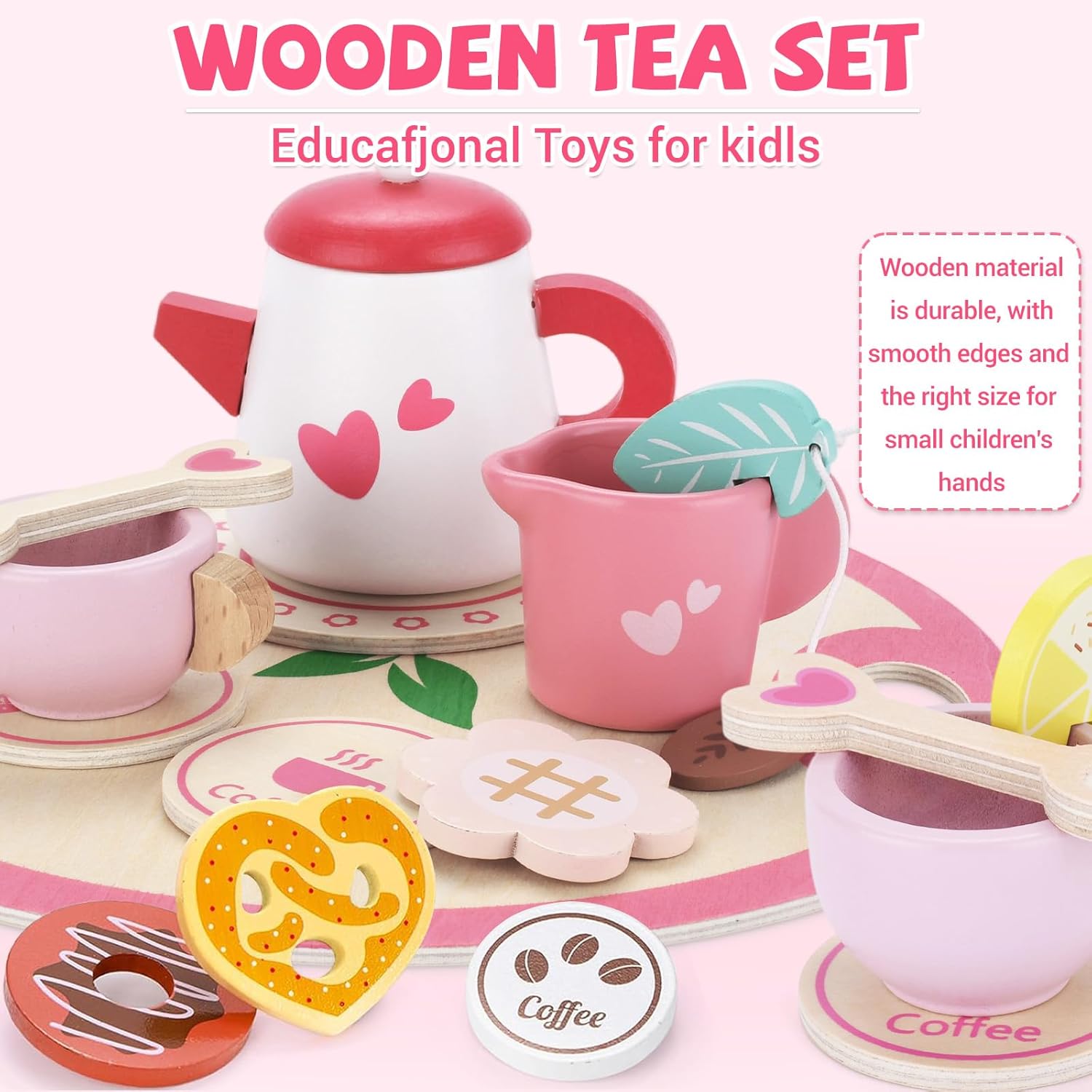 🍰🍰SET DA TÈ IN LEGNO - Contiene: 1 piattino rosa (21,5 cm), 1 teiera rosa a forma di cuore, 2 tazze da tè rosa, 1 tazza da tè grande, 1 piattino, 2 cucchiaini da tè con manico a forma di cuore, 1 fetta di limone, 1 biscotto a forma di fiore, 1 ciambella, 1 biscotto a forma di cuore, 1 biscotto verde, 1 pacchetto di caffè, 1 cioccolata e 1 bustina di tè. Fornisce ai bambini un divertimento di gioco fantasioso senza fine. 🧁🧁SICURO E DUREVOLE - Questo set da tè per bambini in legno è realizzato in legno di alta qualità, robusto e durevole, con una superficie liscia e priva di sbavature ed è verniciato con vernice sicura a base d'acqua. Splendidamente progettato. Riutilizzabile e sicuro da usare. 🍩🍩FANTASTICO GIOCO DI RUOLO IN CUCINA - Questo set da tè per bambini è perfetto per il gioco di ruolo e simula una vera scena del tè pomeridiano. Attività come versare l'acqua e servire il tè promuovono la coordinazione occhio-mano, sviluppano abilità sociali e aiutano i bambini a classificare il cibo e ad apprendere le buone maniere a tavola. ✨✨CREATIVITÀ SENZA LIMITI - Il gioco di ruolo a tempo indeterminato incoraggia i bambini a organizzare tea party, assegnare ruoli e sviluppare le loro abilità linguistiche ed emotive attraverso la narrazione. Abbinata alle bambole o ai membri della famiglia, questa attività interattiva incoraggia la condivisione e la risoluzione dei problemi, gettando le basi per l'educazione della prima infanzia. 🎁🎁IL REGALO IDEALE - Tutte le bambine adorano i giochi di ruolo e questo set di snack per bambini è stato progettato appositamente per loro. Confezione regalo. Perfetto come regalo di compleanno, regalo di cosplay, regalo di Natale, regalo del Ringraziamento, regalo di Pasqua e altre occasioni.
