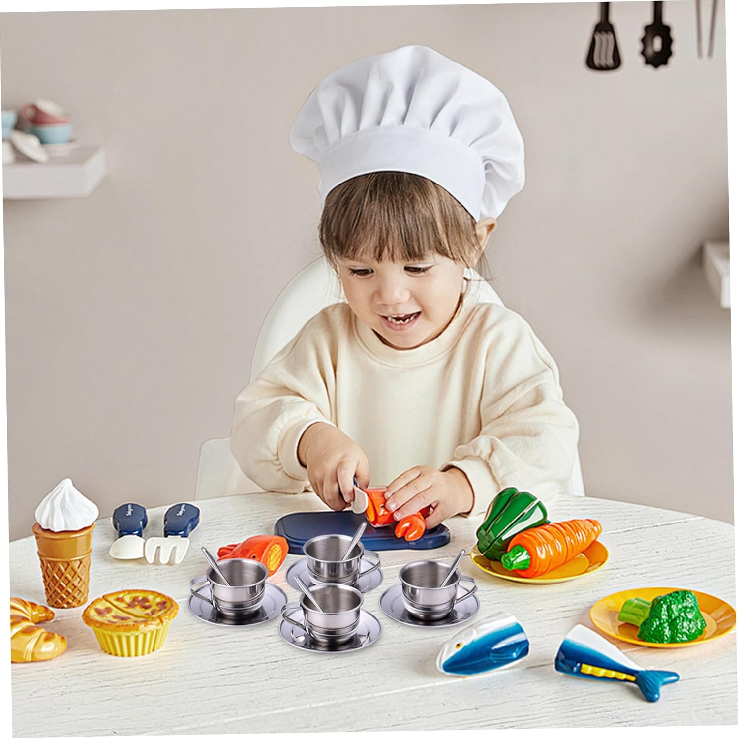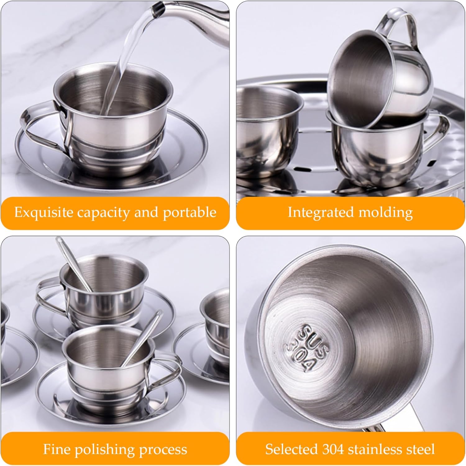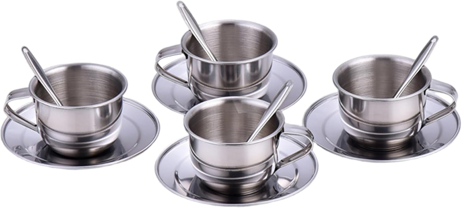 Genere neutro ed elegante: progettato per ragazze e ragazzi, questo elegante set da tè presenta una finitura in acciaio inossidabile senza tempo che completa qualsiasi stanza dei giochi con fascino moderno e inclusività Tazze compatte da 70 ml: Ogni set include quattro tazze da 70 ml, perfettamente dimensionate per le mani dei più piccoli, consentendo impugnature comode e facile manipolazione, promuovendo al tempo stesso il gioco sociale tra i bambini Elementi essenziali del set completo: con quattro tazze, quattro piattini e quattro cucchiai, il set ha tutto ciò di cui hai bisogno per un'esperienza coinvolgente del tea party che incoraggia la condivisione e il gioco di ruolo Design sicuro e resistente al calore: questo Il set da tè per bambini è realizzato in acciaio inossidabile resistente al calore, garantendo un gioco sicuro senza il rischio di ustioni o rotture. Lo rendono ideale per l'immaginazione attiva dei bambini Robusto e facile da pulire: la struttura in acciaio inossidabile garantisce durata e manutenzione senza problemi. La superficie liscia e resistente alla ruggine si pulisce rapidamente per mantenere l'igiene una priorità assoluta