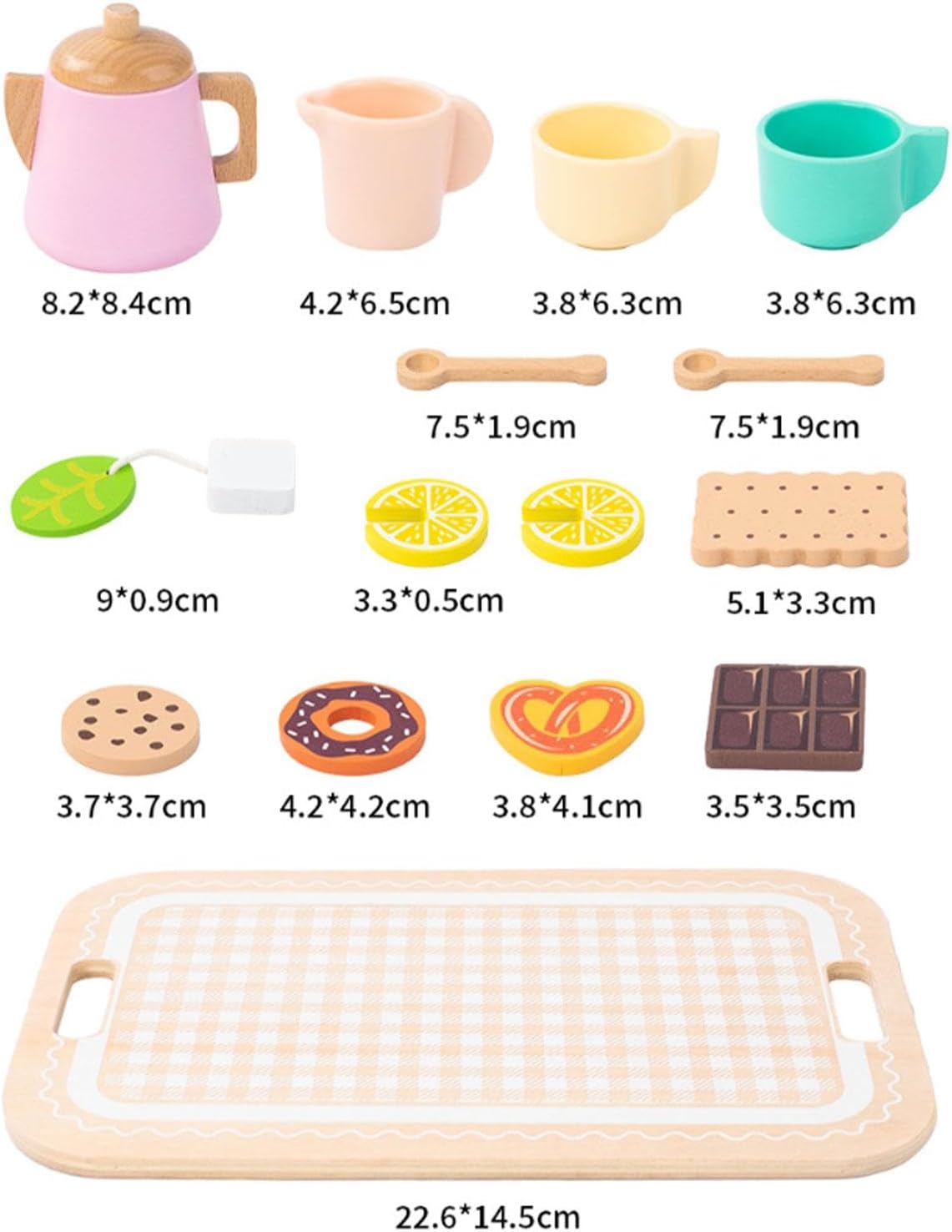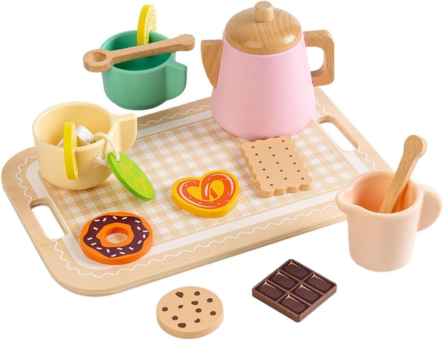 【Legame familiare】: incoraggia l'interazione genitore-figlio condividendo momenti gioiosi di tè pomeridiano, rafforzando le connessioni emotive 【Design】: Caratterizzato da un colore delizioso e da una raffinata lavorazione artigianale, questo set da tè in legno cattura l'attenzione dei bambini, rendendo il gioco più divertente con la sua varietà di accessori da tè 【Set per giochi fantasiosi】: il set per il gioco del tè di finzione include tutto il necessario per un fantastico gioco del tè di finzione, il tutto realizzato con materiali di legno e resina di qualità per un uso prolungato 【Sviluppo delle abilità】: impegnarsi nel gioco di finzione con questo set da tè per bambini piccoli migliora le capacità motorie e la coordinazione occhio-mano dei bambini, favorendo la loro capacità di svolgere compiti in modo indipendente 【Esperienza di gioco interattiva】: questo set di giocattoli in legno per il tè pomeridiano consente ai bambini di godersi simulazioni di vita quotidiana con amici, aiutandoli ad apprendere abilità e conoscenze essenziali per la vita attraverso un gioco fantasioso