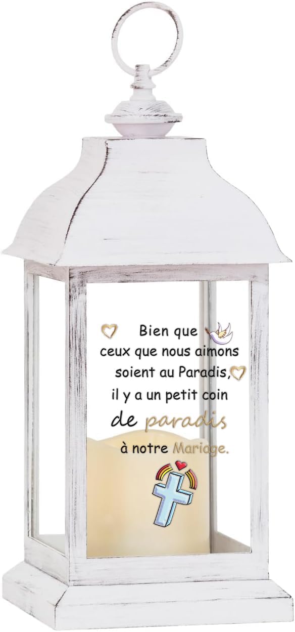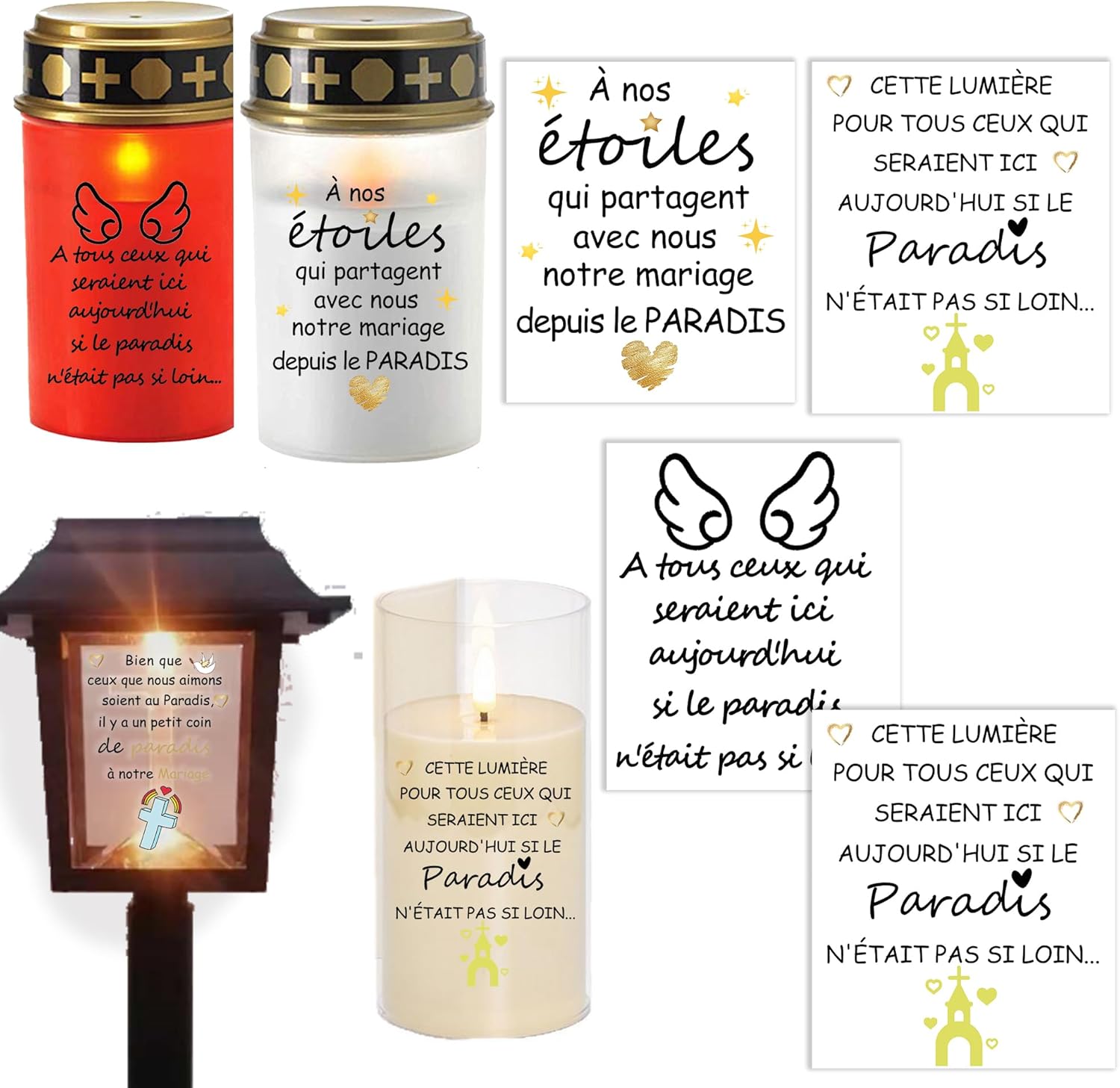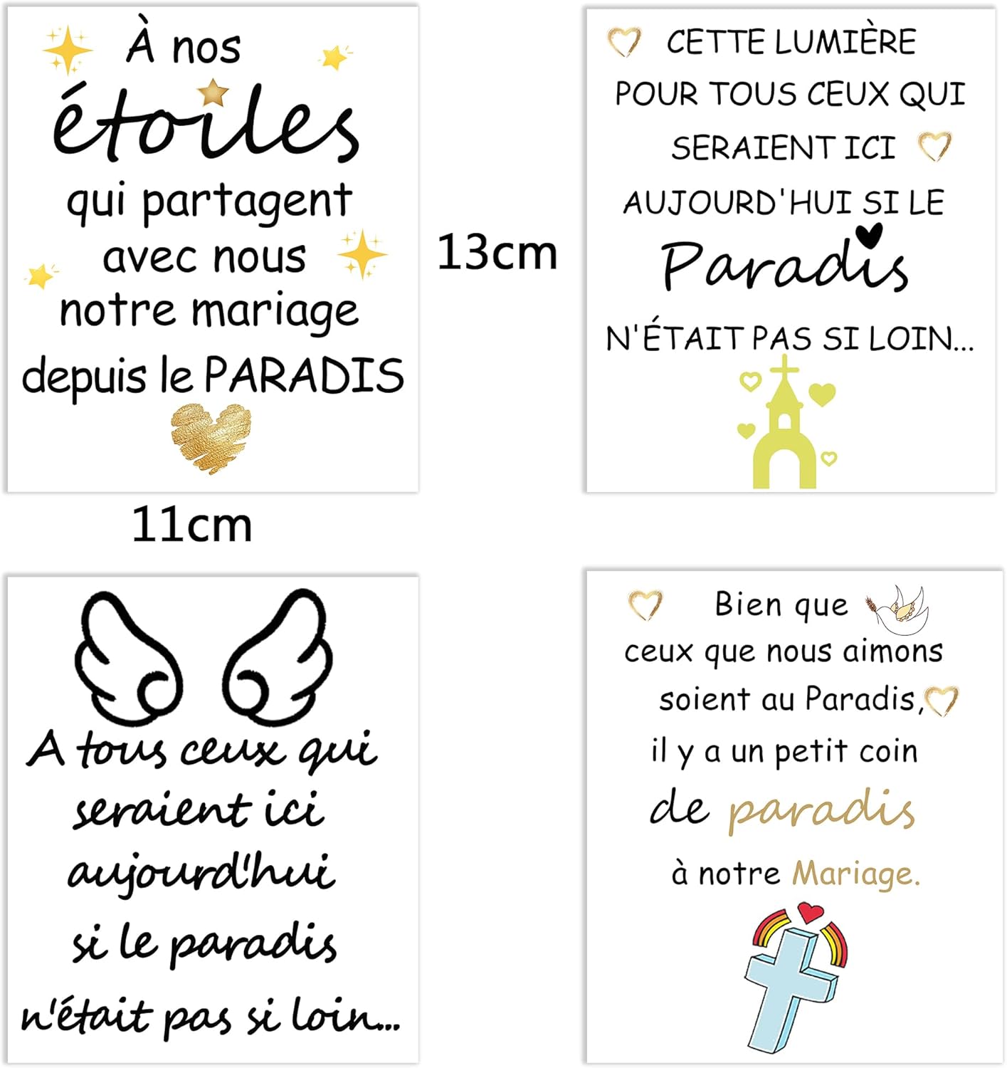 SET COMPLETO: Kit decorativo composto da 4 eleganti adesivi con motivi di ali d'angelo, cuore, croce e messaggi commemorativi per lanterna Design elegante: adesivi in nero e oro creano un'atmosfera solenne e rispettosa, perfetti per le cerimonie nuziali DIMENSIONI PRATICHE: Lanterna da 13 cm di altezza e 11 cm di larghezza, ideale per uso decorativo interno o esterno Facile applicazione: può essere utilizzato su qualsiasi superficie pulita e liscia, come lanterne, candele, vasi, bicchieri e altri elementi decorativi di nozze. PERSONALIZZAZIONE: Messaggi in francese per creare un tributo personale e toccante per i propri cari