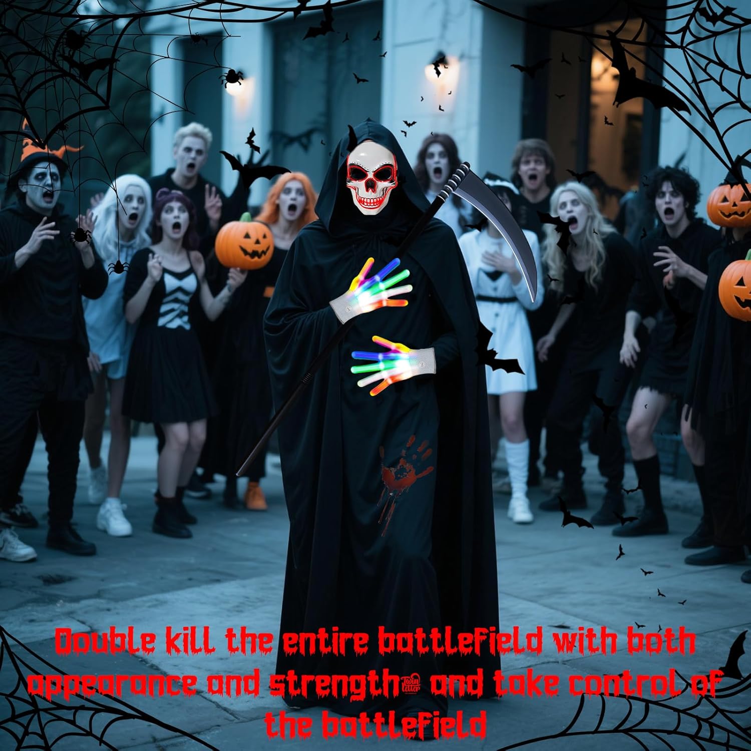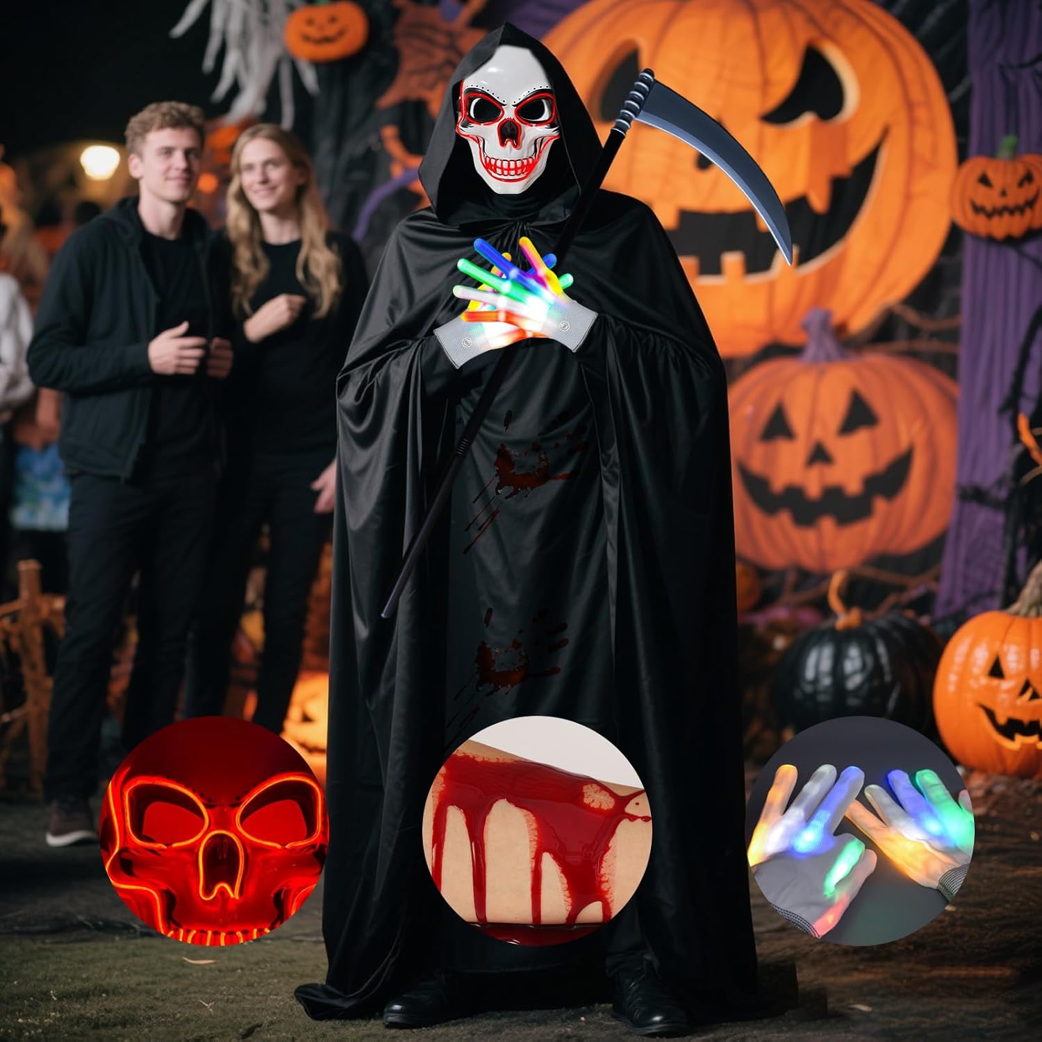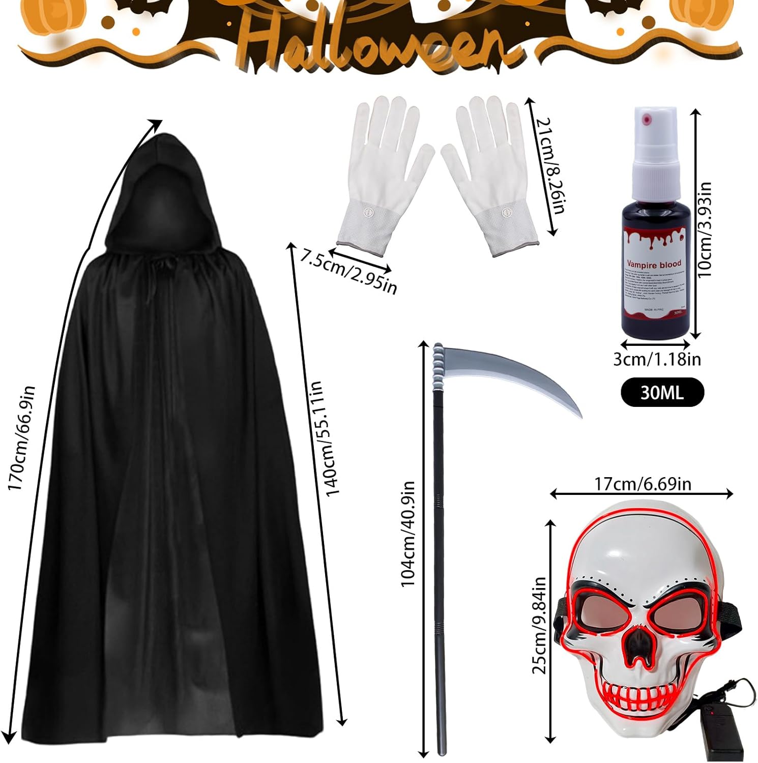 Descrizione del prodotto Set Grim Reaper che include mantello, falce, maschera LED, guanti LED, sangue finto Halloween da 30 ml, costume Halloween Grim Reaper per Halloween, cosplay, carnevale, mascherata Avviso di sicurezza n.