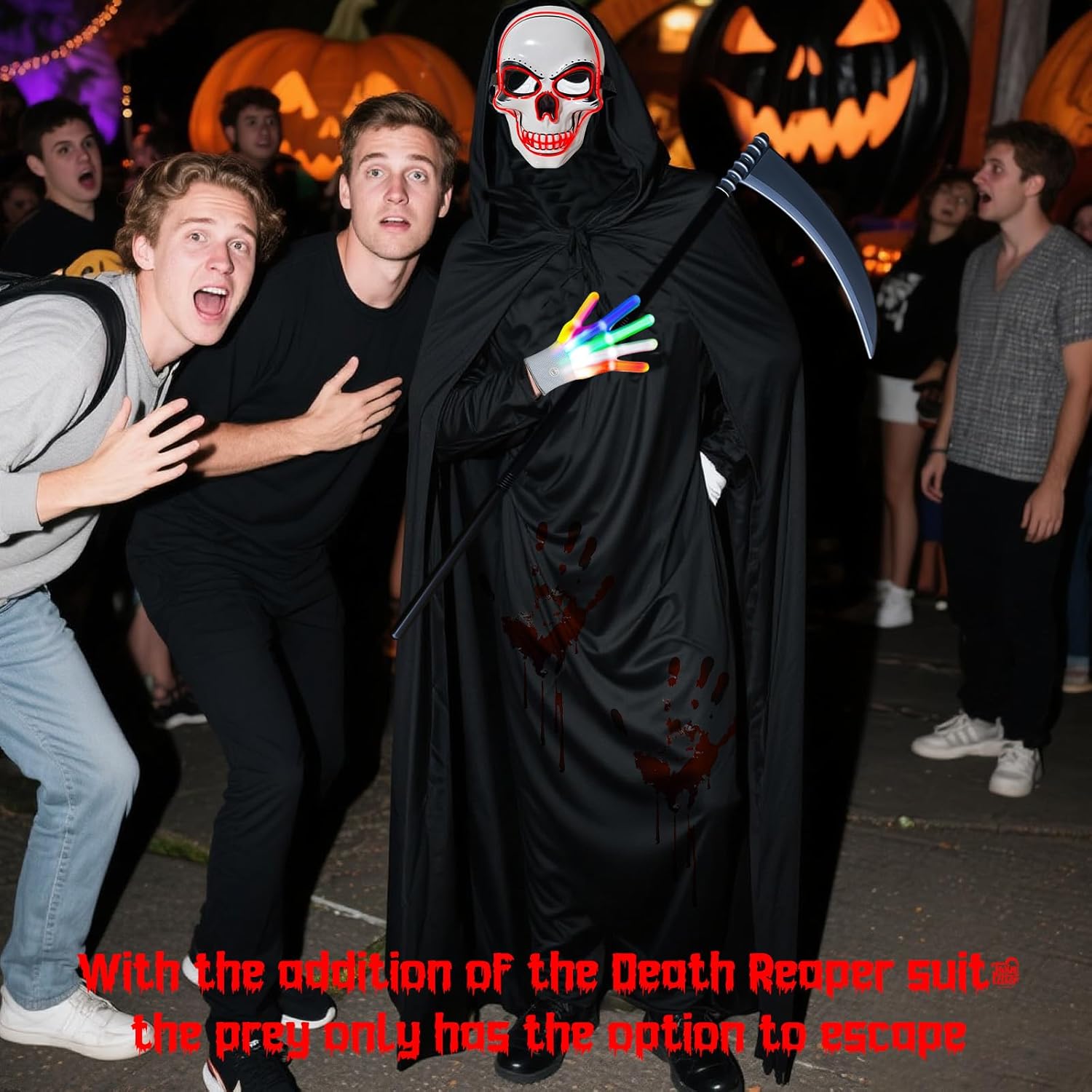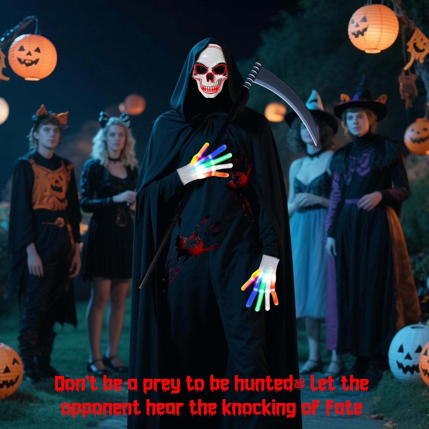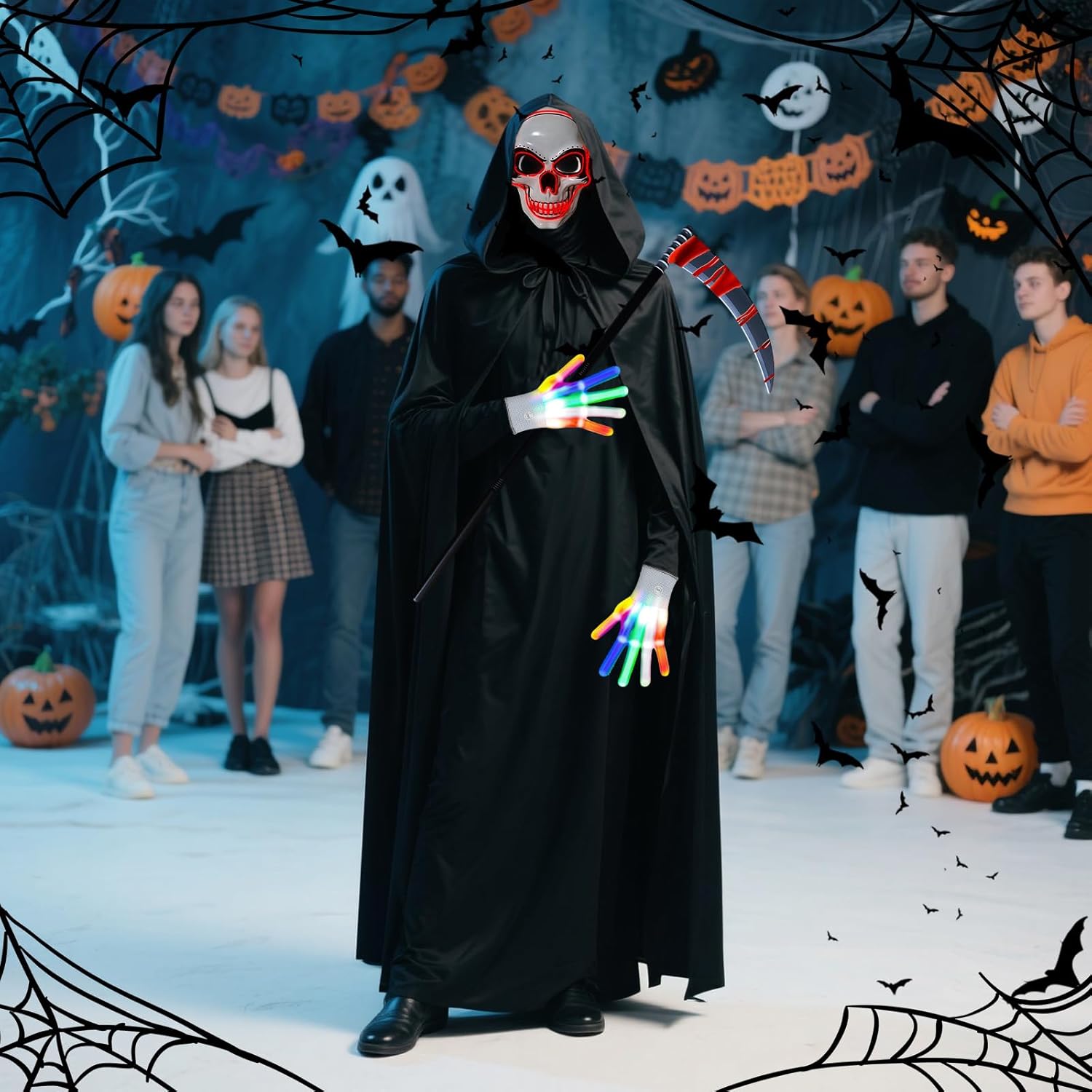 Descrizione del prodotto Set Grim Reaper che include mantello, falce, maschera LED, guanti LED, sangue finto Halloween da 30 ml, costume Halloween Grim Reaper per Halloween, cosplay, carnevale, mascherata Avviso di sicurezza n.