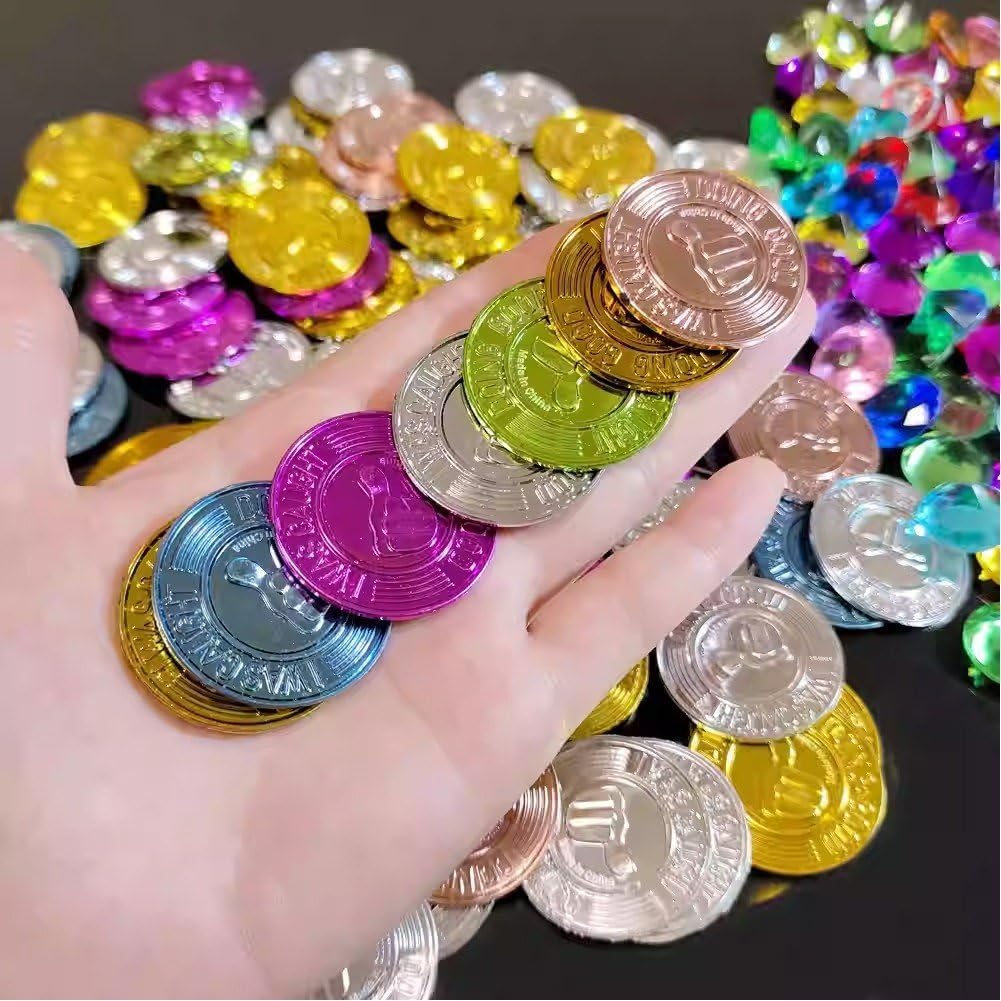 Realizzate in materiale di alta qualità, presentano una superficie in rilievo con il simbolo del forziere del tesoro e una finitura dorata lucida. Non sbiadiscono né si deformano facilmente. Utilizzate queste monete come bomboniere o premi. Queste monete e gioielli a tema pirata possono essere utilizzati per celebrazioni a tema pirata, feste di Natale, feste di compleanno, cacce tesoro, giochi di ruolo sui pirati, oggetti di scena per spettacoli teatrali, carnevale e così via. Queste monete sono perfette per attività di conteggio e caccia tesoro. Puoi anche far giocare i tuoi ospiti a giochi di caccia tesoro con queste fantastiche monete d'oro. Crea una mappa e lascia che trovino il tesoro, regalando ore e ore di divertimento bambini. Riceverai 100 monete per caccia tesoro dei pirati, una quantità sufficiente a soddisfare le tue esigenze quotidiane di decorazione e gioco; queste monete metalliche sono un eccellente tocco realistico per tutti i tuoi giochi di ruolo preferiti. Ogni moneta ha un diametro di circa 3,5 cm, è piccola e facile trasportare, adatta per essere messa nel forziere del tesoro o nella tasca del costume pirata.