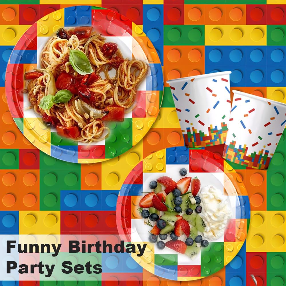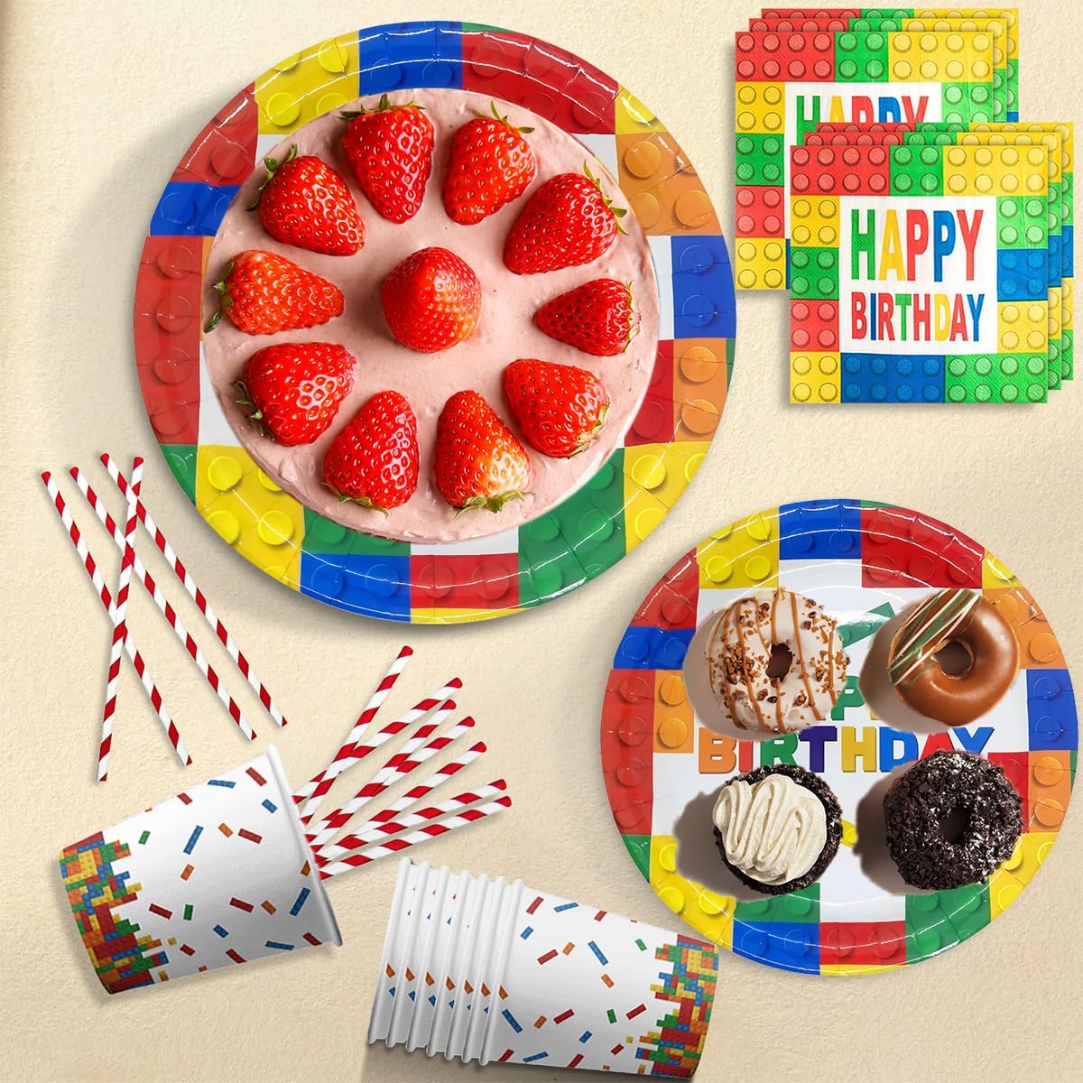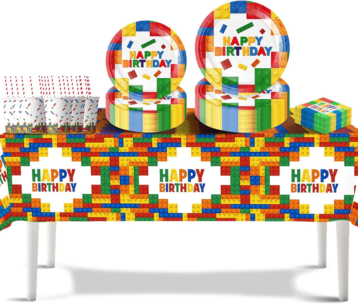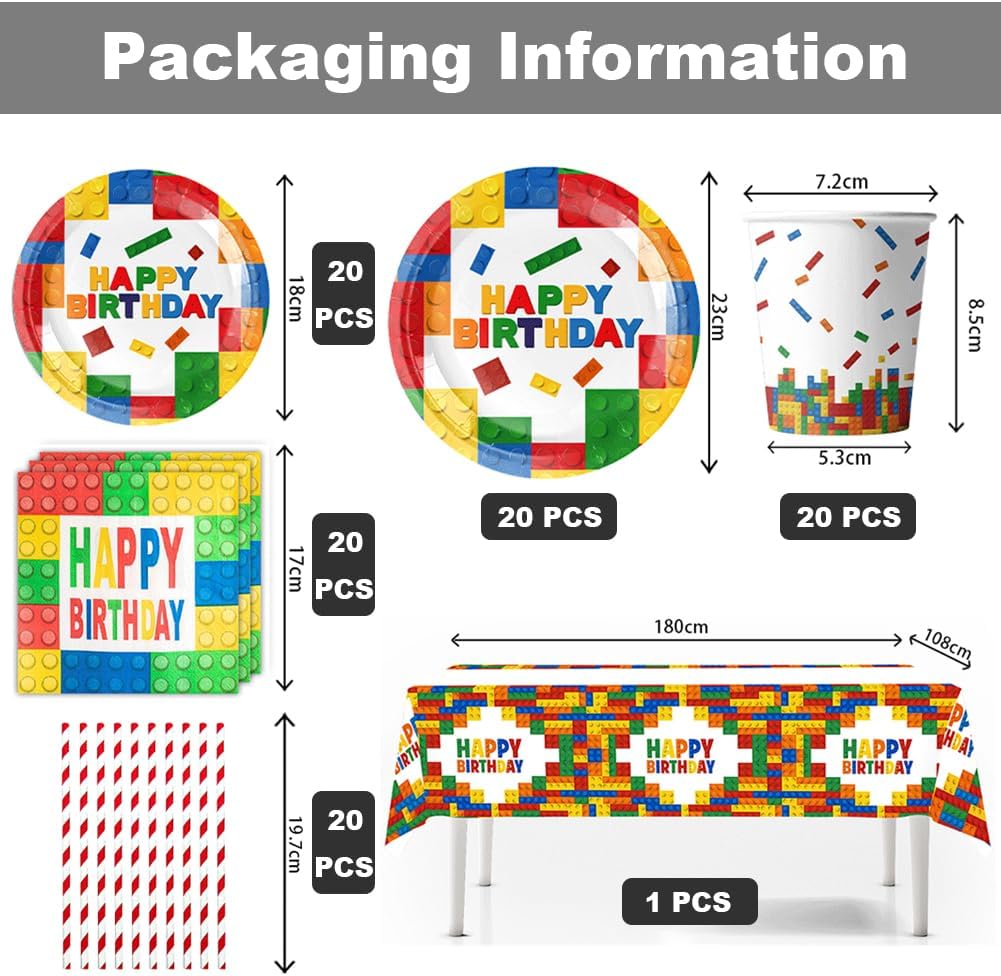 Set di stoviglie per feste di compleanno per 20 ospiti: 20 piatti da 7 pollici, 20 piatti da 9 pollici, 20 tovaglioli, 20 bicchieri di carta, 20 cannucce di carta, 1 tovaglia, 101, per un massimo di 20 ospiti. Questo set di stoviglie per feste aggiungerà più colore, divertimento, carineria e stile. Materiali sicuri: le stoviglie per feste sono realizzate con materiali di alta qualità, che sono sia robusti che ecologici, durevoli e sicuri da usare. Design con mattoncini: questo set di stoviglie per feste con divertenti elementi a blocchi garantisce un'atmosfera divertente e allegra. Aggiunge divertimento e rende la tua festa di compleanno unica e affascinante. Adatto per molte occasioni: questo set di stoviglie è ideale per ogni festa di compleanno e si adatta meglio a feste a tema generale per bambini e adulti. È ideale per l'uso in scuole, uffici, ristoranti, all'aperto o feste di compleanno a casa. Indipendentemente da dove festeggiate, questo set di stoviglie per feste creerà un'atmosfera meravigliosa e renderà il tuo compleanno indimenticabile. Se il prodotto che hai ricevuto ha problemi di qualità o quantità mancante, non esitate a contattarci e lo risolveremo.