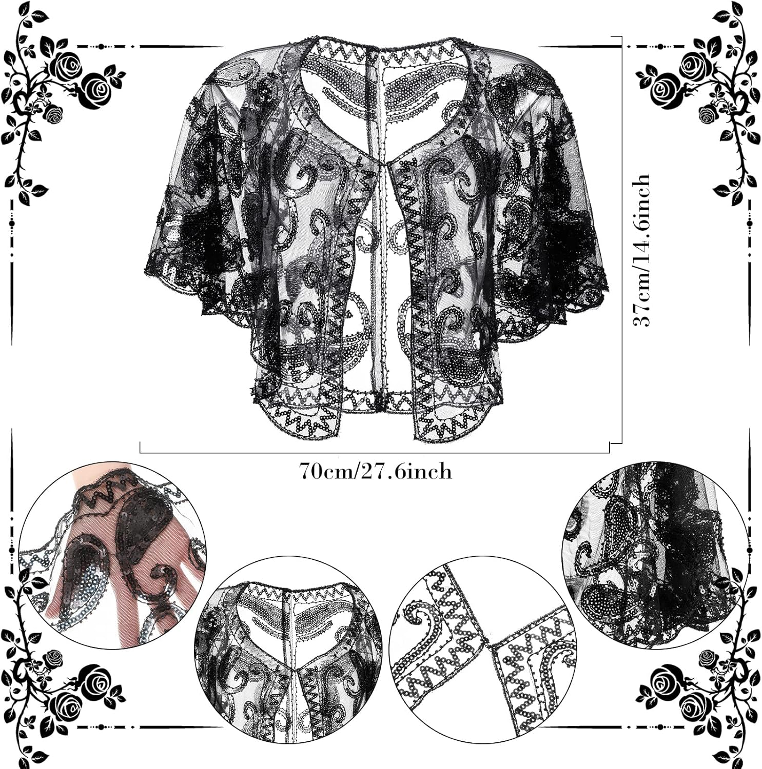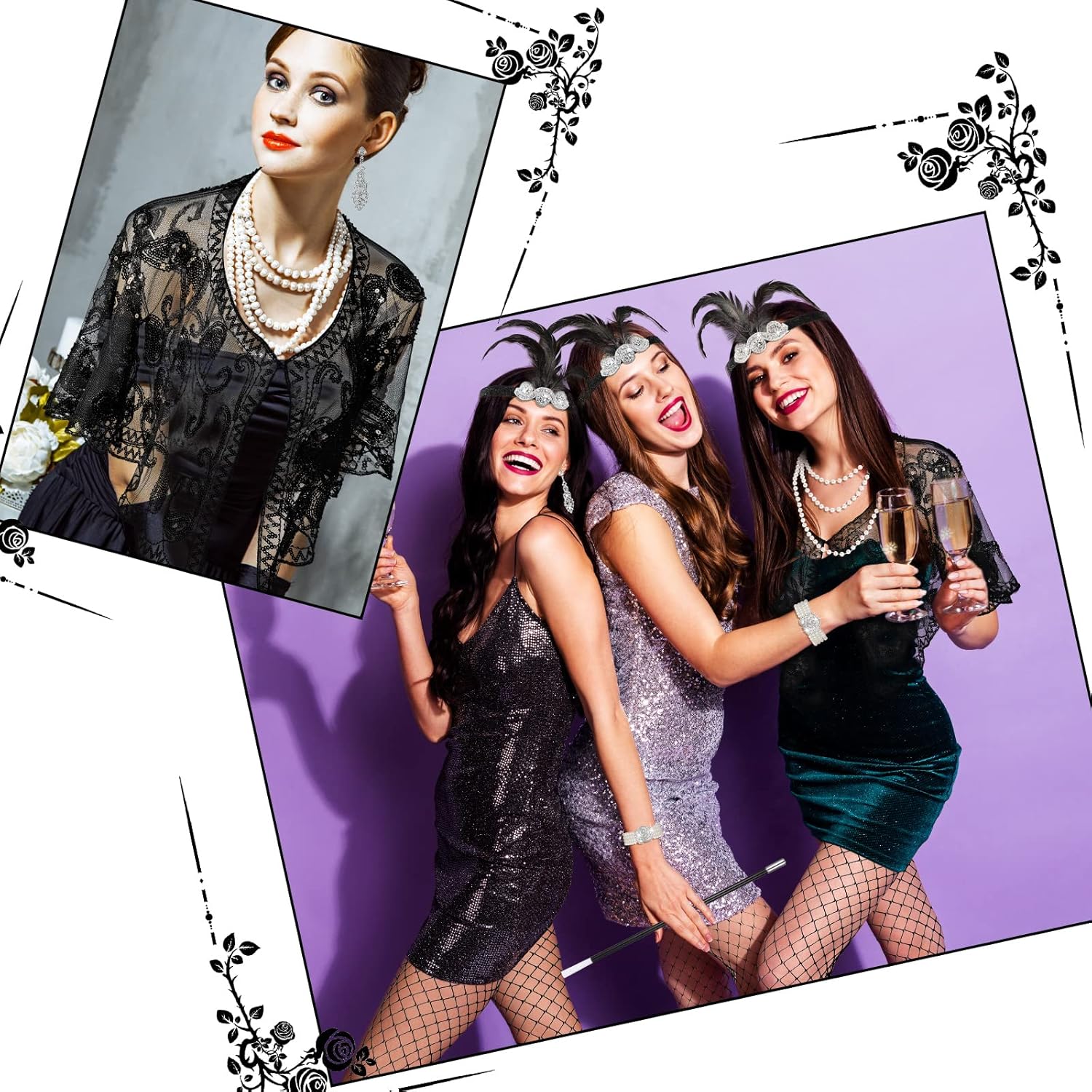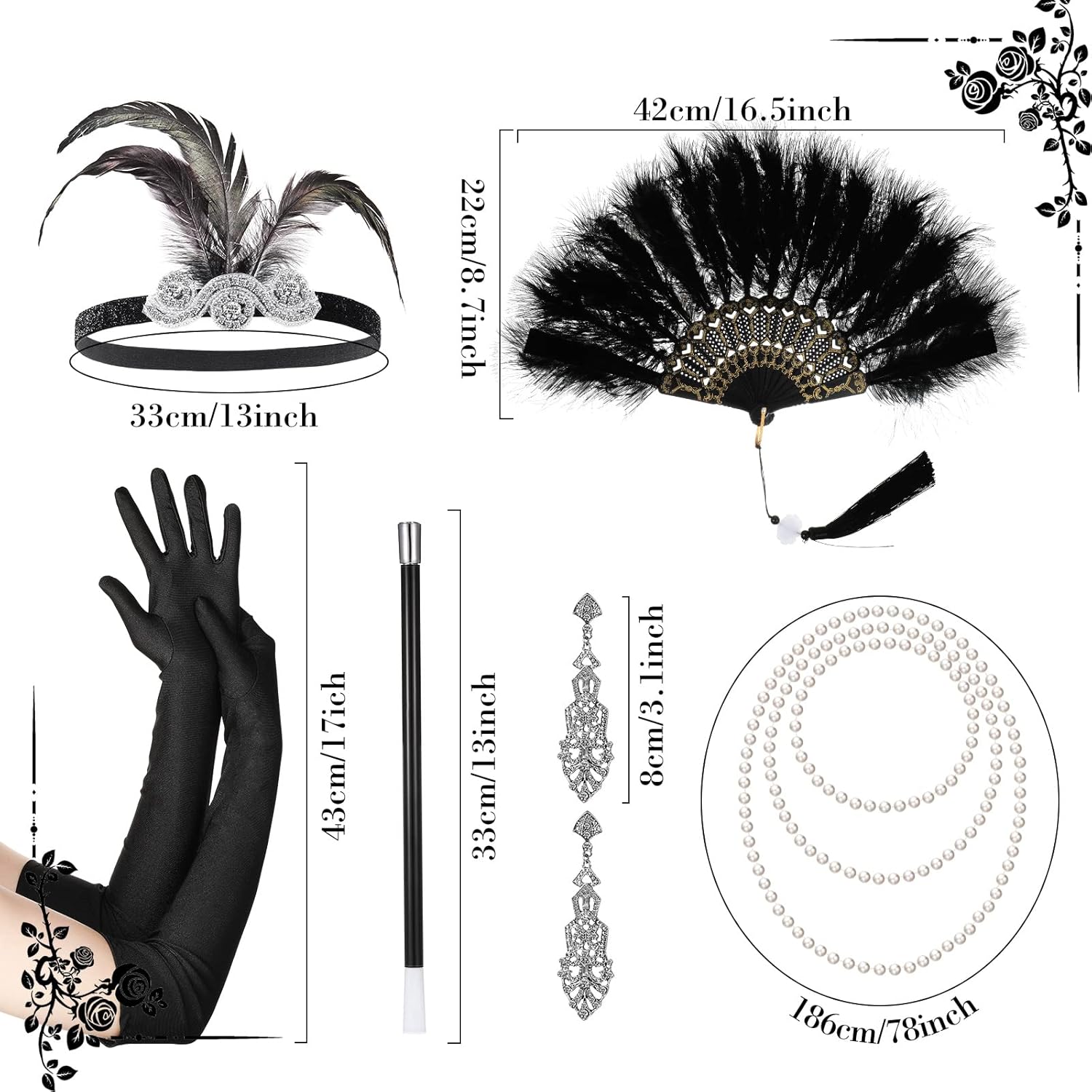 Caratteristiche: Materiale di qualità: Tutti gli accessori degli anni '20 sono ben fatti e realizzati a mano con piume di pavone, cristalli, pizzi e strass. Questo set di accessori per costumi degli anni '20 con uno stile retrò ha un effetto più elegante e glamour può essere un regalo squisito per mamma, sorelle, fidanzate, amiche per aiutarle a tornare ai ruggenti anni '20. Ampie applicazioni: Il kit di costume di flapper è perfetto per feste ruggenti degli anni '20, feste danzanti, feste art déco, feste da flapper, Halloween, abiti da club, cocktail party, banchetti, matrimoni, Natale, abiti da compleanno e tutte le altre occasioni a tema retrò. Specifiche: Colore: come mostrato Materiale: piuma, plastica, lega, strass, poliestere La confezione include: 1 x Scialle con paillettes 1 x Sciarpa 1 Paio di collant a rete 1 x Ventaglio di piume 1 Paio di guanti flapper 1 x Fascia per capelli 1 Paio di orecchini flapper 1 x Collana di perle 1 x Braccialetto di perle 1 x Anello di perle 1 x Bastoncino di plastica Nota: Le piume cadranno leggermente e si sbiadiranno leggermente al primo utilizzo. Basta scuotere il ventaglio di piume e pulire con un tovagliolo di carta asciutto. Lavabile in lavatrice, si consiglia il lavaggio a mano, lavare i colori scuri separatamente.