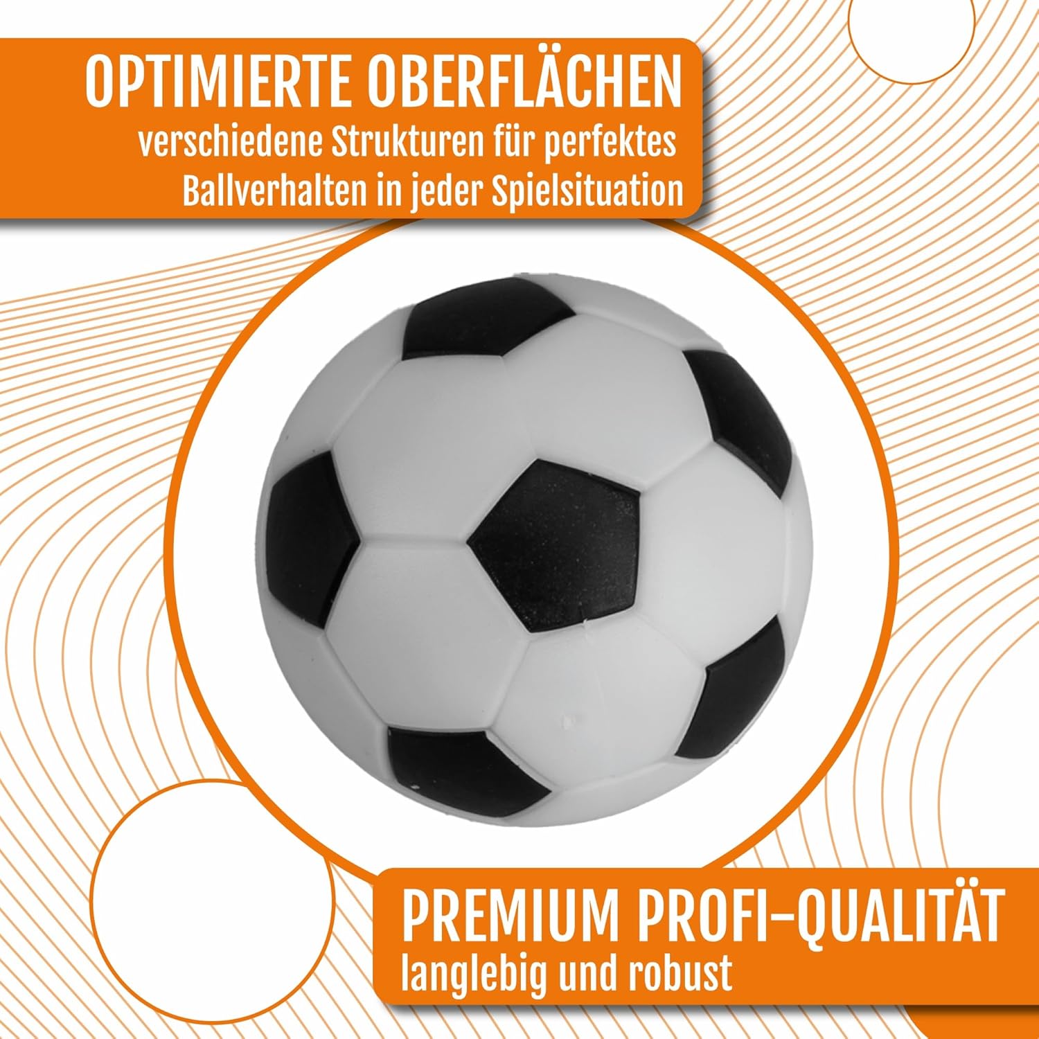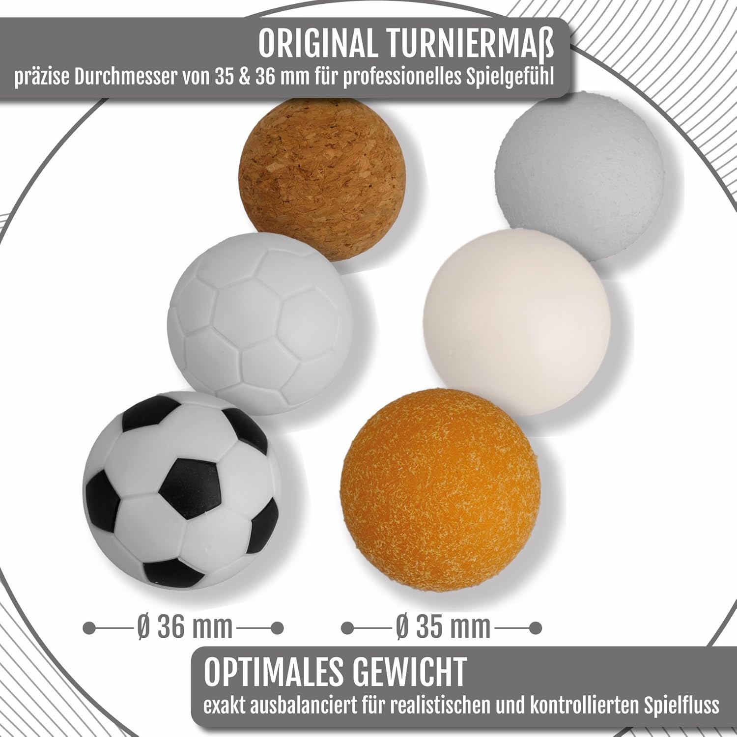 12 PALLINE DA CALCIO IN UN SET - Ampio set con 12 palline di ricambio da 35 e 36 mm, ideali per biliardini, allenamenti, tornei o giochi per il tempo libero. 6 TIPI DI PALLINE 2x CIASCUNO - Include 2x palline dal design classico del calcio, 2x palline con impugnatura testurizzata, 2x palline da allenamento lisce, 2x palline da torneo color avorio, 2x palline silenziose in sughero e 2x robuste palline di ricambio. SENSAZIONE DI GIOCO OTTIMALE - Diversi tipi di palloni garantiscono scambi rapidi, passaggi precisi e stili di gioco controllati, perfetti per diversi stili di gioco. PER PROFESSIONISTI E TEMPO LIBERO - Adatto per tavoli da biliardino ufficiali, club, pub o a casa. Ideale per bambini, giocatori amatoriali e giocatori di tornei ambiziosi. QUALITÀ DI PICCO ATTIVO - Materiali di alta qualità, perfetta concentricità e peso bilanciato garantiscono palline di lunga durata e il massimo divertimento con il biliardino. ⚽