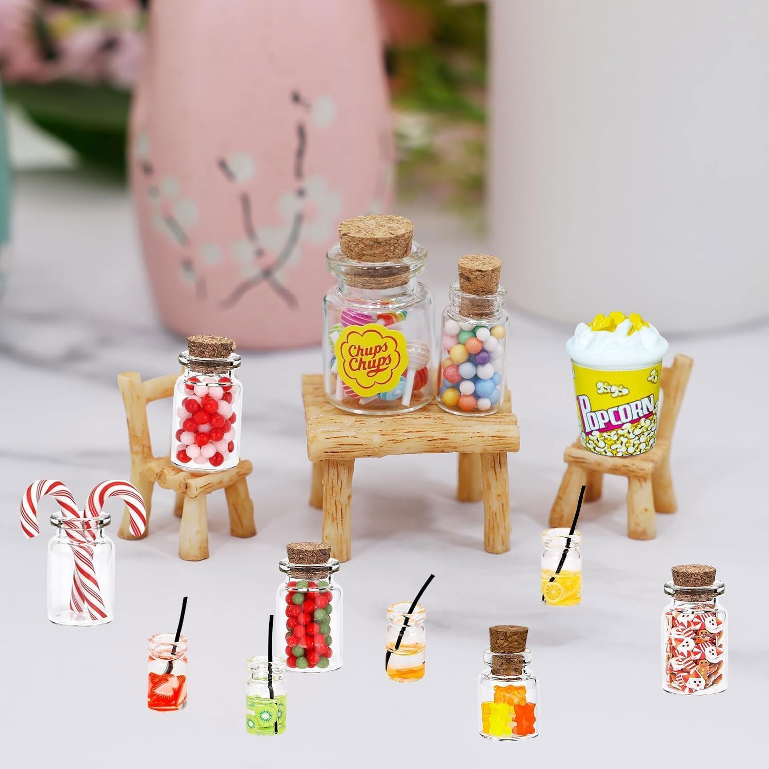 Set di caramelle e bevande in miniatura: gli accessori per mini casa delle bambole contengono 4 mini succhi, 1 barattolo in miniatura (inclusi 15 lecca), 1 popcorn, 3 caramelle natalizie in miniatura in barattolo, 7 orsetti gommosi in vetro, 2 bastoncini di zucchero in vetro. Ideale per accessori per casa delle bambole in miniatura. Materiali di alta qualità: questi accessori in miniatura sono realizzati in materiale di alta qualità, forma realistica, pregevole fattura, robusti e durevoli, non facili da rompere o sbiadire, possono essere giocati per un lungo periodo di tempo, è una decorazione in miniatura molto carina, perfetta per i bambini per decorare la loro casa dei giocattoli. Si prega di notare che i bambini di età inferiore a 3 anni non lo usano. Per evitare l'ingestione. Aspetto realistico: i colori vivaci e le texture chiare conferiscono a qualsiasi mini accessorio da cucina per bambini un aspetto realistico, mentre le dimensioni ridotte dei giocattoli alimentari in plastica per bambini li rendono ancora più belli e accattivanti. Ampiamente utilizzato: questi accessori essenziali per la cucina per bambini sono perfetti come cucina in miniatura, paesaggio in miniatura, accessori per la casa delle bambole in miniatura, inoltre è possibile utilizzare la vostra creatività per decorare la scrivania, custodie per cellulari, cornici per foto, scatole di cancelleria, ecc., in sala da pranzo, camera da letto, studio e altre scene. Accessorio per la decorazione della porta del gnomo: questo meraviglioso accessorio in miniatura è il complemento perfetto per la porta del gnomo e lo spazio davanti, vi auguriamo molto divertimento, immergersi nel mondo in miniatura degli gnomi.