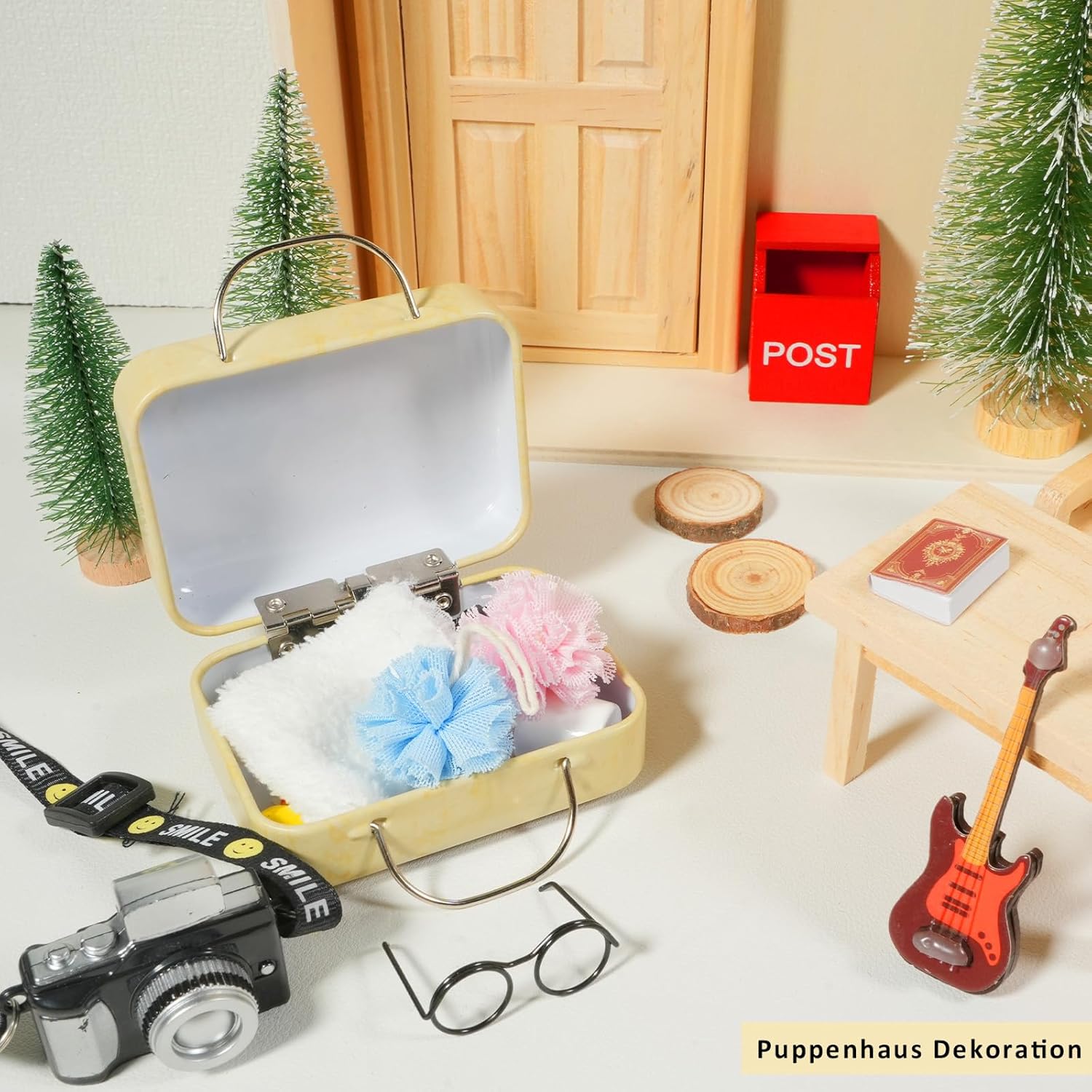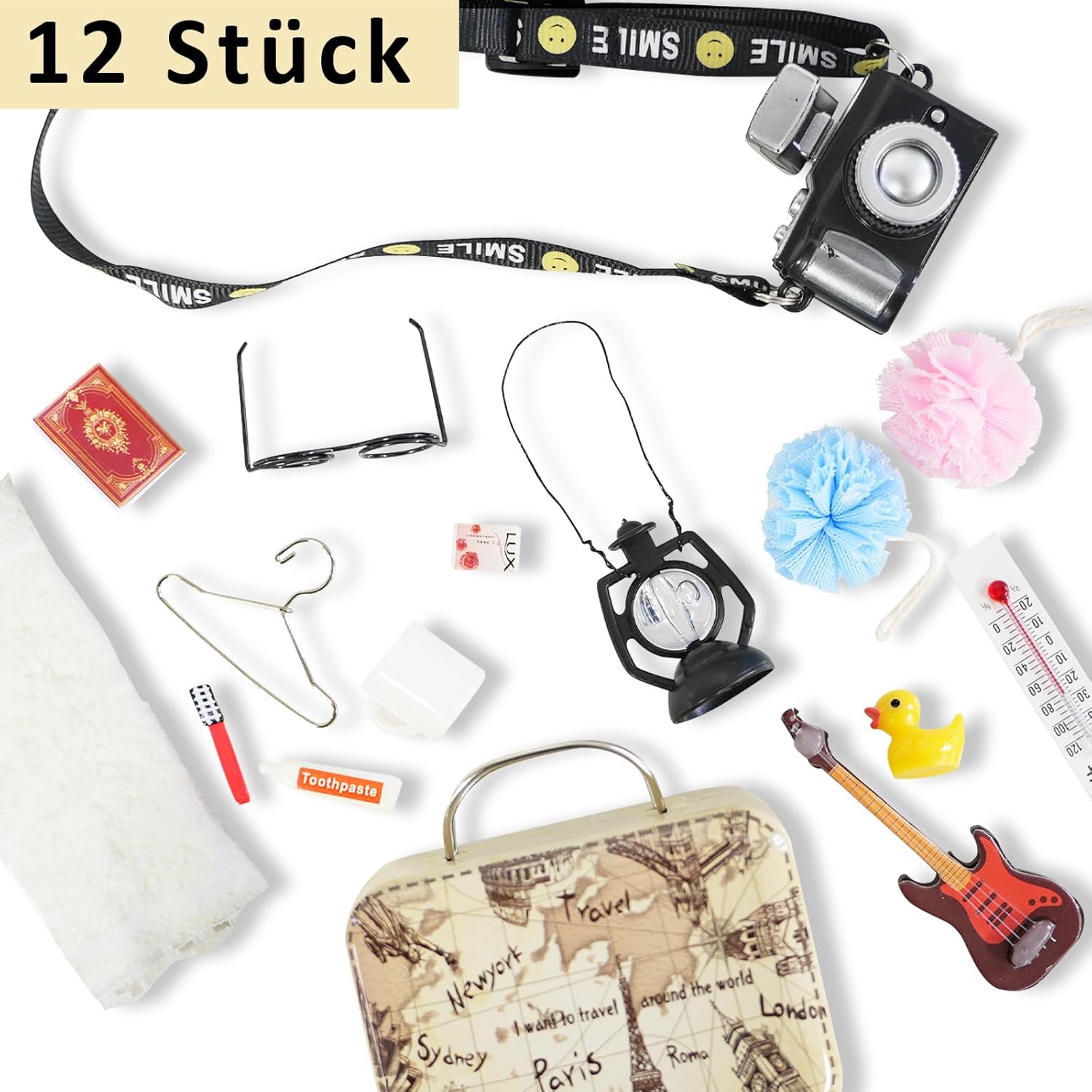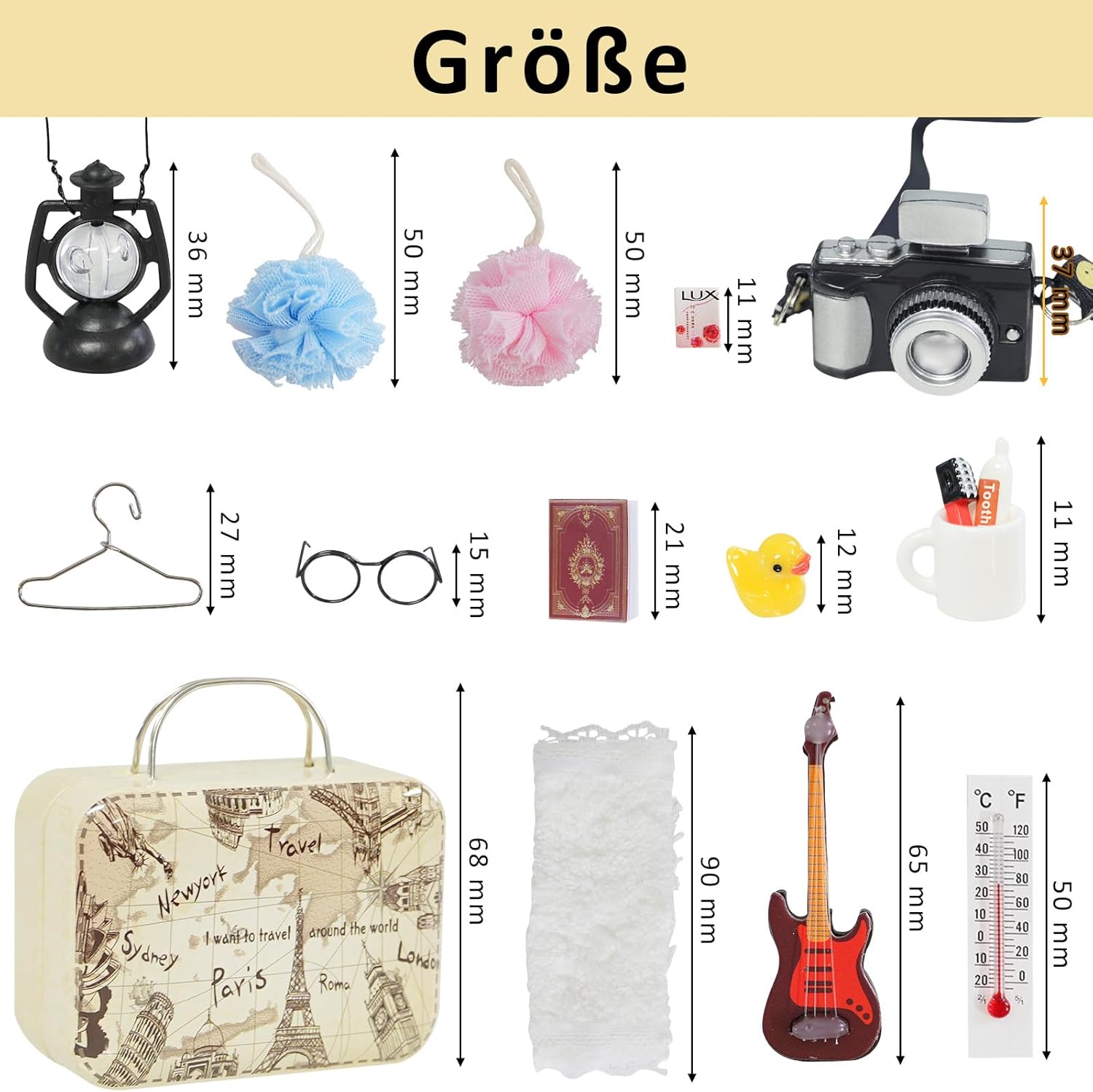 Set per casa delle bambole in miniatura: il set di accessori in miniatura include numerosi articoli da viaggio, tra cui 1 custodia, 1 asciugamano, 1 modello di dentifricio, 1 spazzolino da denti, 1 tazza, 1 fotocamera, 1 gruccia, 1 chitarra, 1 libro, 1 paio di occhiali, 1 termometro, 1 lampada, 2 mini spugna da bagno, 1 anatra, 1 sapone, adatto per case delle bambole in scala 1:12, Piccolo e compatto! Materiali di alta qualità: questi accessori micro nano sono realizzati in materiale di alta qualità, con forma realistica, pregevole fattura, forte e durevole, non facile da rompere o sbiadire, puoi giocare a lungo. Questo è un set di ornamenti in miniatura molto carino, perfetto per i bambini per decorare le loro case delle bambole. Una fonte di ispirazione per Avvents e Storie di gnomo: la valigia in miniatura e i suoi piccoli tesori offrono una ricchezza di suggerimenti per storie e giochi di ruolo. Immagina che il tuo gnomo sia appena tornato da un viaggio in Argentina e abbia portato con te le ultime tendenze di spazzolatura dei denti. Creazioni fai da te: lascia che i tuoi bambini usino la loro immaginazione e creatività fai da te, porta ai bambini idee più meravigliose, lascia che i tuoi bambini giochino con questi graziosi accessori per la casa delle bambole, che non solo portano molto divertimento, ma promuovono anche la loro immaginazione, creatività, mobilità delle dita e coordinazione occhio-mano. Regalo perfetto: il set mini casa delle bambole un regalo ideale per compleanni, Halloween, Natale, Ringraziamento e altre festività, per condividere la gioia con i tuoi cari, familiari e amici, e può anche essere usato come decorazione per il tuo soggiorno, camera da letto, sala da pranzo e studio!
