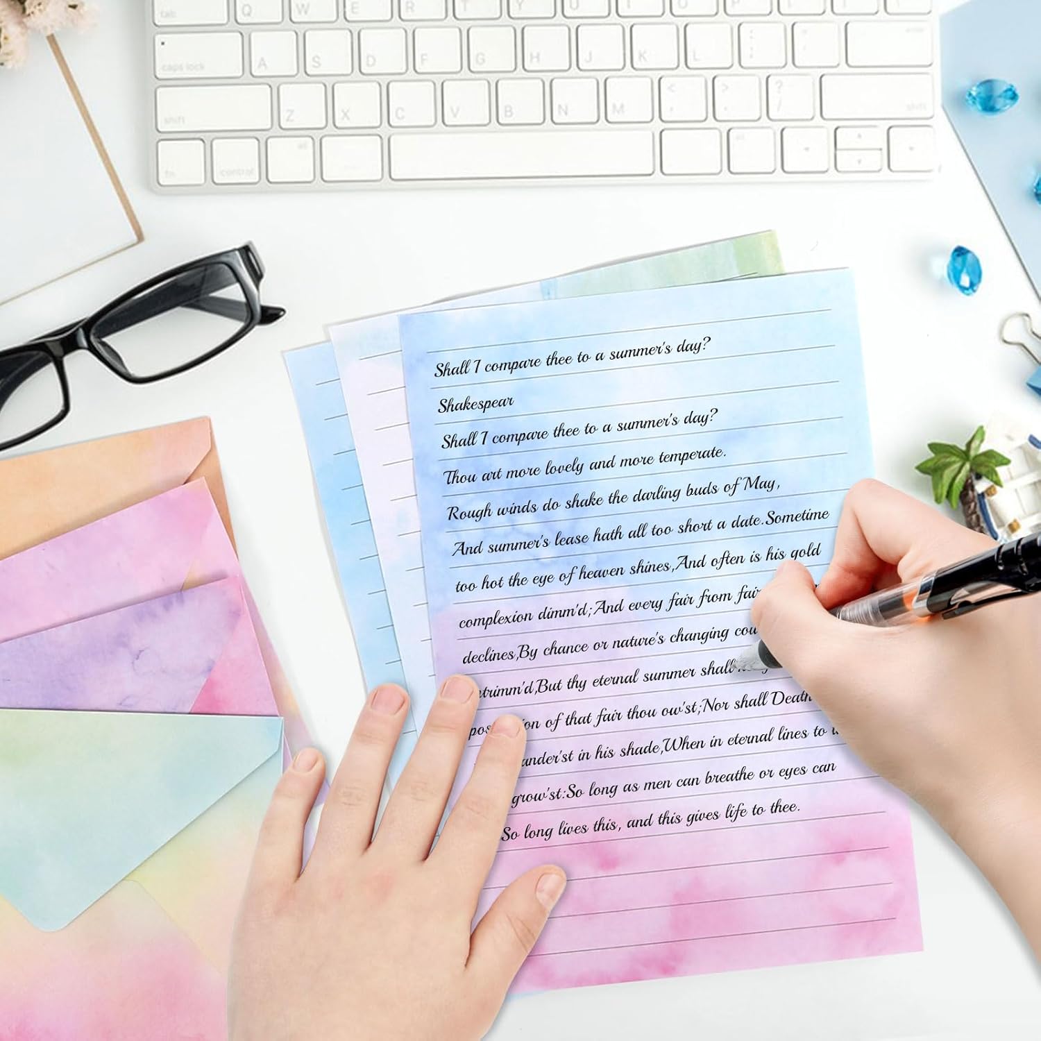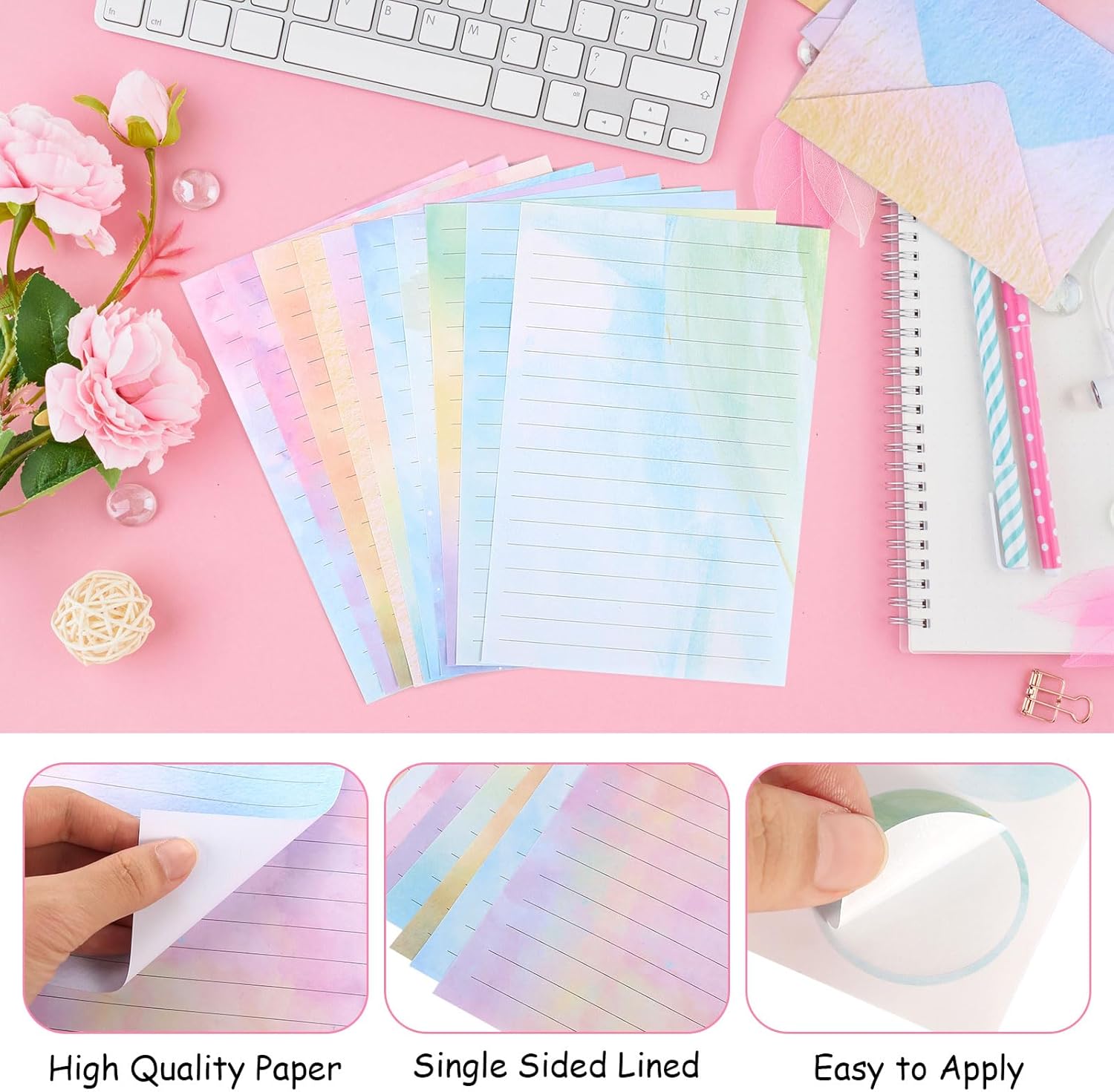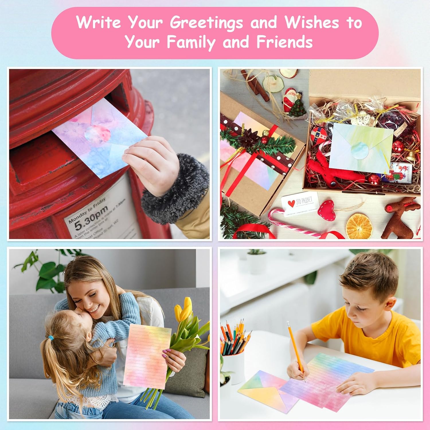 Set di cancelleria: questo set contiene 50 fogli di carta da lettere, 50 buste, 60 adesivi rotondi. Con una quantità sufficiente e modelli ricchi, può soddisfare tutte le tue esigenze di scrittura di lettere ed è molto adatto per scrivere lettere a parenti e amici. Materiali di alta qualità: la nostra carta da lettere e buste sono realizzate in carta di alta qualità con superficie liscia, consistenza spessa e delicata e scrittura fluida. Le linee orizzontali sono stampate sulla parte anteriore per una facile scrittura. La parte posteriore vuota offre spazio per esprimere la tua creatività. Motivo ad acquerello unico: 10 motivi ad acquerello unici e raffinati con colori delicati che emanano un'atmosfera artistica. Puoi scegliere stili diversi a seconda delle tue preferenze e scrivere lettere a diversi amici. Facile da usare: grazie alle giuste dimensioni, può essere facilmente trasportato in borsa o gettato direttamente nella cassetta delle lettere. Dimensioni busta: 14,5 × 11 cm, dimensioni carta da lettera: 21 × 14 cm. Usa la nostra bella cancelleria per scrivere saluti e auguri alla tua famiglia e ai tuoi amici, rafforzando così il rapporto reciproco. Ampia gamma di applicazioni: questo set di carta da lettere è perfetto per occasioni come feste di compleanno, lauree, matrimoni, feste di fidanzamento e San Valentino. Questa bella carta a righe può essere utilizzata per lettere scritte a mano, biglietti di auguri, scrapbooking, inviti per feste, biglietti di auguri, artigianato in carta e molto altro ancora.