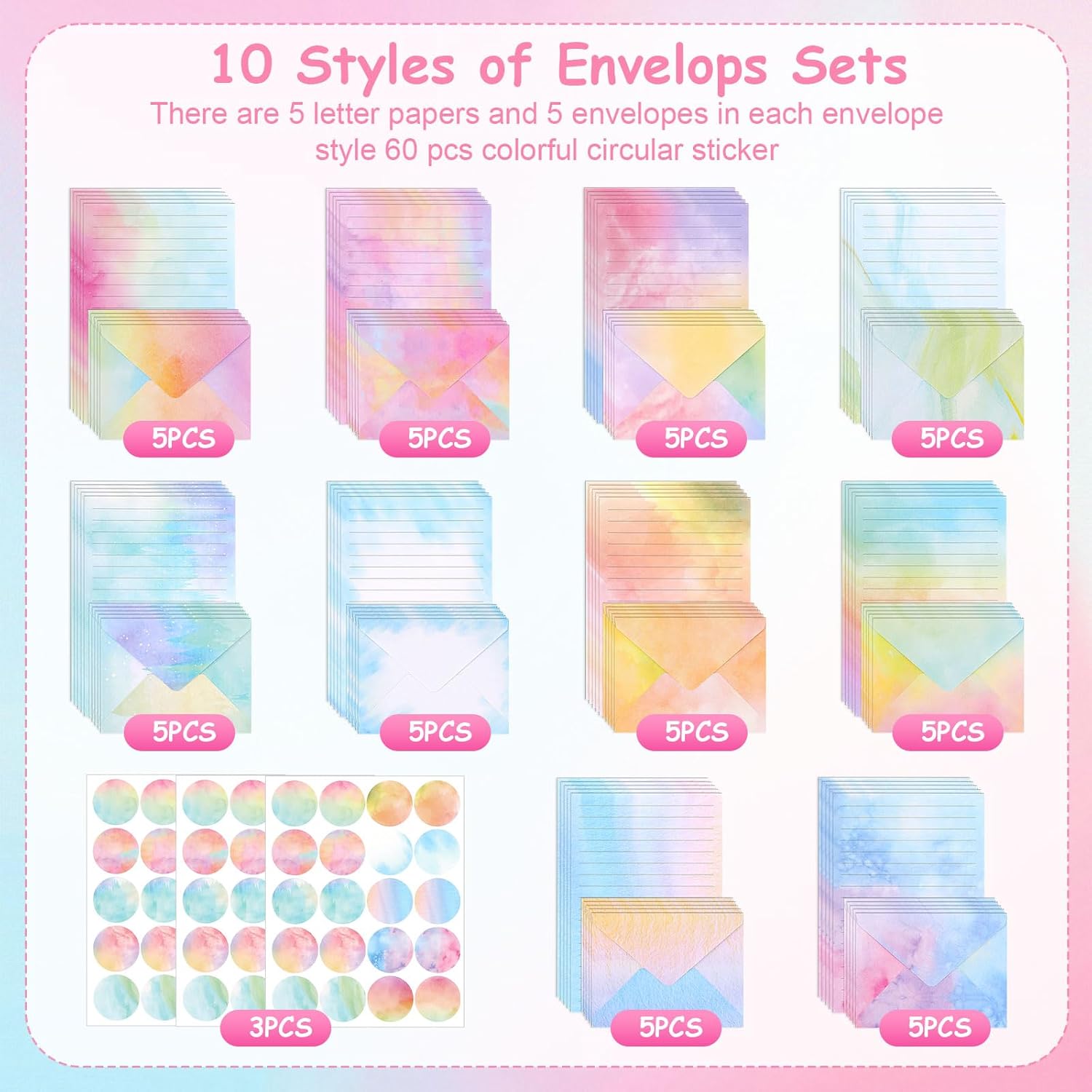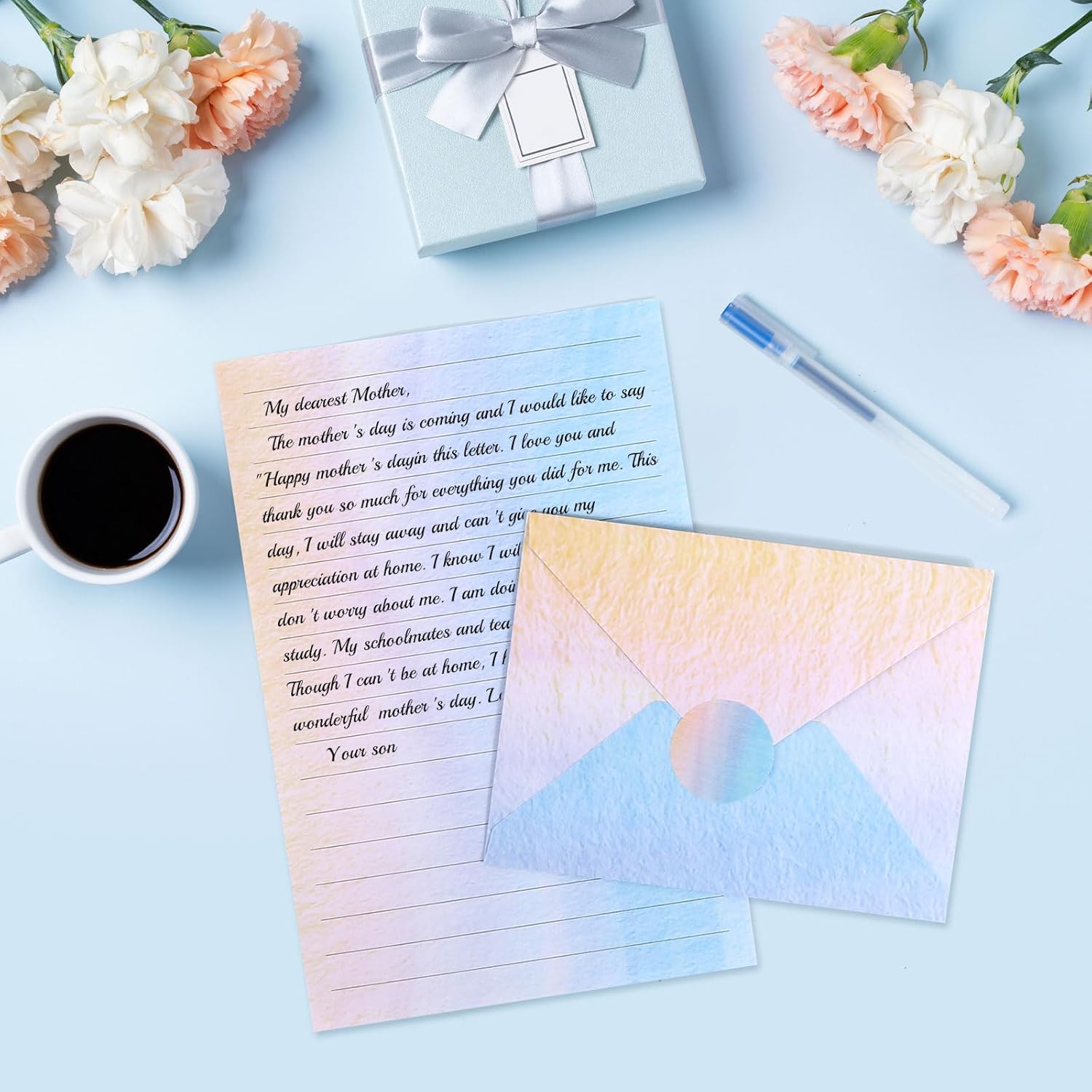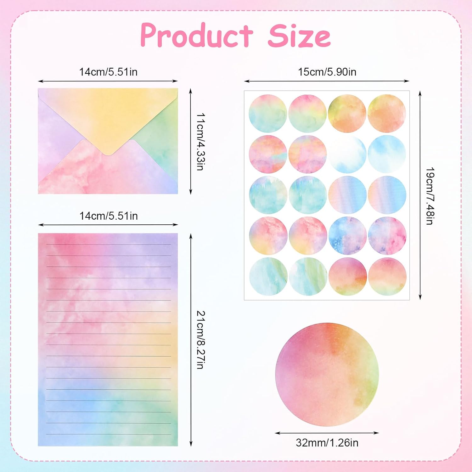 Set di cancelleria: questo set contiene 50 fogli di carta da lettere, 50 buste, 60 adesivi rotondi. Con una quantità sufficiente e modelli ricchi, può soddisfare tutte le tue esigenze di scrittura di lettere ed è molto adatto per scrivere lettere a parenti e amici. Materiali di alta qualità: la nostra carta da lettere e buste sono realizzate in carta di alta qualità con superficie liscia, consistenza spessa e delicata e scrittura fluida. Le linee orizzontali sono stampate sulla parte anteriore per una facile scrittura. La parte posteriore vuota offre spazio per esprimere la tua creatività. Motivo ad acquerello unico: 10 motivi ad acquerello unici e raffinati con colori delicati che emanano un'atmosfera artistica. Puoi scegliere stili diversi a seconda delle tue preferenze e scrivere lettere a diversi amici. Facile da usare: grazie alle giuste dimensioni, può essere facilmente trasportato in borsa o gettato direttamente nella cassetta delle lettere. Dimensioni busta: 14,5 × 11 cm, dimensioni carta da lettera: 21 × 14 cm. Usa la nostra bella cancelleria per scrivere saluti e auguri alla tua famiglia e ai tuoi amici, rafforzando così il rapporto reciproco. Ampia gamma di applicazioni: questo set di carta da lettere è perfetto per occasioni come feste di compleanno, lauree, matrimoni, feste di fidanzamento e San Valentino. Questa bella carta a righe può essere utilizzata per lettere scritte a mano, biglietti di auguri, scrapbooking, inviti per feste, biglietti di auguri, artigianato in carta e molto altro ancora.