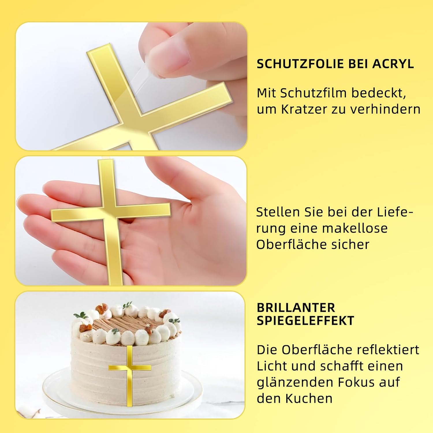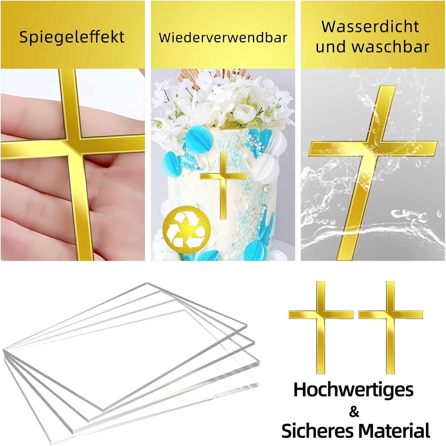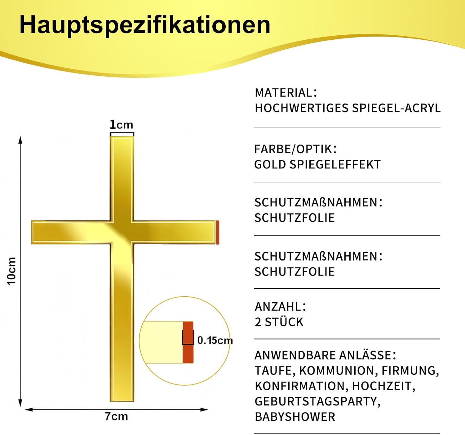Elegante set da 2 pezzi per occasioni speciali: perfeziona la tua festa con il nostro set di 2 decorazioni per torte a croce. Realizzato in pregiato acrilico dorato, questo topper per torta per battesimo è il coronamento ideale per torte e torte per comunione o battesimo. Il design a croce in filigrana e brillante rende ogni torta un'attrazione indimenticabile per questo giorno sacro Effetto specchio lucido per il fattore wow. Il nostro set di decorazioni per torte a specchio in acrilico dorato di alta qualità cattura la luce splendidamente e fa brillare la tua torta. Questa decorazione per torte è la scelta perfetta per rendere indimenticabile la festa per ragazze e ragazzi. Basta rimuovere la pellicola protettiva e godere della brillantezza brillante che attira l'attenzione di tutti. Versatile per ogni celebrazione: non solo per il battesimo. Queste decorazioni sono la perfetta decorazione per la cresima e sono perfette anche per matrimoni, compleanni, feste e comunioni. Che si tratti di torte, cupcake o dessert, aggiungono un tocco di eleganza a qualsiasi occasione e renderanno la vostra cresima un evento elegante. La decorazione perfetta per il battesimo: siete alla ricerca della decorazione ideale per torte? Questo set è la risposta. Come elegante caketopper per il battesimo trasforma ogni torta in un capolavoro. La perfetta torta decorativa completa l'atmosfera festiva e funge da splendida decorazione per torte battezze, che rimarrà a lungo nella memoria. Durevole e ideale per la torta da battesimo: questo set in acrilico dorato durevole è riutilizzabile e facile da pulire. È la decorazione perfetta per la torta da battesimo, i ragazzi e le ragazze ne saranno entusiasti. La nostra decorazione per torta a forma di croce da 2 pezzi è quindi la scelta ideale come decorazione per torte da battesimo di giovani battezzatori e un simbolo che può essere conservato come ricordo.