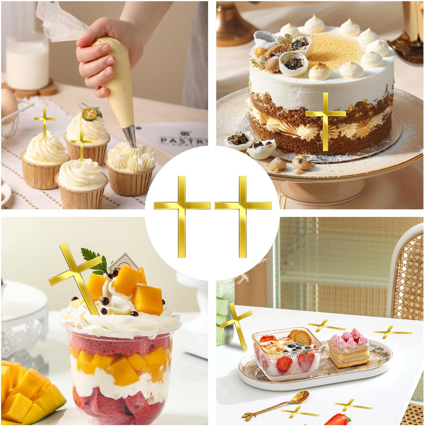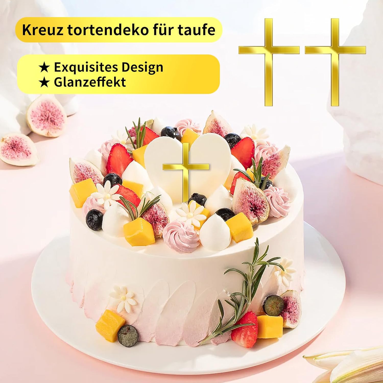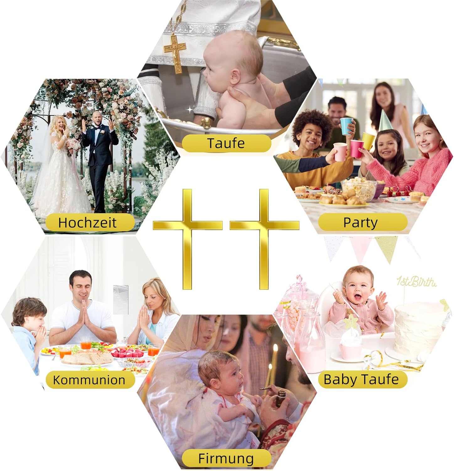 Elegante set da 2 pezzi per occasioni speciali: perfeziona la tua festa con il nostro set di 2 decorazioni per torte a croce. Realizzato in pregiato acrilico dorato, questo topper per torta per battesimo è il coronamento ideale per torte e torte per comunione o battesimo. Il design a croce in filigrana e brillante rende ogni torta un'attrazione indimenticabile per questo giorno sacro Effetto specchio lucido per il fattore wow. Il nostro set di decorazioni per torte a specchio in acrilico dorato di alta qualità cattura la luce splendidamente e fa brillare la tua torta. Questa decorazione per torte è la scelta perfetta per rendere indimenticabile la festa per ragazze e ragazzi. Basta rimuovere la pellicola protettiva e godere della brillantezza brillante che attira l'attenzione di tutti. Versatile per ogni celebrazione: non solo per il battesimo. Queste decorazioni sono la perfetta decorazione per la cresima e sono perfette anche per matrimoni, compleanni, feste e comunioni. Che si tratti di torte, cupcake o dessert, aggiungono un tocco di eleganza a qualsiasi occasione e renderanno la vostra cresima un evento elegante. La decorazione perfetta per il battesimo: siete alla ricerca della decorazione ideale per torte? Questo set è la risposta. Come elegante caketopper per il battesimo trasforma ogni torta in un capolavoro. La perfetta torta decorativa completa l'atmosfera festiva e funge da splendida decorazione per torte battezze, che rimarrà a lungo nella memoria. Durevole e ideale per la torta da battesimo: questo set in acrilico dorato durevole è riutilizzabile e facile da pulire. È la decorazione perfetta per la torta da battesimo, i ragazzi e le ragazze ne saranno entusiasti. La nostra decorazione per torta a forma di croce da 2 pezzi è quindi la scelta ideale come decorazione per torte da battesimo di giovani battezzatori e un simbolo che può essere conservato come ricordo.