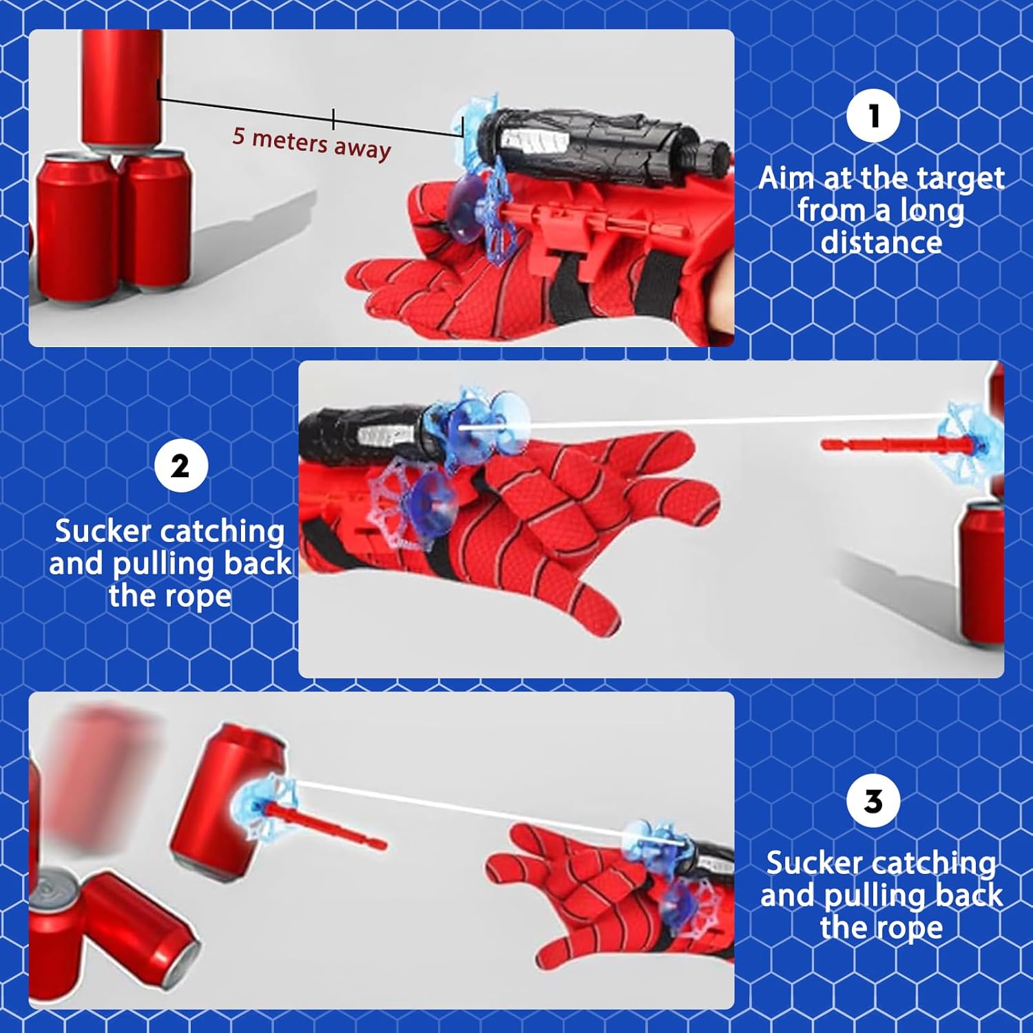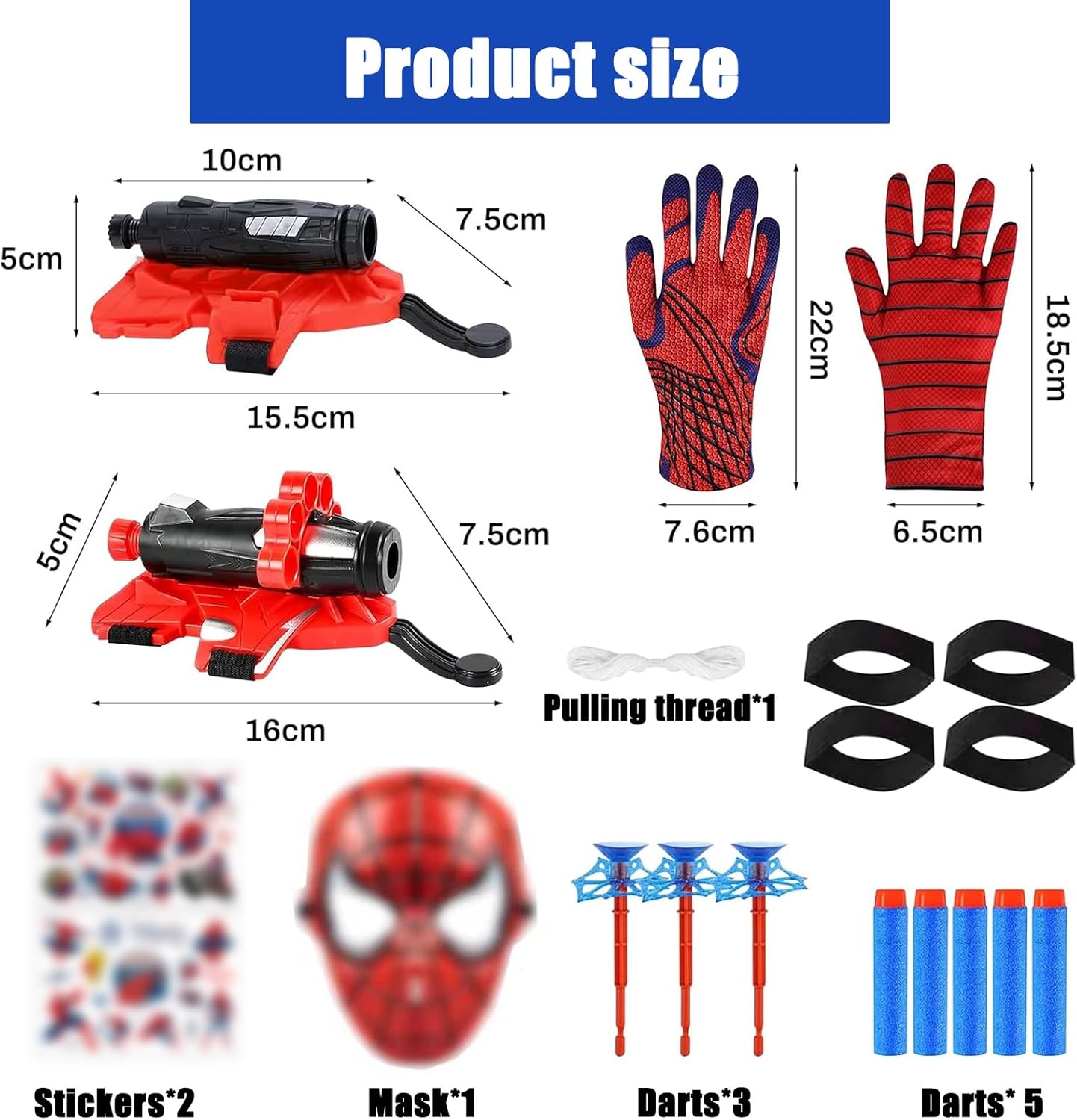 Spider Glove Launcher Set: Il set include 2 lanciatori ragno, 2 guanti ragno, 1 maschera, 5 proiettili di spugna a punta tonda, 3 freccette a ventosa, 2 adesivi per tatuaggi ragno, 1 corda e 4 cinturini da polso flessibili e regolabili Materiale di Alta Qualità: I nostri Spider Web Launcher Toy sono realizzati in plastica di alta qualità, lavorati con cura per garantire comfort e durata. La loro robustezza e la cucitura sicura rendono questi guanti adatti per l'uso da parte dei bambini in totale sicurezza Apprendimento Giocando: Indossando Spider Guanti per Bambino, i bambini possono imitare le scene eroiche dei film, immergendosi in un mondo di fantasia che stimola la loro ammirazione per gli eroi e contribuisce a formare una corretta visione del mondo Facile da Usare: I Spider Launcher Glove sono estremamente facili da utilizzare, basta montare il dardo sul lanciatore, fissarlo con l'elastico e indossarlo sulla mano. I bambini possono divertirsi giocando insieme ai loro amici Regalo Ideale: I Guanti Spider Bambino sono perfetti per feste di compleanno, feste di carnevale, feste in maschera e giochi di ruolo, arricchendo l'esperienza di travestimento e contribuendo alla crescita felice dei bambini
