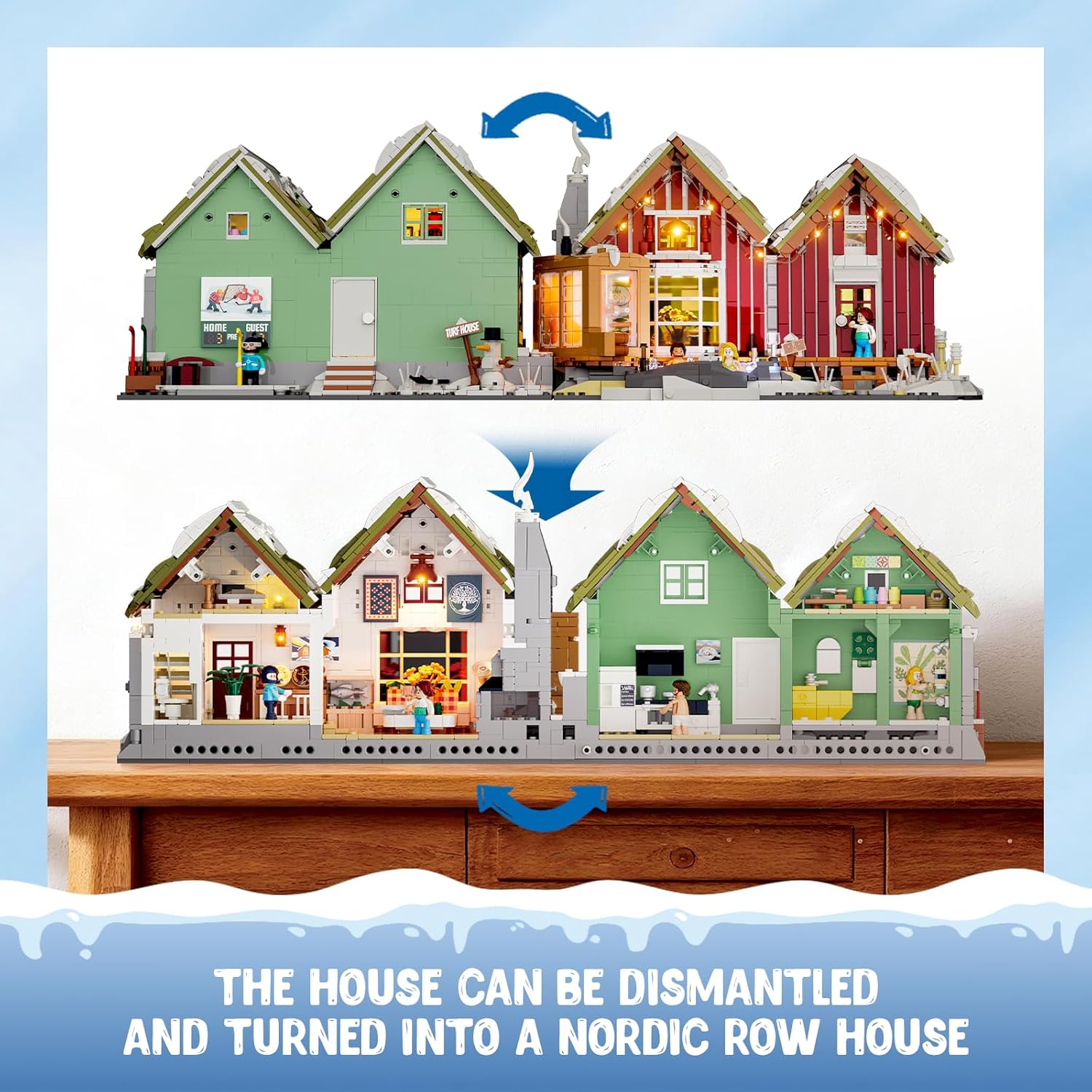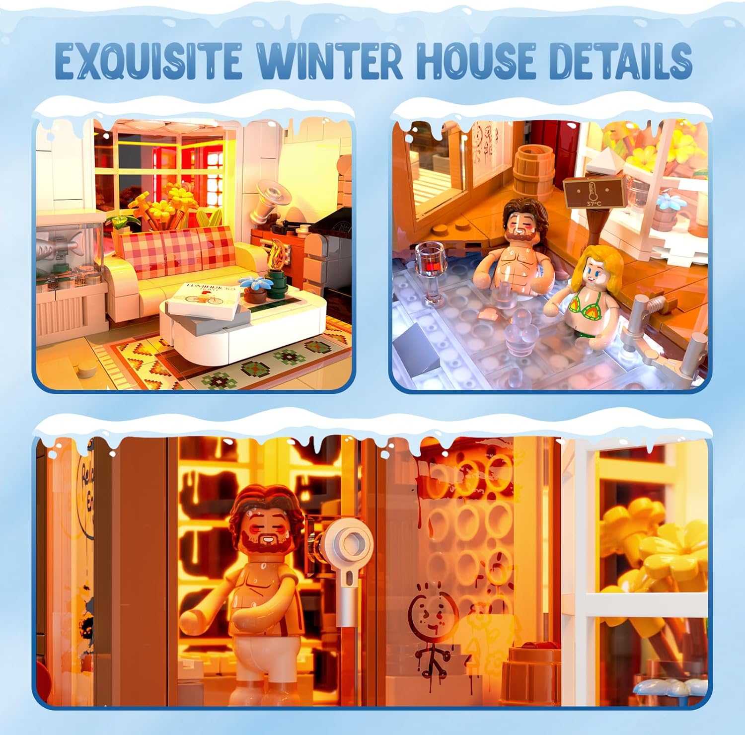 ESPERIENZA RETREAT AUTENTICA NORDIC SPA: Immergiti nel fascino dell'architettura nordica con questo set di cabine invernali termali, ispirato alla tradizione unica della casa in erba islandese e alle colorate case a schiera in legno. Rivivi la cultura regionale con dettagli come una piscina termale geotermica e una sala sauna, che riflettono il ricco patrimonio termale islandese alimentato dal calore naturale. CASE A FILA SPLIT-DESIGN: Caratterizzate da colori contrastanti sulle facciate anteriore e posteriore, queste unità possono essere separate e posizionate fianco a fianco. Entrambi i lati fungono da aree espositive: la parte anteriore mette in mostra le attività termali mentre la parte posteriore è dotata di hockey su ghiaccio. Il suo design modulare incoraggia la disposizione flessibile e lo rende perfetto per la narrazione e il gioco creativo. Dettagli della cultura termale immersiva: progettato per collezionisti adulti e appassionati di inverno, questo set ricrea la cultura termale islandese con realismo sorprendente. L'area esterna comprende una sorgente termale luminosa circondata da luci tremolanti e una sauna con effetti LED traspiranti che imitano il vapore sulle finestre traslucide. Set ideale per l'esposizione invernale e natalizia: abbraccia lo spirito natalizio con questa cabina rustica che contrasta l'illuminazione calda con uno sfondo gelido, creando un'atmosfera sorprendente ma rilassante. Si abbina magnificamente ad altri set invernali o a tema natalizio, rendendolo un accattivante centrotavola per l'arredamento stagionale. Effetti luminosi caldi e atmosferici: eleva il tuo display con funzioni LED integrate, tra cui sorgenti termali illuminate e una sauna fumante simulata utilizzando mattoni trasparenti stampati. L'illuminazione calda crea un bagliore invitante contro l'ambiente invernale, migliorando sia i dettagli interni che esterni.