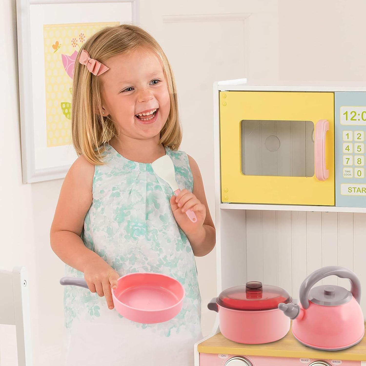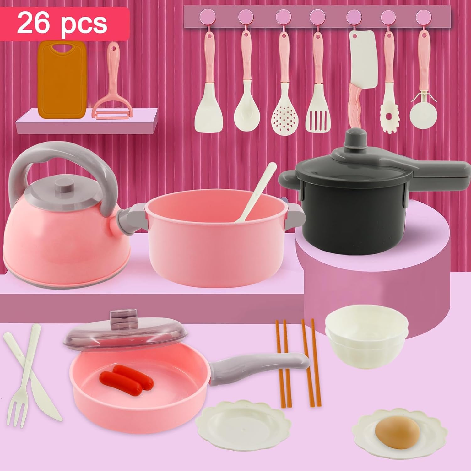 [Giocattoli da cucina] Il nostro set completo di giocattoli da cucina comprende un bollitore, una pentola a pressione, una padella, una pentola, un tagliere, piatti, una ciotola per il riso e un set di coltelli, forchette e bacchette, per un totale di 26 pezzi. Immergiti in un mondo di creatività con questo set di giocattoli. [Sicuro, non tossico e rispettoso dell'ambiente] I nostri prodotti sono realizzati con materiali di alta qualità, privi di BPA e PVC. Ogni dettaglio riflette il nostro impegno per la sicurezza, creando un ambiente sicuro in cui il tuo bambino possa dare libero sfogo alla sua immaginazione. [Gioco di ruolo in cucina] Puoi giocare a cucinare, stimolando la loro immaginazione e abilità manuali. Scopri la gioia di cucinare, prepara pasti abbondanti per la tua famiglia o i tuoi amici e aiutali a identificare e utilizzare vari utensili da cucina per migliorare le loro abilità di vita. [Esperienza di simulazione realistica] Impara a simulare scenari di cucina e sviluppare abilità versatili. Questo giocattolo da cucina combina perfettamente divertimento e apprendimento. Migliora la coordinazione occhio-mano e promuove il lavoro di squadra, consentendo agli studenti di sviluppare competenze essenziali divertendosi. [Regalo ideale] Questo set da cucina è ideale come regalo di compleanno, Halloween, Ringraziamento, Natale, Capodanno, Pasqua o festa. Gli accessori da cucina offrono un'esperienza di gioco infinita.