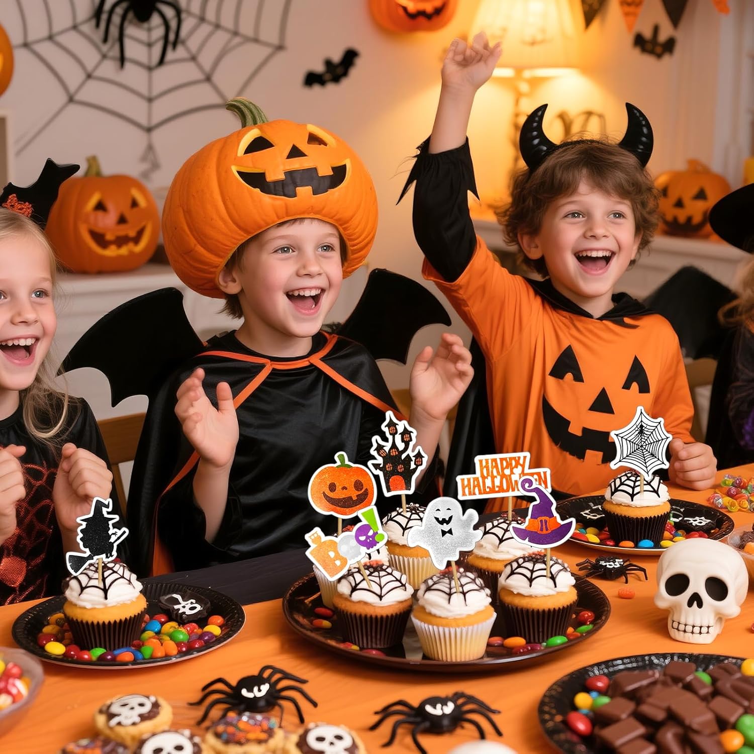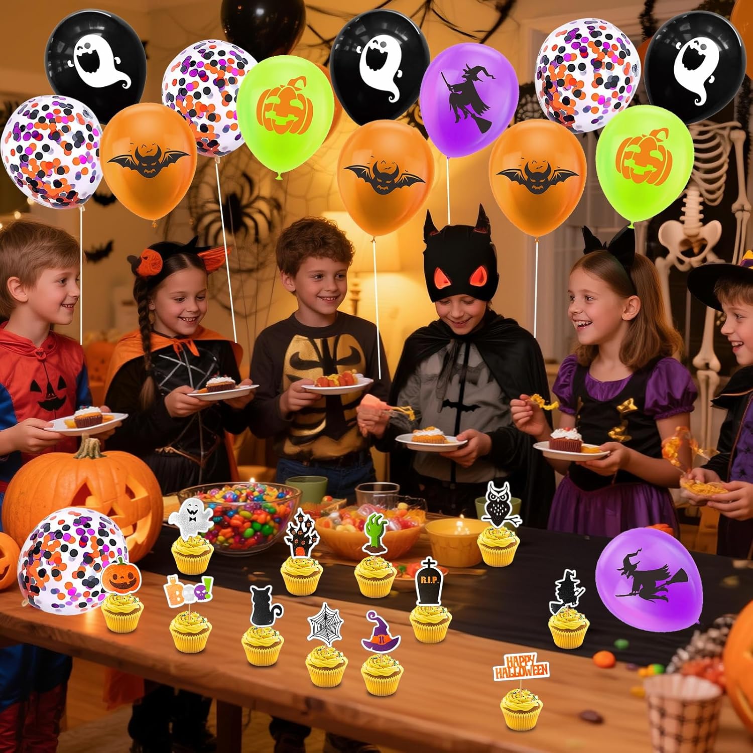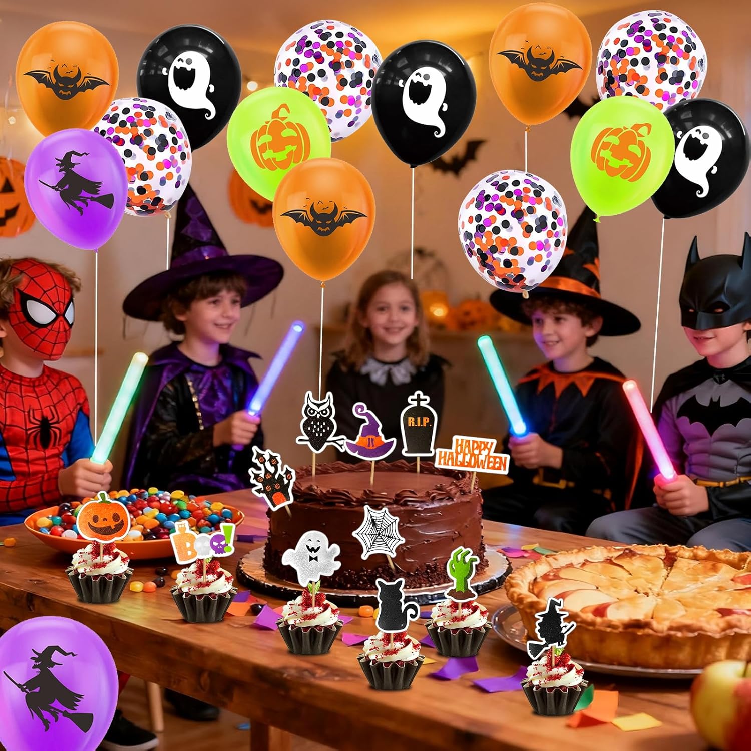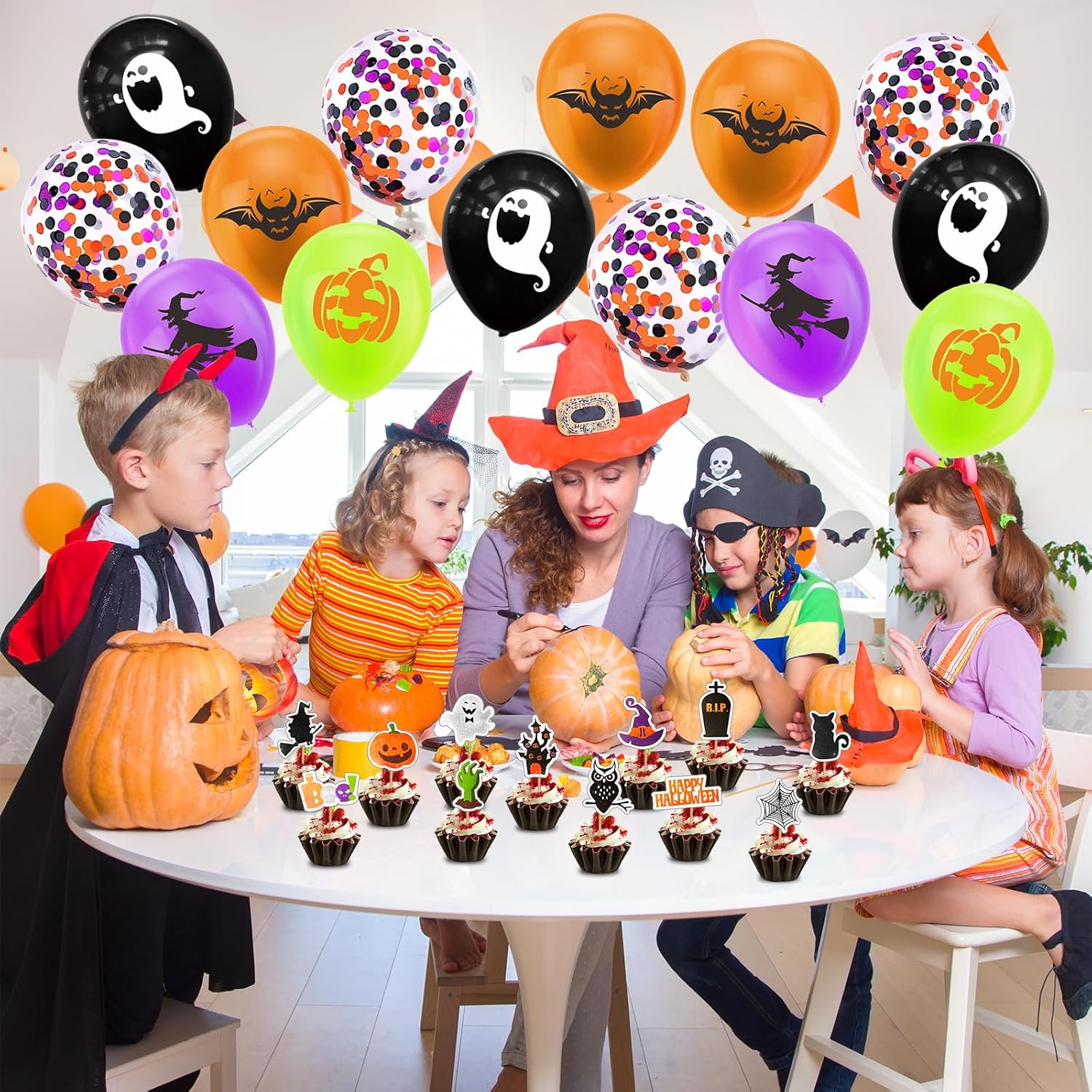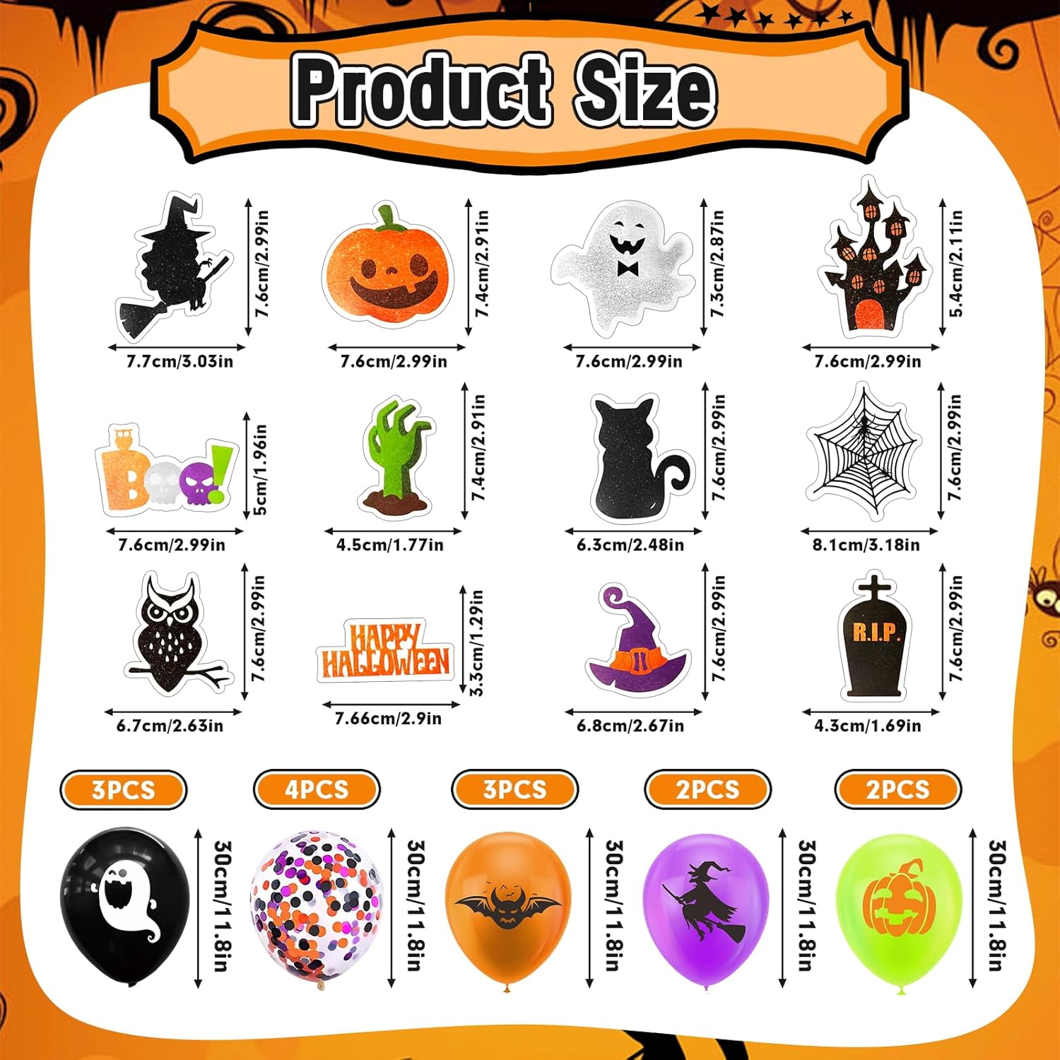 Contenuto della confezione: contiene 12 diversi topper decorativi per cupcake di Halloween con motivi classici come zucca, pipistrello, cappello da strega, ragnatela e spirito e 14 palloncini decorativi per torte di Halloween con diversi design. Inoltre riceverete due rotoli di nastro adesivo, perfetto per combinare e decorare. Materiale di alta qualità: le nostre decorazioni per torte di Halloween sono realizzate in cartone robusto e resistente, che non si piega o sbiadisce facilmente. I palloncini sono realizzati in lattice resistente, sicuri, atossici e durevoli, ideali per qualsiasi festa. Facile da usare: gli elementi decorativi per torte di Halloween possono essere assemblati in pochi passaggi e inseriti direttamente in muffin, cupcake o torte. I palloncini possono essere riempiti con elio o aria e creano immediatamente un'atmosfera festosa. Atmosfera pura di Halloween: che si tratti di zucca, fantasma, ragno o strega, le decorazioni per torte di Halloween creano un'atmosfera spaventosa e creativa e rendono la decorazione della tua festa una vera attrazione. Ampio utilizzo: perfetto per decorazioni per torte di Halloween, compleanni, feste a tema, feste per bambini, Ringraziamento o come decorazione speciale da tavolo. Con questo set potrete decorare torte, snack e stanze in un batter d'occhio in modo unico ed elegante.