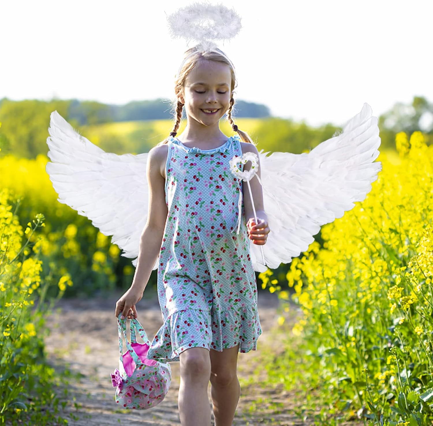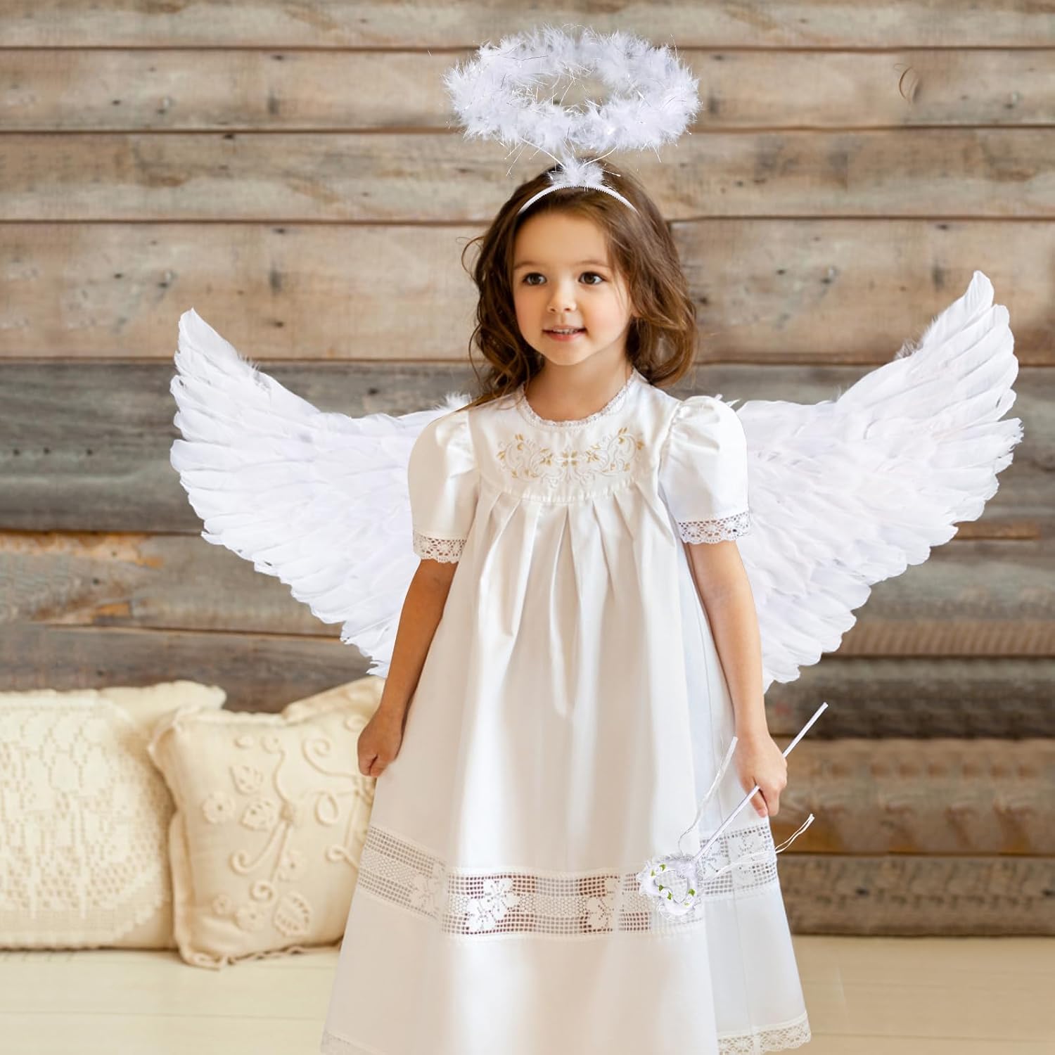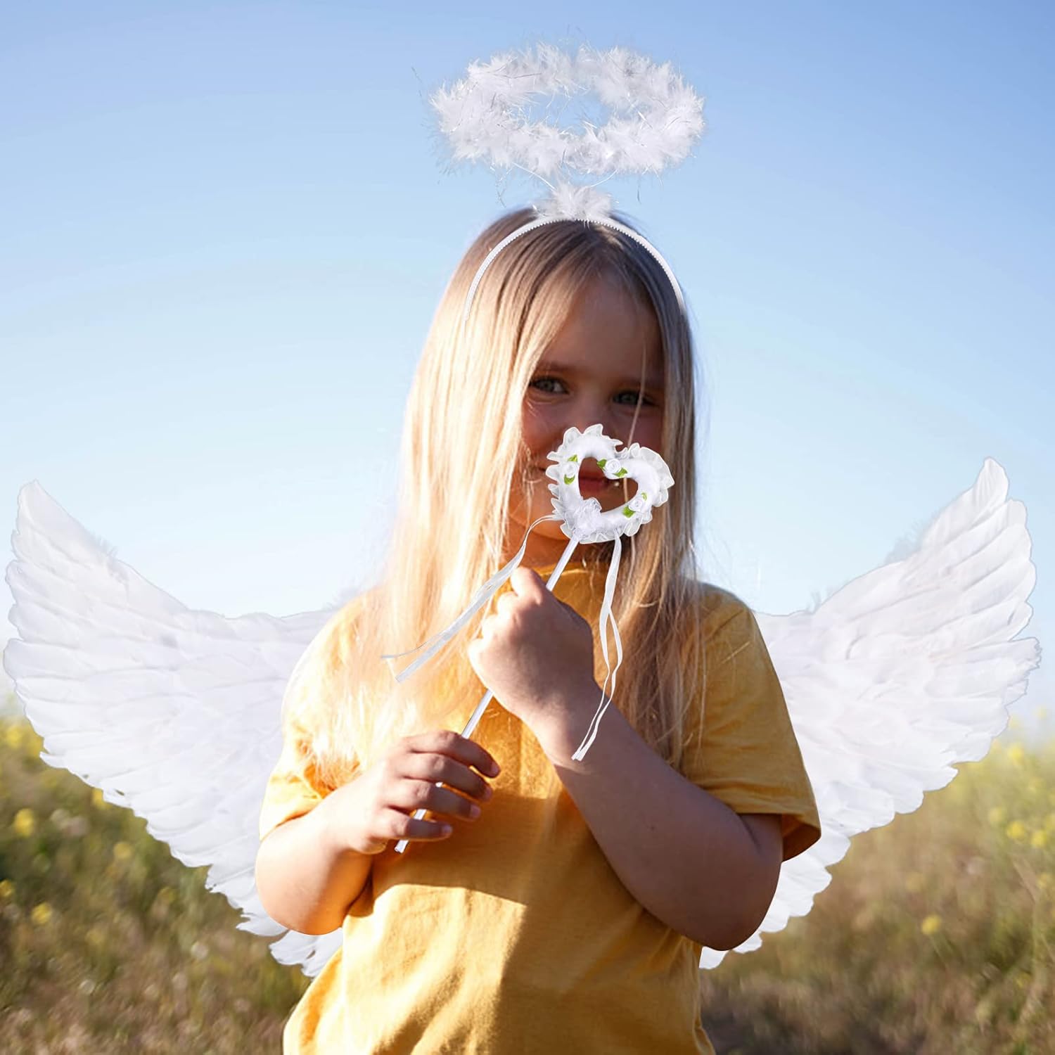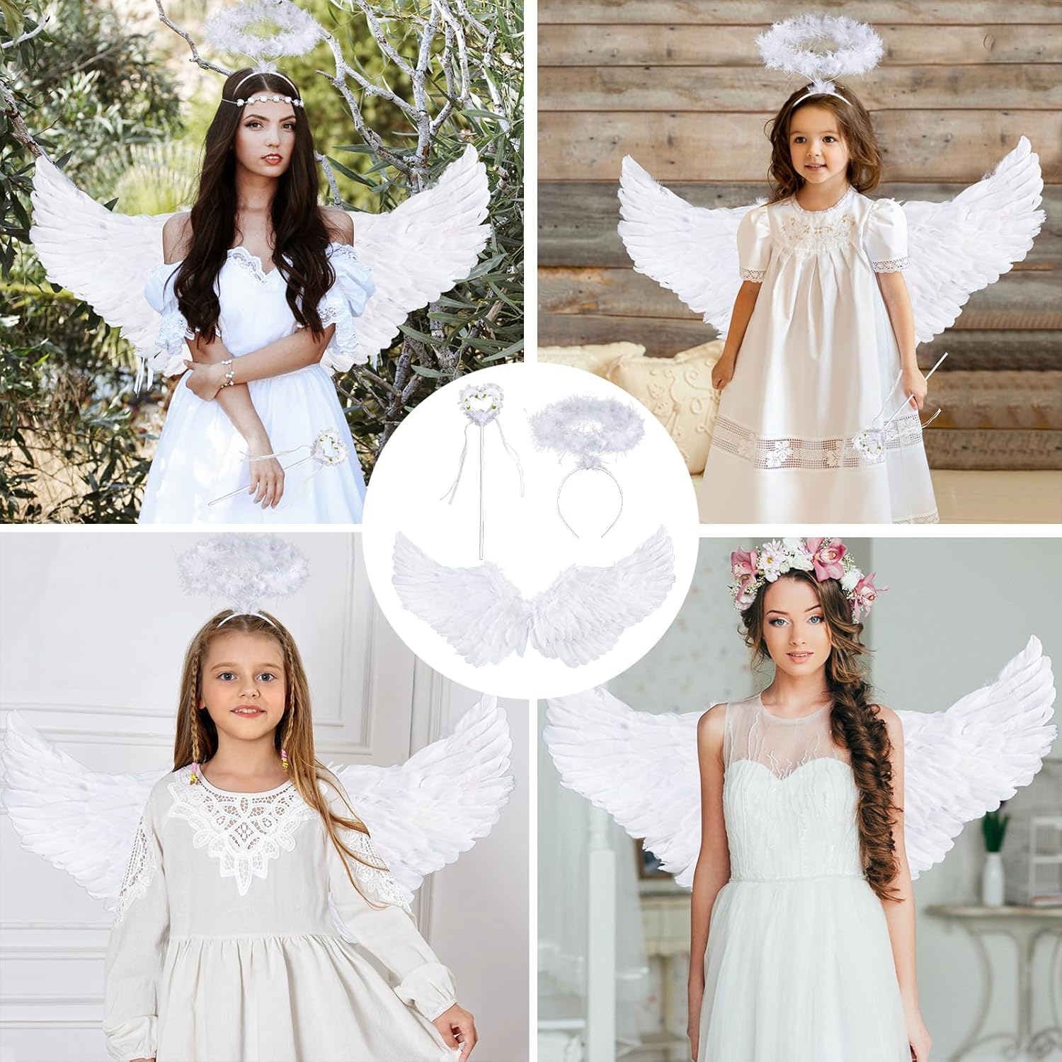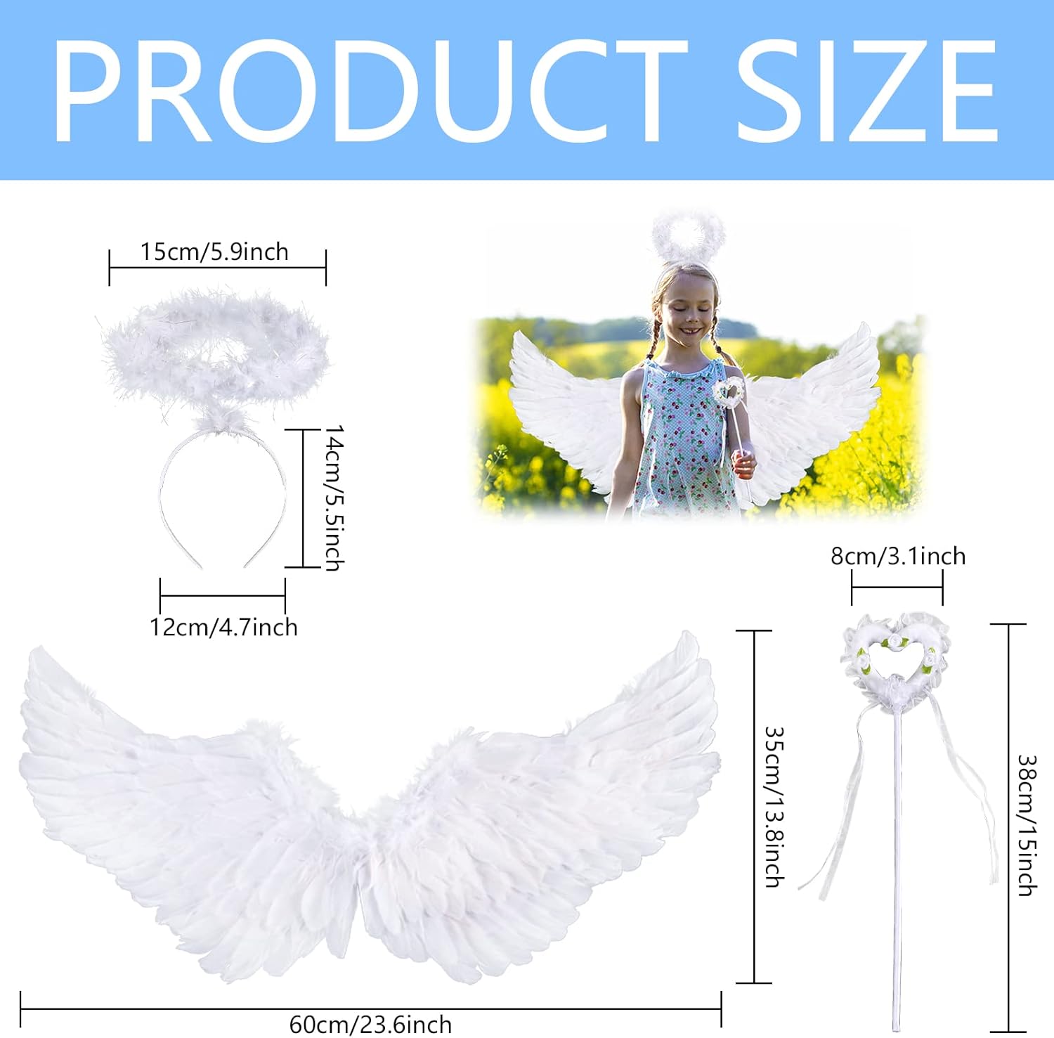 Set di 3 ali d'angelo: il kit di ali d'angelo contiene 1 ali d'angelo con piume, 1 fascia con paillettes, 1 bacchetta magica. Questa è un'ottima combinazione di graziosi abiti da festa angelici. Taglia perfetta: taglia unica adatta alla maggior parte dei bambini. Le ali misurano circa 60 x 21 cm di lunghezza. Bacchetta magica: 34 x 8 cm, fascia con paillettes: 12 x 14 cm. Materiale: le ali d'angelo, la fascia per capelli e la bacchetta magica sono tutti realizzati con materiali di alta qualità, design durevole e unico, alta qualità, design elastico, consistenza confortevole e morbida. Design unico: Ali con bacchetta magica e aureola - Dona una bellezza contrastante che risalta dalle ali bianche. Sono ideali per oggetti di scena per Pasqua, matrimoni, compleanni, Cupido e attività scolastiche, sarai sicuramente apprezzato da tutti. 【Servizio】 Se hai domande sul prodotto, puoi contattarci direttamente e saremo felici di risponderti per te. Cominciamo con le decorazioni per le feste per le prossime riunioni di famiglia.