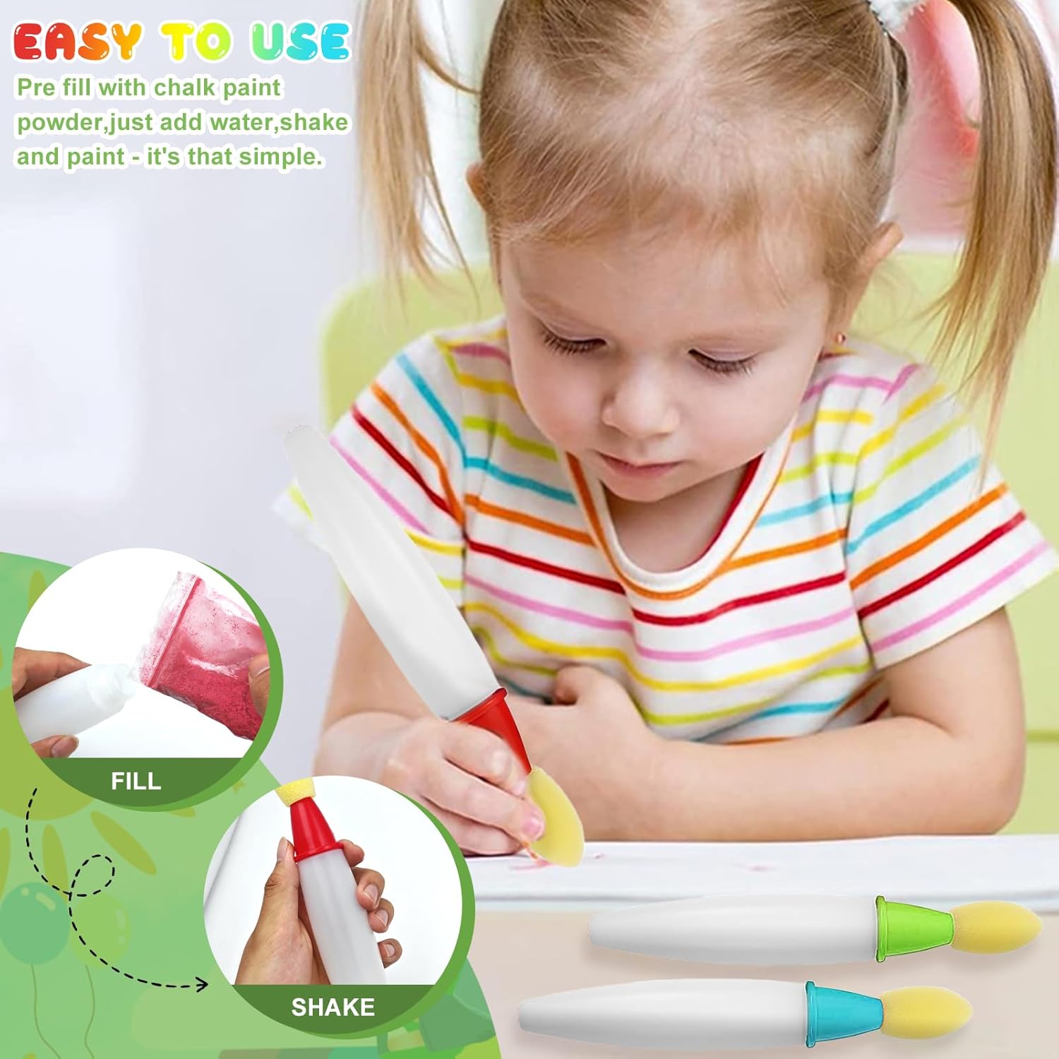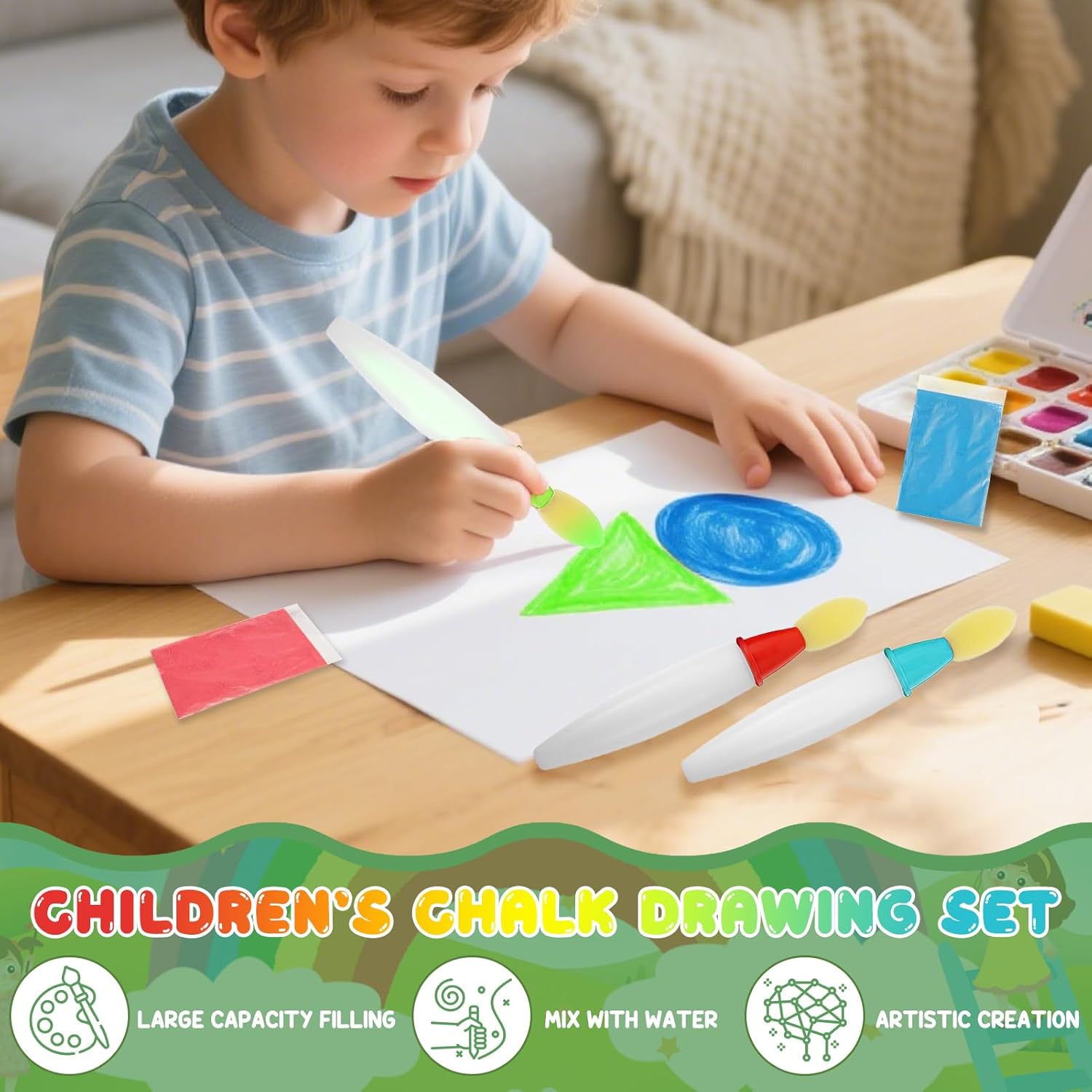Set creativo: questo set di pennelli per acquerello contiene 3 pennelli e 3 polveri colorate (blu, verde e rosso), con cui i bambini possono creare facilmente opere d'arte colorate. Con semplici passaggi: riempire la polvere, aggiungere acqua, agitare e iniziare a dipingere, i bambini possono dare libero sfogo alla loro immaginazione ed esprimersi in modo creativo su carta o altre superfici Interazione genitore-bambino: il processo semplice e divertente di miscelazione e pittura non solo favorisce la percezione del colore e l'ispirazione artistica dei bambini, ma offre anche ai genitori una preziosa opportunità per interagire di alta qualità. Creare un'opera d'arte insieme promuove l'immaginazione e le capacità motorie dei bambini, mentre i genitori possono approfondire il legame emotivo attraverso la collaborazione, ideale per attività all'asilo o weekend in famiglia Colori versatili: polveri selezionate in colori di base altamente saturi blu, verde e rosso. Tinta unita creano toni puri e brillanti, grazie alla miscela si creano diversi colori di transizione, ideali per semplici scarabocchi fino a fine artigianato Design multifunzionale: i pennelli per acquerelli leggeri e compatti sono perfetti per la casa, la scuola o in viaggio. Le polveri colorate non sono adatte solo per carta, ma anche per legno, tessuto, pelle, cartone e altre superfici: ideali per scarabocchi, regali fatti a mano, biglietti di invito e molto altro ancora 【Per tutte le occasioni: più di un semplice giocattolo, questo set è un materiale educativo creativo che insegna ai bambini in modo giocoso, espressione artistica e coordinazione occhio-mano. I bambini possono dipingere in soggiorno, creare regali personalizzati per adulti, e nelle scuole o nei campi di vacanza è perfetto per progetti artistici di gruppo: un set per idee creative in famiglia, istruzione e vita sociale