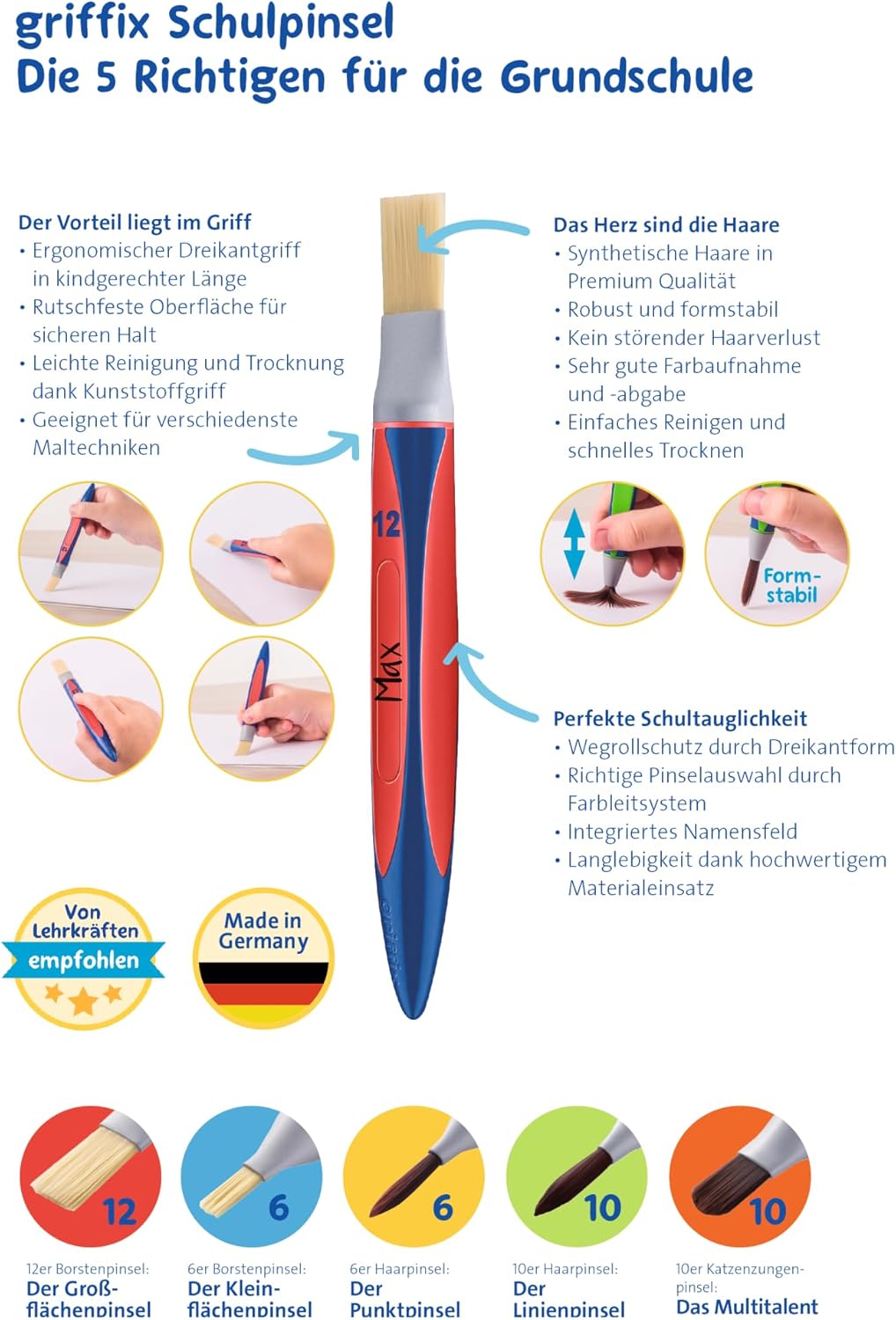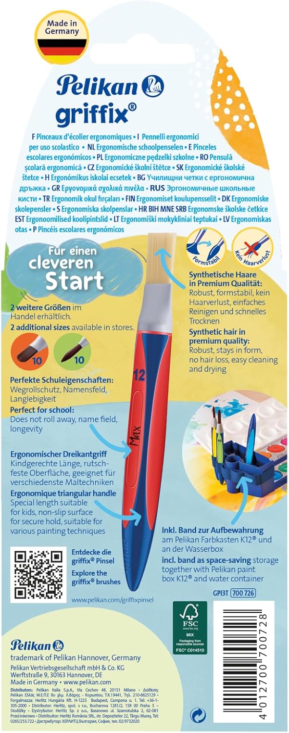 Libertà creativa in un pratico set da 3: i nuovi pennelli Griffix di Pelikan sono la scelta perfetta per le scuole primarie per affrontare tutte le sfide delle lezioni d'arte. Sono adatti per dipingere superfici, punti e linee - completamente in linea con il curriculum e a misura di bambino. Le spazzole Griffix offrono un manico triangolare ergonomico di lunghezza adatta ai bambini e una superficie antiscivolo per una presa sicura. I capelli sintetici sono robusti e dimensionalmente stabili, senza fastidiose perdite di capelli. La forma triangolare ne impedisce il rotolamento e un sistema di codifica a colori facilita la scelta della spazzola giusta. Un campo per il nome integrato garantisce l'ordine e l'assegnazione personale. Contenuto della confezione: 3 spazzole, dimensioni spazzole: 6 (spazzola con setole), 12 (spazzola con setole), 6 (spazzola per capelli).