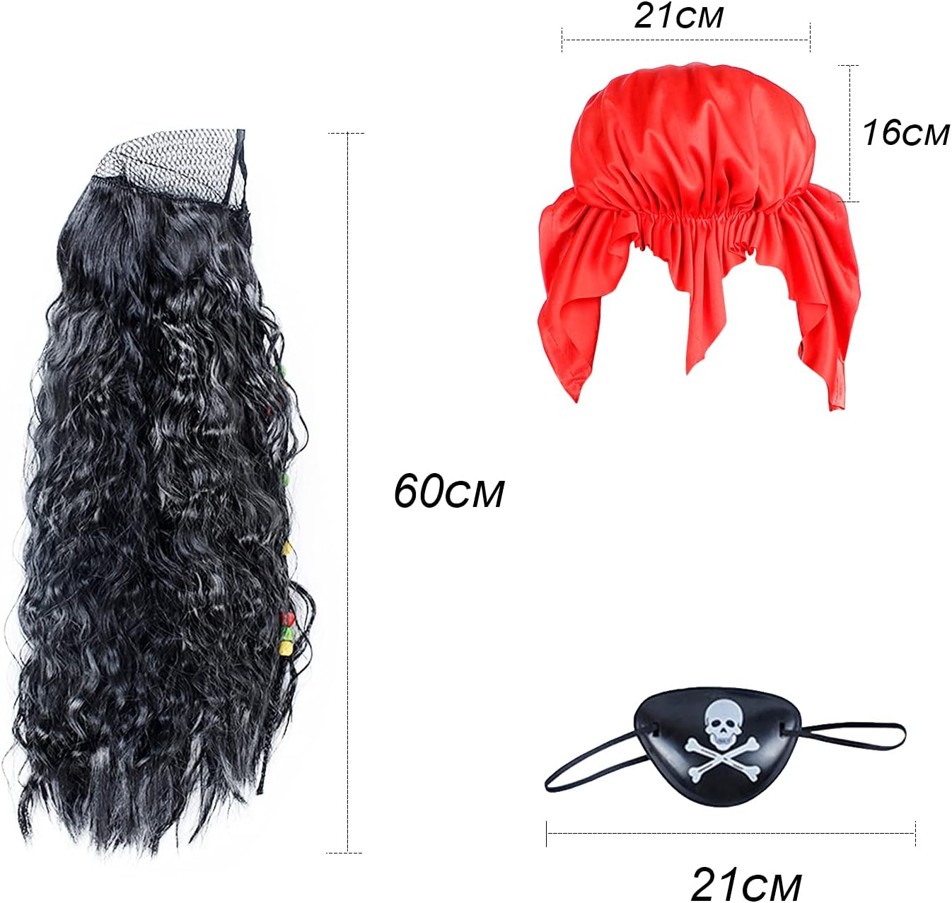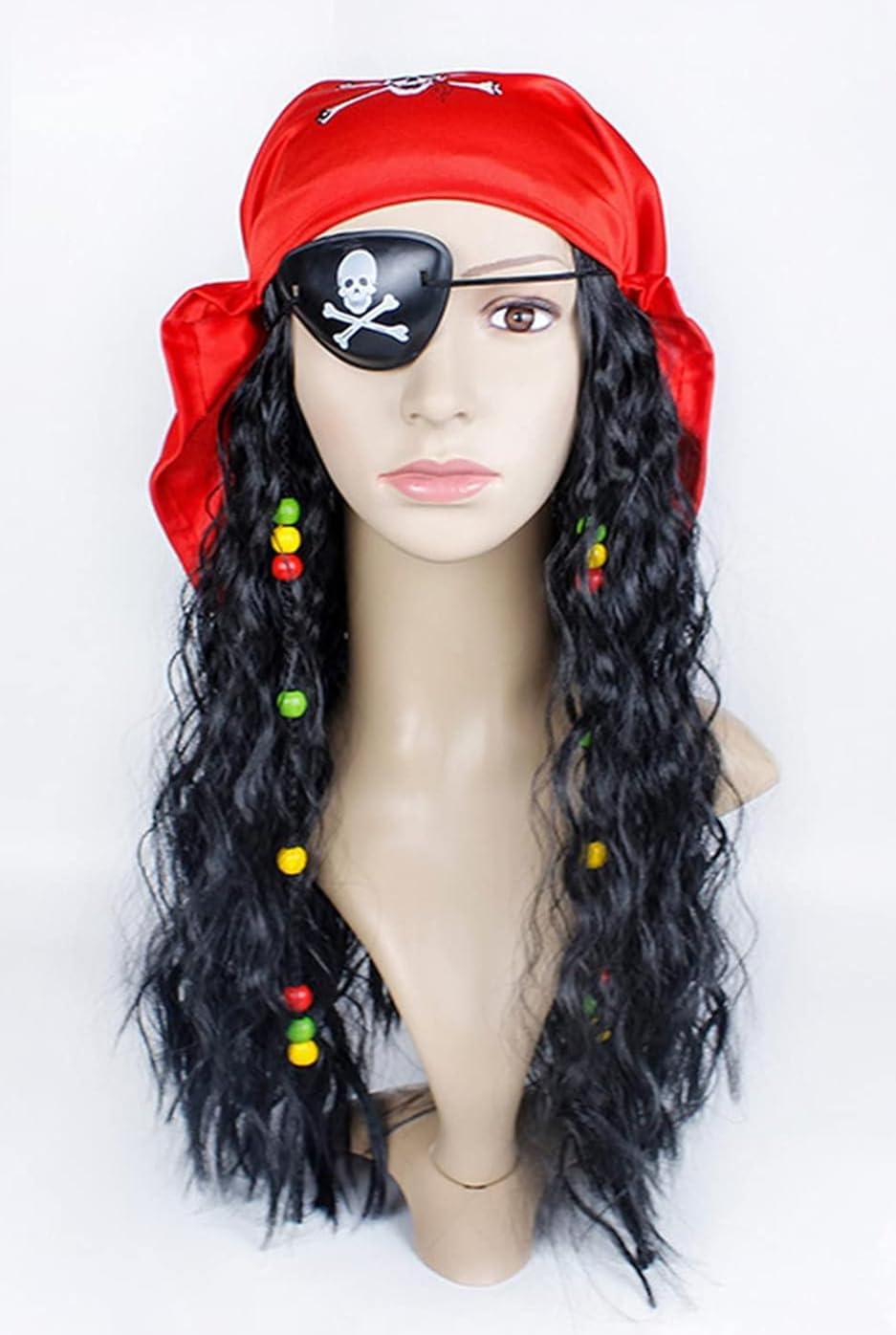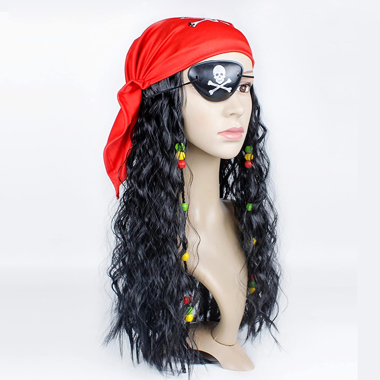 ▶ Cappuccio elastico regolabile per capitano pirata, comodo per regolare la tenuta, quindi è adatto per la maggior parte delle dimensioni della testa, compresi adulti adolescenti e bambini. ▶ Set di 3 accessori da pirata per bambini e adulti, realizzati in poliestere di alta qualità, traspiranti e assorbenti il sudore. ▶ Toppa nera con teschio bianco e ossa incrociate, aggiungendo un significato divertente e simbolico dell'identità dei pirati, con elastico nero intorno alla testa. ▶ Capelli lunghi neri ricci da pirata, che coprono i capelli originali, migliori accessori per il gioco di ruolo di Halloween, adatti per la maggior parte degli adolescenti e degli adulti. Adatto per giochi di ruolo, feste di Halloween, feste in maschera, spettacoli scolastici, balli in maschera, accessori per feste in maschera e come perfetto abbinamento per il tuo costume da pirata.