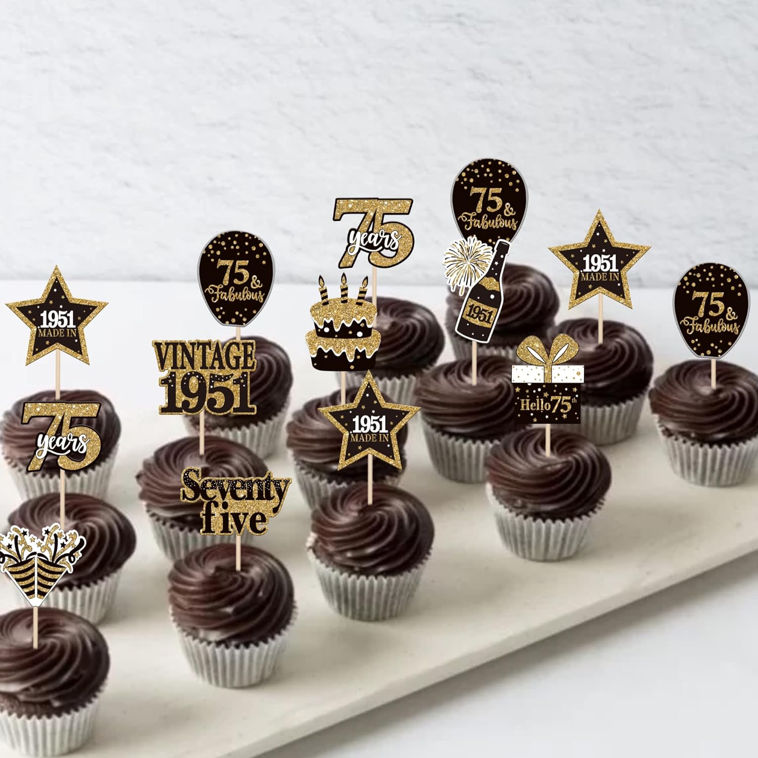 Materiale: i nostri toppers per cupcake sono realizzati in cartone glitterato su un solo lato spesso di alta qualità. Confezione: contiene toppers cupcake da 36 pezzi. che può soddisfare le tue diverse esigenze di decorazione, questi toppers cupcake sono preassemblati, puoi usarli direttamente quando li ricevi. Dimensioni: La dimensione è 2,7" x 4,3"/2,7" x 4,2"/2,3" x 4,2"/2,3" x 4,2"/2,3" x 4,2"/2,3" x 4,2"/5,2 x 10,6 Applicazione: Decorazione perfetta per cupcake, biscotti, torte, frutta, brownies, gelati e altro ancora, particolarmente adatta per feste a tema vintage 1949, prost a 75 anni anniversario di matrimonio 75 anni festa a tema decorazioni per cupcake per feste a tema.