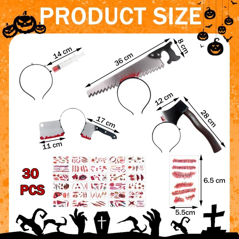 Set di 4 accessori decorativi per Halloween: 30 adesivi per tatuaggi cicatrici, fasce per capelli di Halloween, fasce per capelli con coltellino e ascia - Adatti per scherzi di Halloween e accessori per costumi di carnevale