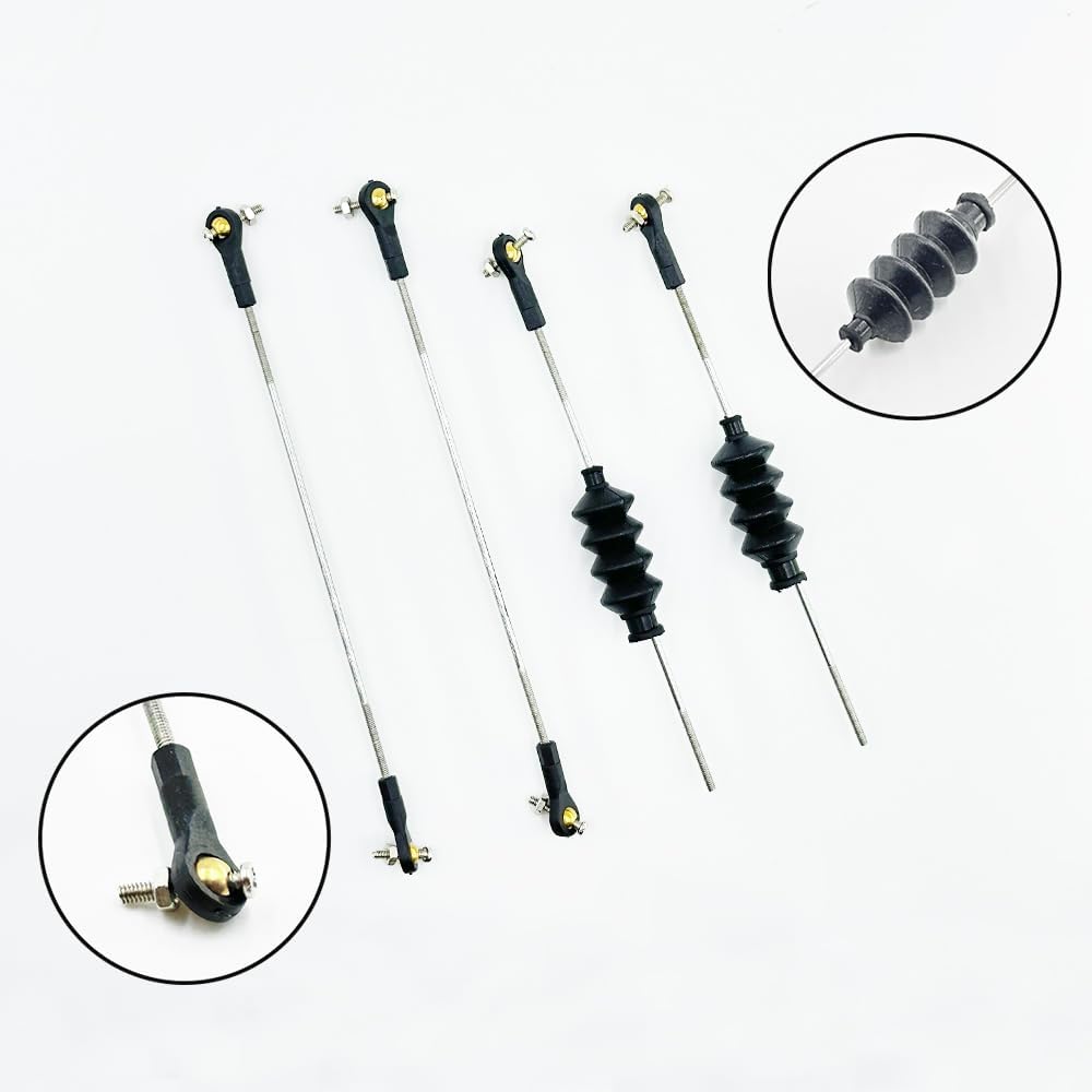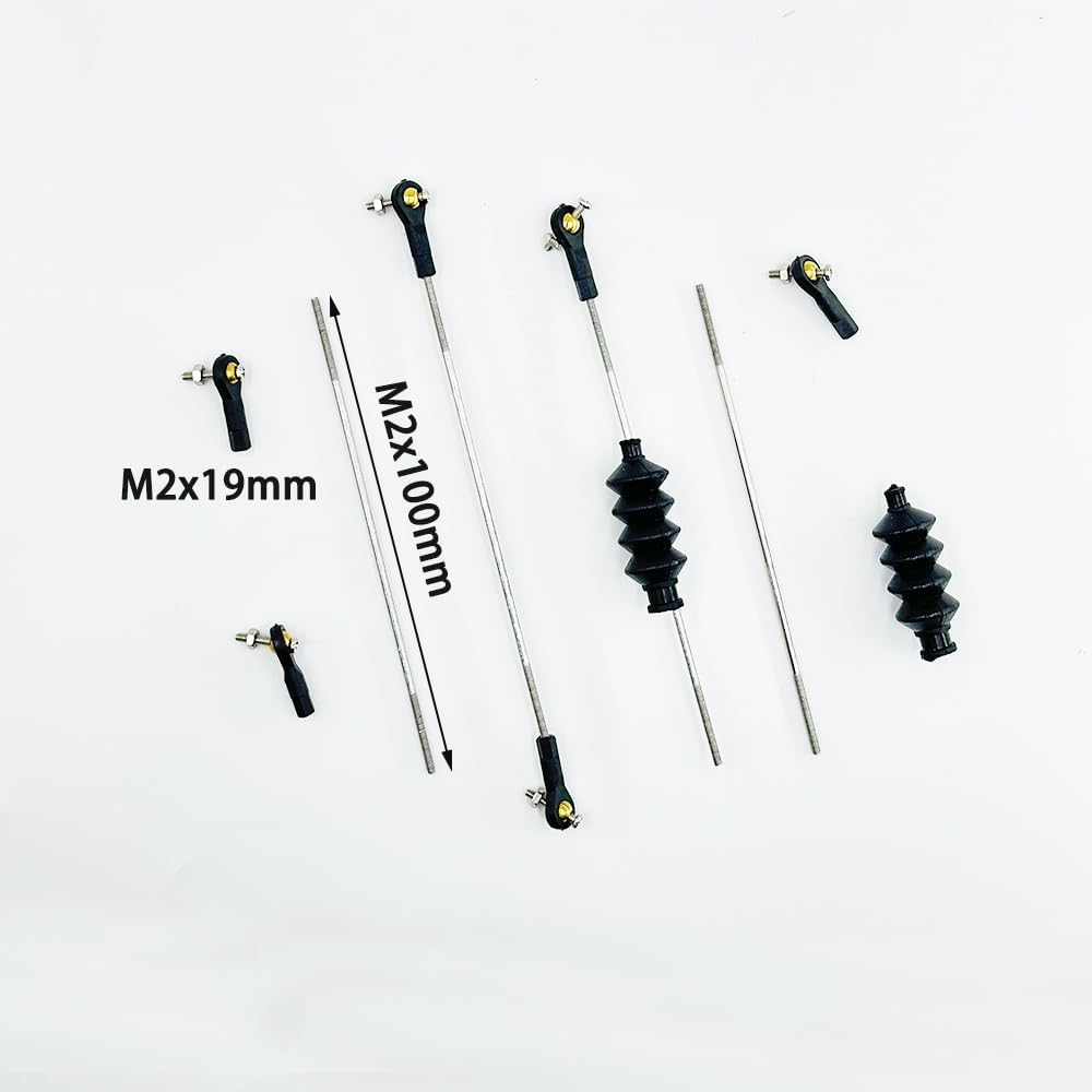 Dimensioni asta di spinta: filettatura M2, lunghezza 150 mm Dimensioni guarnizione in gomma: lunghezza 35 mm Dimensioni estremità tirante: filettatura M2, lunghezza 19 mm Quantità: 4 aste di spinta, 6 tiranti M2, 2 soffietti di tenuta Applicazione: set di 4 aste di spinta per barche RC M2 in plastica con estremità a sfera con viti e asta, guarnizione in gomma per barca RC, nave, aeroplano, parti di costruzione di giocattoli modello fai da te
