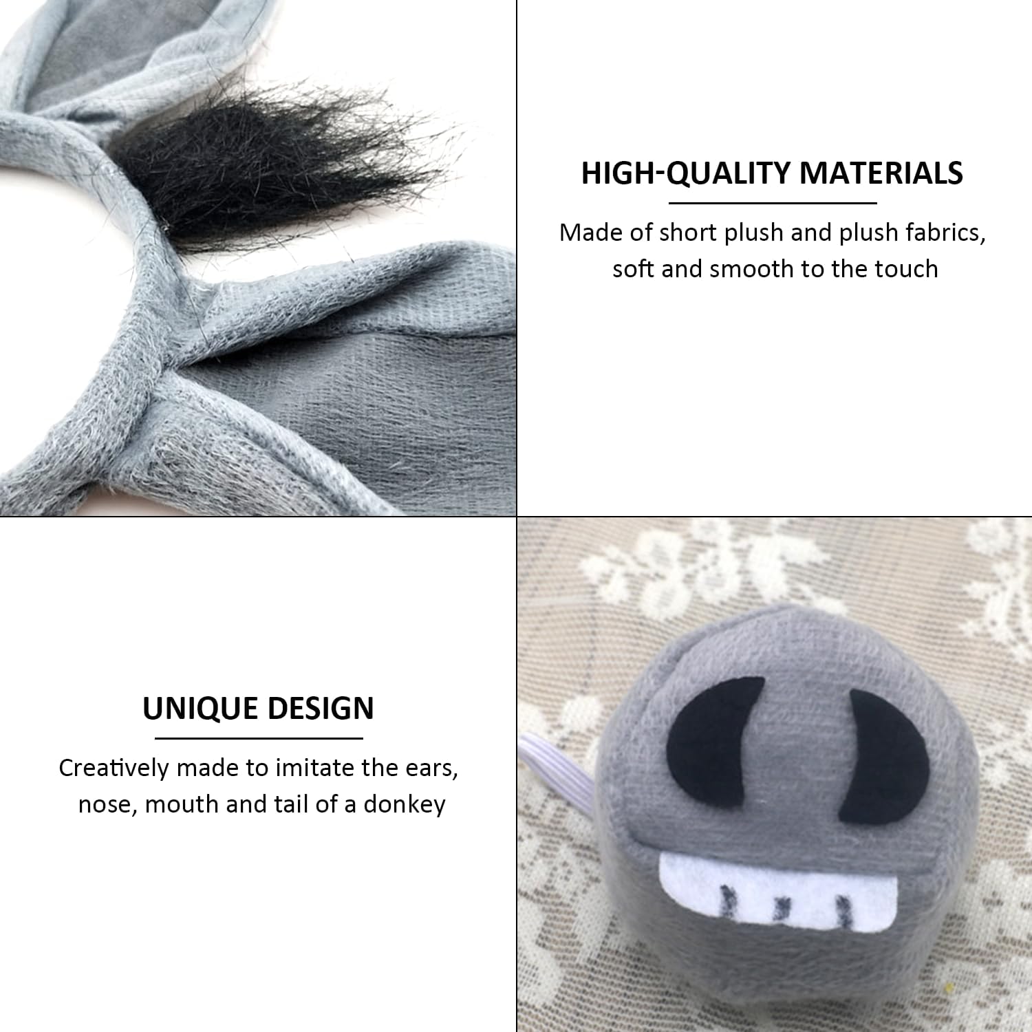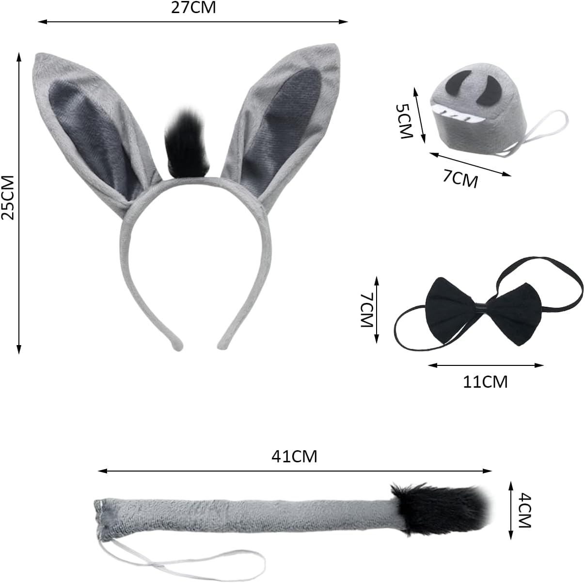 [Contenuto del prodotto] Riceverai un set di costume da asino grigio da 4 pezzi, tra cui orecchie da asino, coda d'asino, naso d'asino e 1 papillon, adatto per bambini e bambini per giocare asini. [Materiale del prodotto] Realizzato in peluche corto e peluche, la consistenza è morbida e liscia al tatto. Non irrita la pelle ed è durevole, rendendoti più comodo e comodo da indossare. [Design unico] Il design unico della forma è realizzato imitando le orecchie, il naso, la bocca e la coda di un asino. È creativo e consente ai bambini di svolgere felicemente il ruolo di un asino. È carino e interessante. [Facile da usare] Questo set di vestiti è facile e veloce da indossare, non c'è bisogno di preoccuparsi della messa a punto, puoi semplicemente indossarlo per mostrare un'immagine alla moda e carina, ed è facile da pulire, basta sciacquare con acqua tiepida e asciugare e può essere riutilizzato. [Ampia applicazione] Questo set di costumi da asino grigio da 4 pezzi è adatto per diverse occasioni, che si tratti di attività all'aperto, feste, spettacoli scolastici o riunioni di famiglia, può renderti il centro dell'attenzione. Può essere usato come regalo per la famiglia e i bambini.