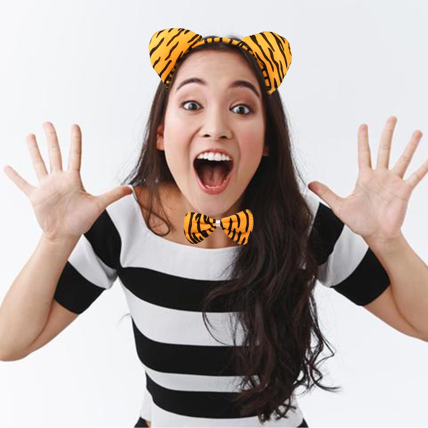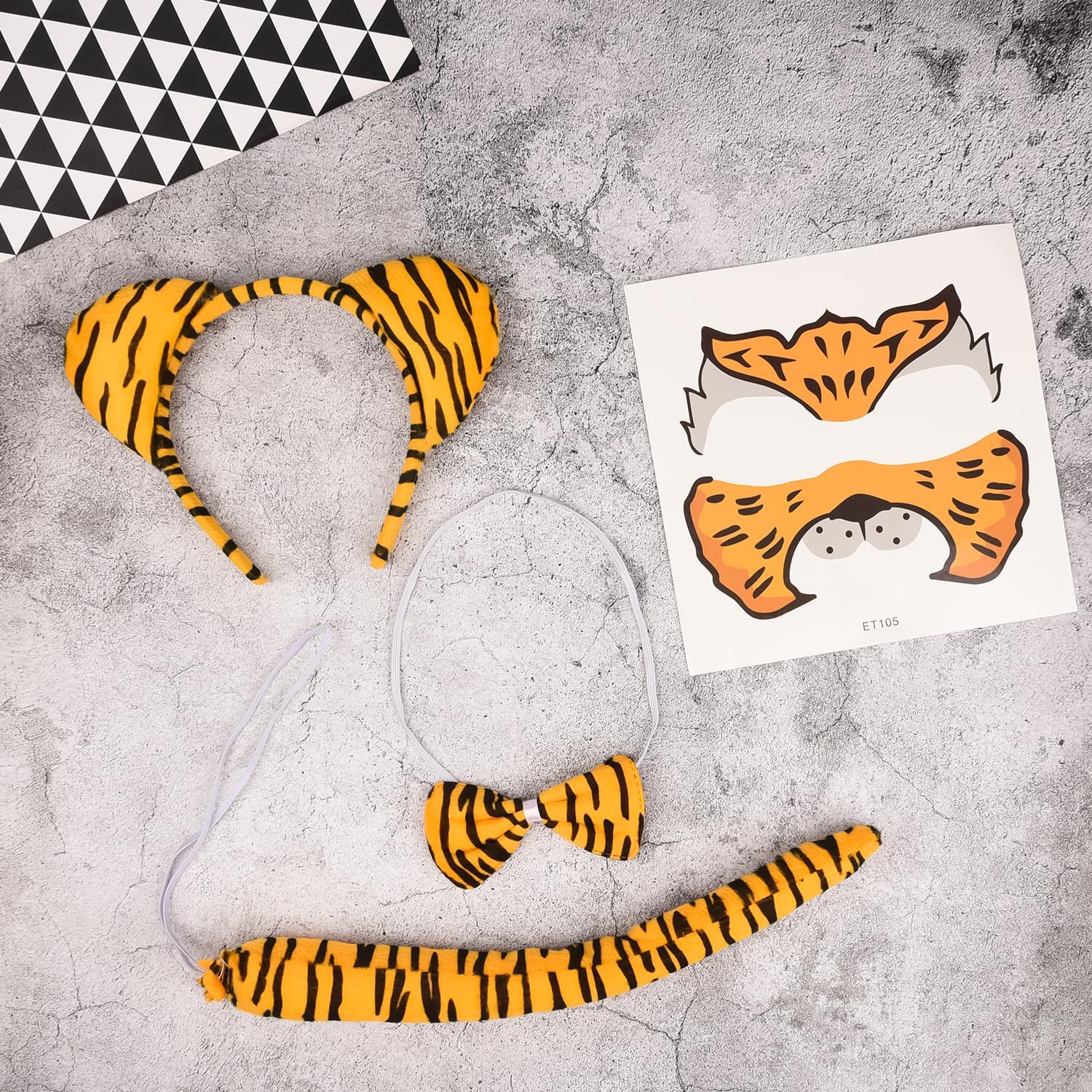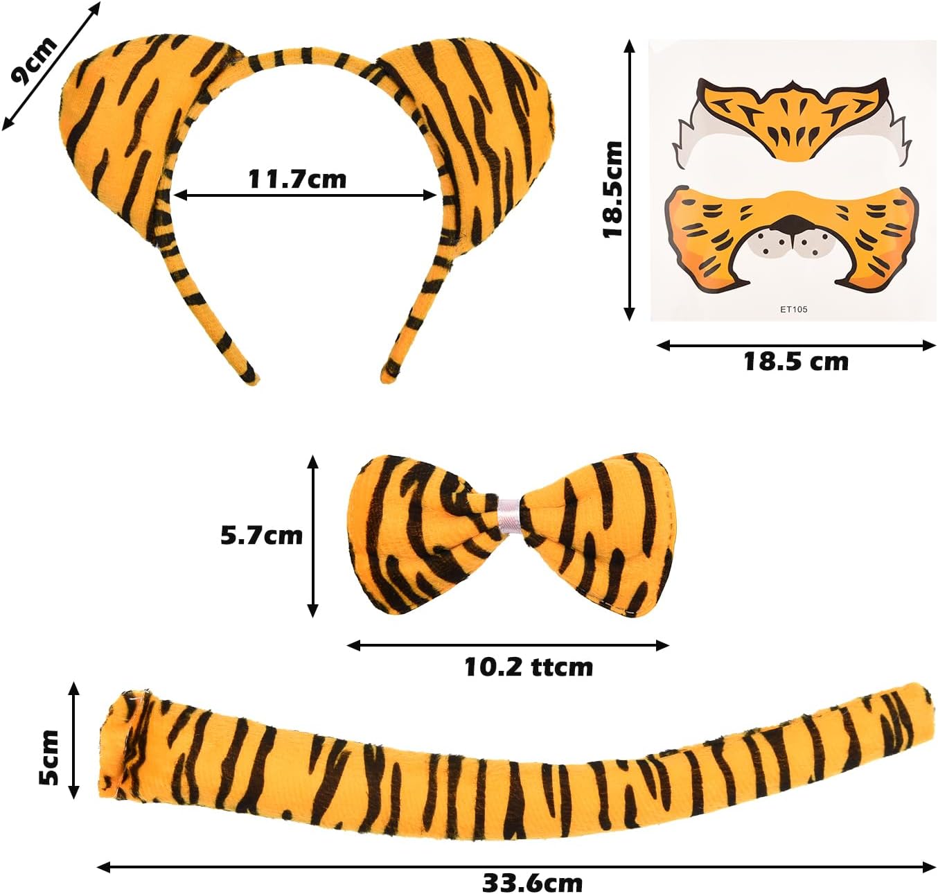Accessori per costumi di animali per Halloween, Carnevale, Cosplay, set di costumi per animali con fascia a farfalla rimovibile, tatuaggio temporaneo Caratteristiche: -La confezione include: fascia per capelli, papillon, coda di tigre in peluche e adesivo per tatuaggio sul viso. - Flessibile, adatto alla maggior parte delle persone. - Può essere facilmente indossato e dona un tocco sexy e affascinante alla tua festa. - Questo set di animali della giungla è leggero e comodo da indossare. - Ti fa diventare facilmente il centro dell'attenzione alla festa. Caratteristiche: Taglia: media. Adatto a persone: adulti e bambini. Contenuto: 4 costumi da tigre.