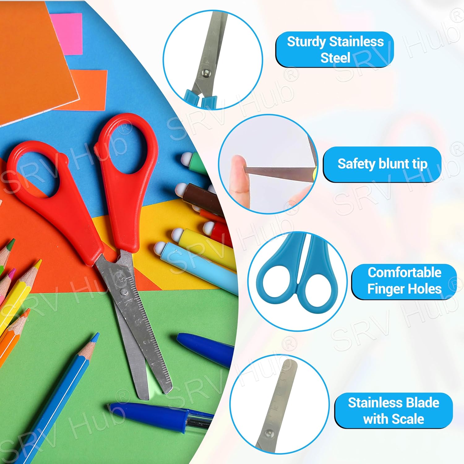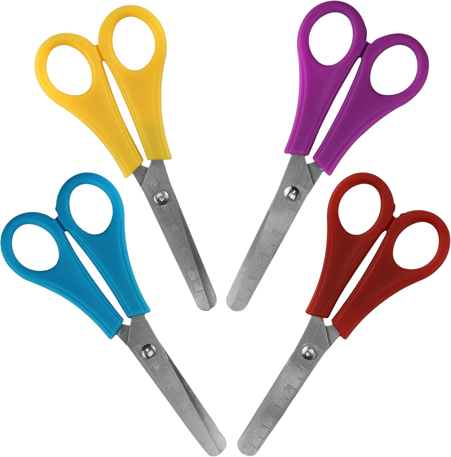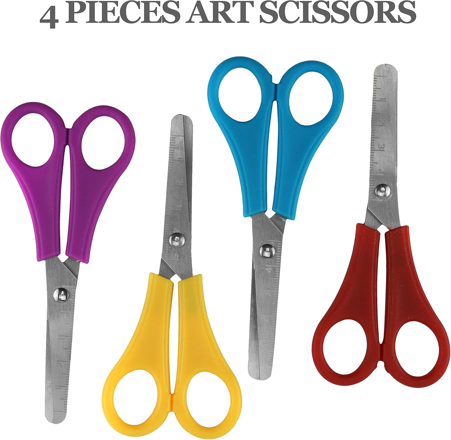 Contenuto della confezione: riceverete 4 forbici da cancelleria nei colori viola, giallo, blu, rosso). Basta tagliare strati di carta, schiuma, cartoncino, spago e altri materiali artigianali. ✂️ Materiale e dimensioni: queste forbici per box artistici sono realizzate in acciaio inossidabile di alta qualità con manici in plastica. Le dimensioni di ciascuna forbice sono 13 cm di altezza, 5,5 cm di larghezza e la lama del righello è di 5 cm. Ideale per i bambini a scuola e a casa. ✂️Divertimento creativo: queste forbici per cancelleria sono accessori artistici per bambini per aumentare la loro creatività e divertimento per i bambini dai 3 anni in su. Ideale per realizzare lavori artigianali con carta, poster e altri oggetti artigianali. ✂️ Design sicuro e smussato: queste forbici per bambini non hanno punte affilate, il che le rende sicure per i bambini. La lama liscia offre buone prestazioni nel taglio della carta. Il design smussato, la punta arrotondata e il manico in plastica lo rendono più sicuro. ✂️ Multifunzionale: le forbici per bambini sono ideali per i bambini da utilizzare a scuola e nell'uso quotidiano. Queste forbici sono kit artigianali per bambini che possono essere utilizzati come strumenti di cancelleria per tagliare carta, cartoline, decorazioni fotografiche, libri di ricordi e carte regalo.