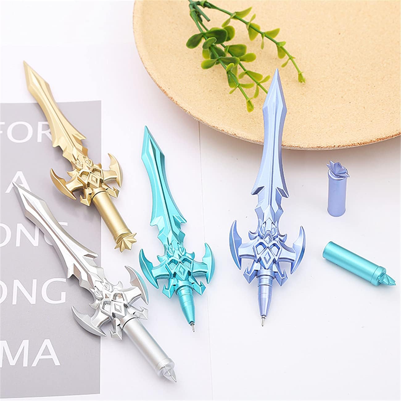 1. Contenuto della confezione: 4 pezzi/set (colori casuali / forma saranno spediti, non si può scegliere il colore, si prega di capire) 2. Forma: spada da guerriero 3. Colore della penna: nero o blu 4. Materiale principale: plastica PVC 5. Le simpatiche impostazioni per lo styling dei cartoni animati sono la scelta migliore per uso personale o come regalo