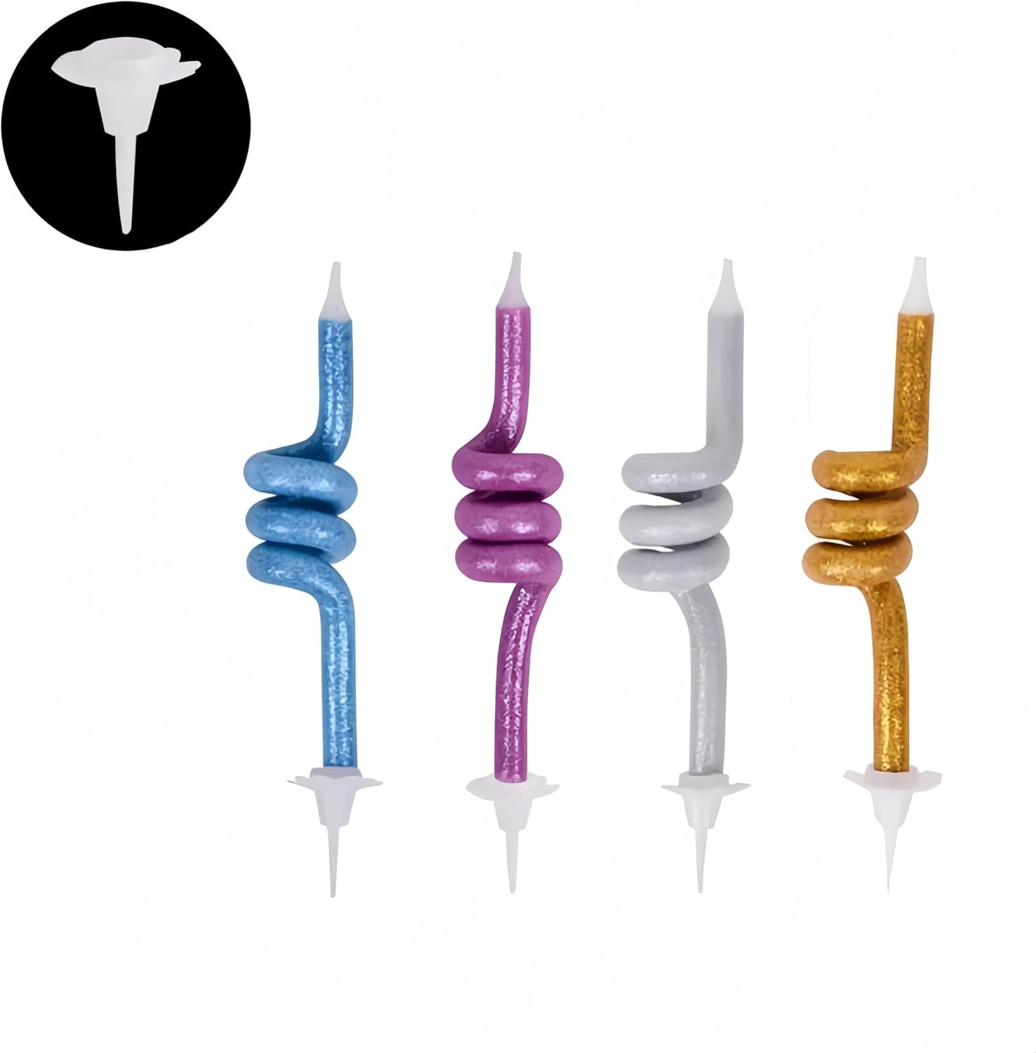 Design Artistico: Queste candele a spirale colorate e decorate con glitter aggiungono un tocco di eleganza e stile a qualsiasi ambiente. Varietà di Colori: Disponibili in quattro tonalità vivaci - blu, viola, argento e oro - per soddisfare i gusti di tutti. Lunga Durata: Realizzate con materiali di alta qualità, queste candele offrono ore di illuminazione e decorazione. Dimensione 8.30 di lunghezza e compreso anche sotto candele Versatilità: Ideali per feste, cerimonie o semplicemente per abbellire la tua casa con un tocco di luce e colore.