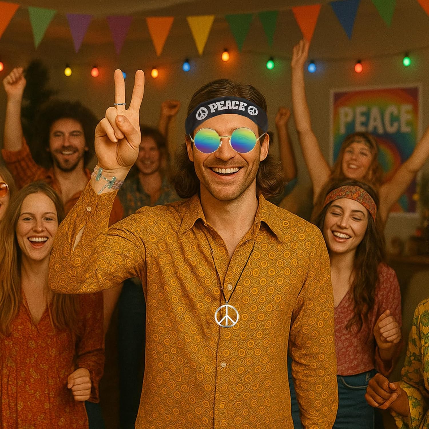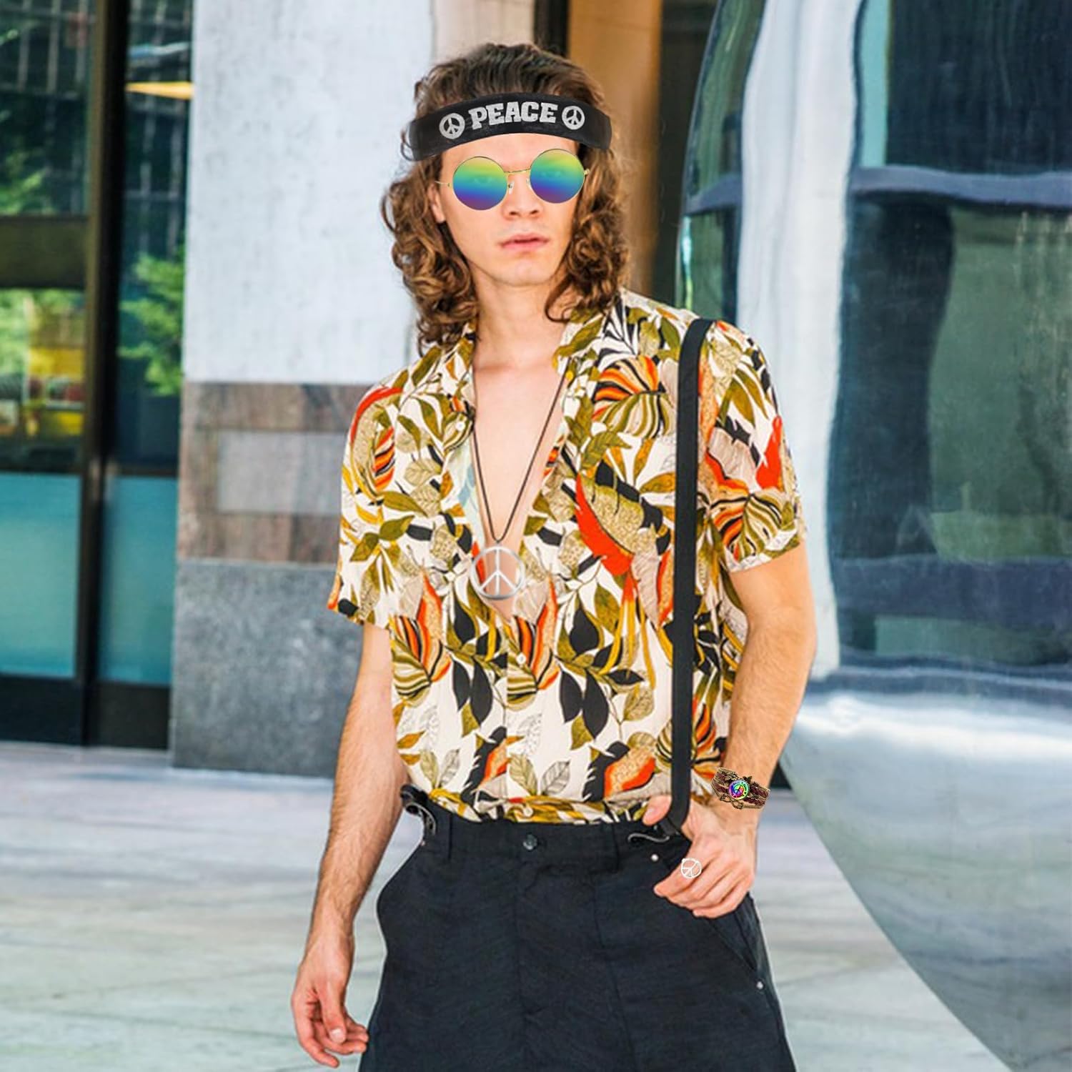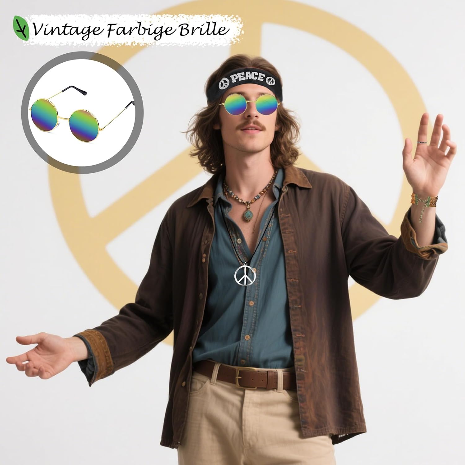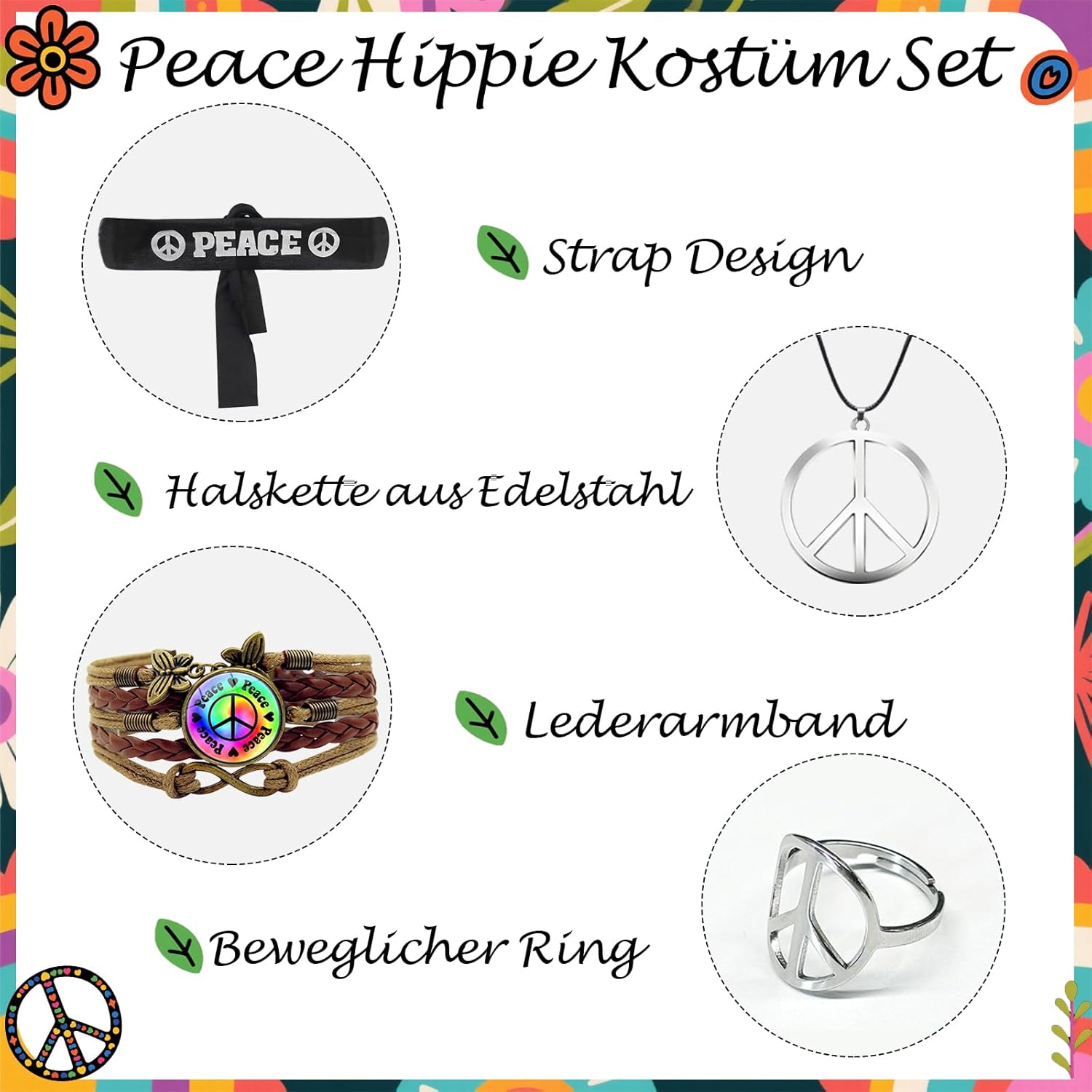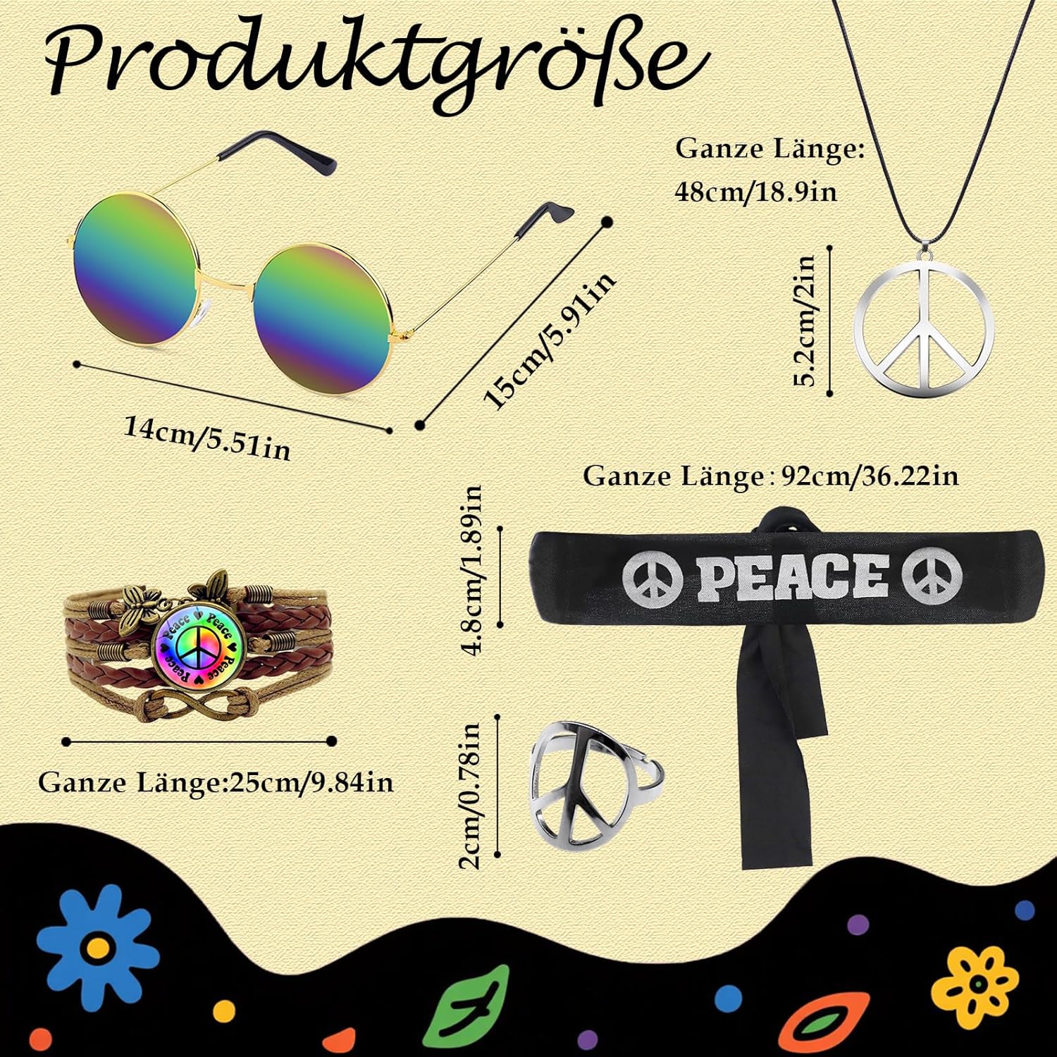 Set di 5 accessori Peace Hippie: include 1 fascia per capelli Peace, 1 paio di occhiali hippie colorati, 1 collana con segno di pace, 1 braccialetto e 1 anello. Gli accessori hippie sono perfetti per gli appassionati di cultura hippie, poiché possono essere combinati con diversi stili di abbigliamento. Materiali di alta qualità: la fascia è realizzata con materiali di alta qualità, morbidi e confortevoli. La catena e l'anello della pace in argento sono realizzati in acciaio inossidabile e possono essere utilizzati a lungo. Il cinturino marrone è realizzato principalmente in ecopelle e ha un design regolabile che può essere regolato in base alle dimensioni appropriate. Occhiali da sole retrò, leggeri e durevoli. Accessori retrò hippie: la fascia "Peace" adotta un design di cintura, adatto per le forme della testa della maggior parte delle persone. Occhiali colorati hippie eleganti e retrò. L'accessorio anni '60 e '70 imita la moda del tempo ed è l'accessorio perfetto per l'abbigliamento che vi riporta negli appassionati anni '60 e '70 Logo della pace: collane, anelli e bracciali sono tutti dotati di un logo Peace che rappresenta la speranza, la pace, la giocosità e la bellezza nella vita, in modo da poter emanare personalità e fascino unici! Ampiamente utilizzato: gli accessori per costume hippie sono perfetti per decorazioni vintage, feste a tema, cosplay, spettacoli sul palcoscenico, Halloween, costumi quotidiani, carnevale, festival musicali, costumi hippie e altre feste.