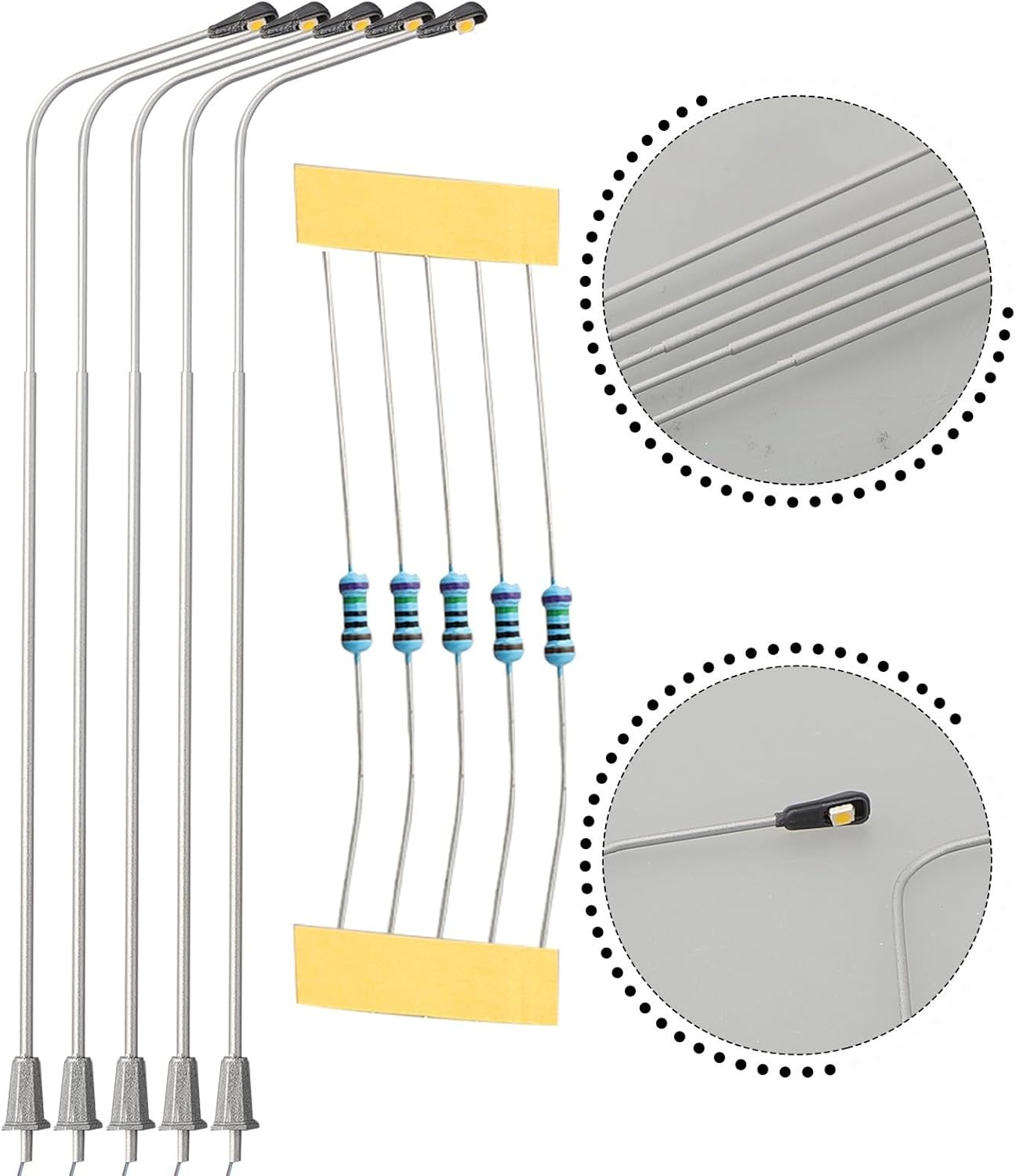 【Lampioni stradali per lampioni ferroviari】 - Perfetto per il layout di binari e edifici! - Realizzato con LED. - Adatto solo per tensioni di alimentazione da 3 V, non utilizzare su 12 V o 16 V per evitare danni ai LED. - Si raccomanda una corretta corrente di funzionamento di 20mA per ogni LED. - Scala: adatto per pista 0, Tensione di collegamento: 3V DC o AC, Amperaggio: 20mA. - Resistenze serie incluse per il collegamento a trasformatori 12-16V.