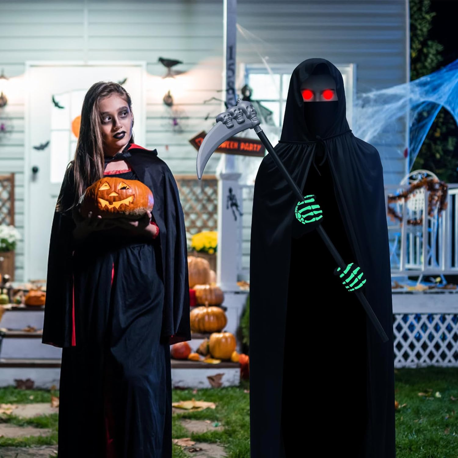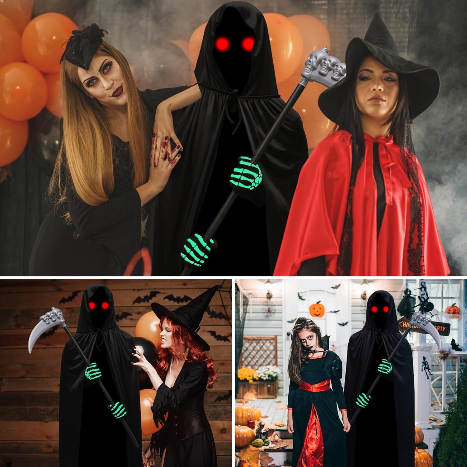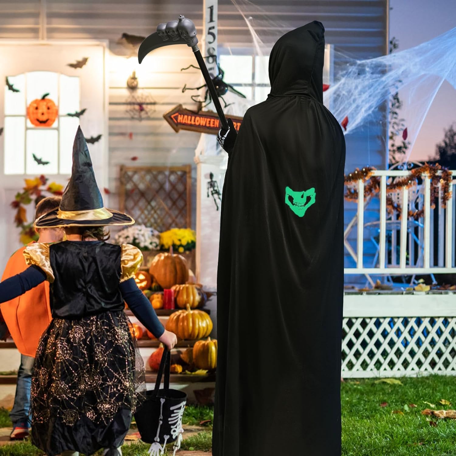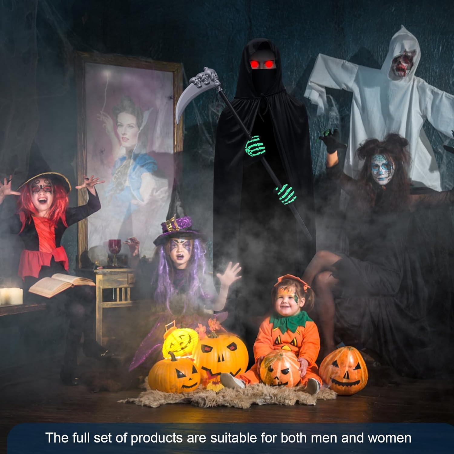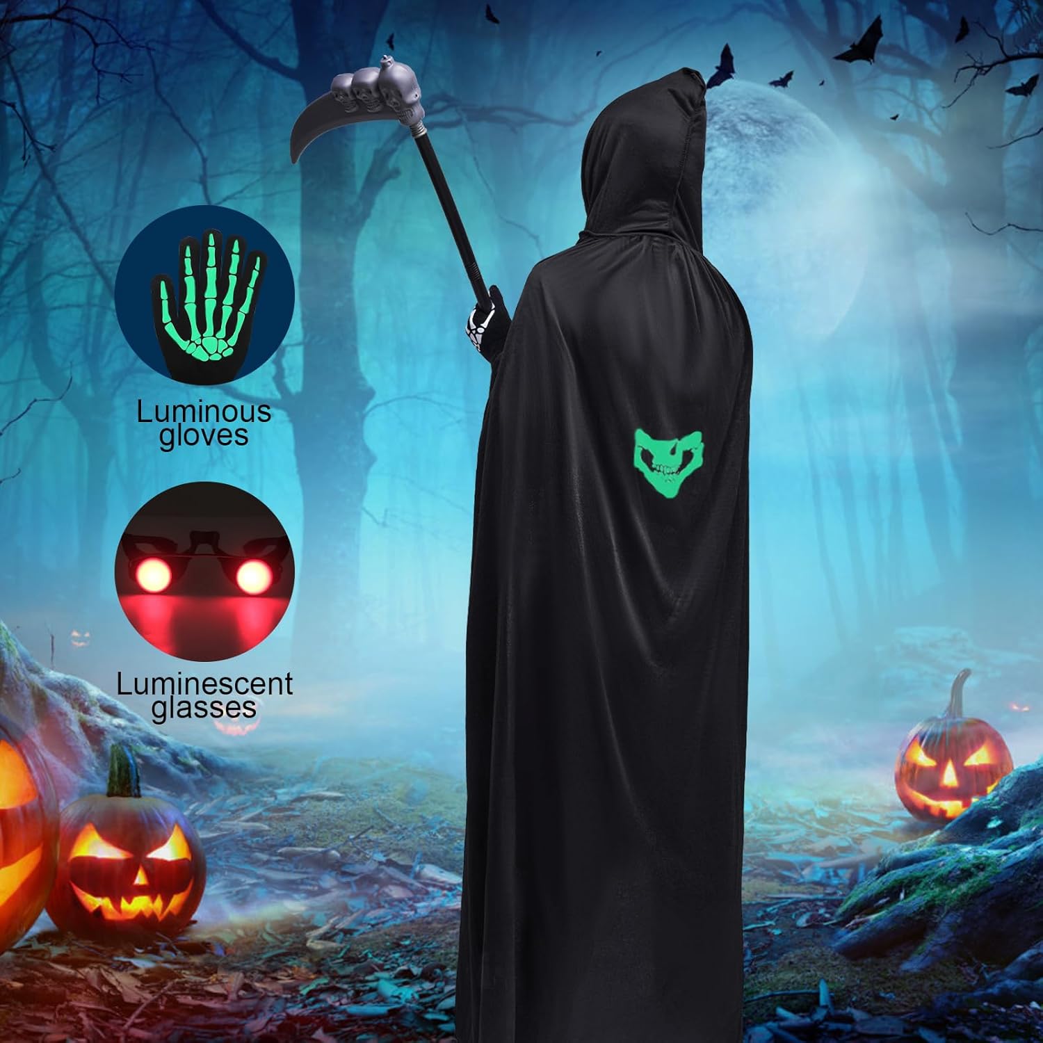 Specifiche: Materiale: poliestere, plastica. Colore: bianco e nero Dimensioni: Lunghezza del collo nero: 140 cm. Turbante: 25 x 50 cm. Guanti: 10 x 24 cm. Sense: 90 x 35 cm. Peso dell'imballo: 440 g Contenuto della confezione: 1 mantella con cappuccio. 1 sensore Mietitore 1 turbante con teschio. 1 paio di guanti da scheletro. 1 paio di occhiali luminosi. Attenzione: 1. Si prega di considerare un margine di errore di 1-2 cm a causa della misurazione manuale. 2. A causa della luce di ripresa e della differenza tra i monitor, l'immagine potrebbe non rispecchiare il colore reale dell'articolo. 3. Se avete domande sui nostri prodotti, vi preghiamo di contattare il servizio clienti in tempo. Risolveremo i tuoi dubbi per te.