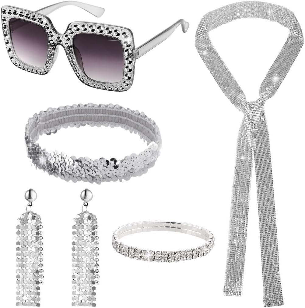 Colore: argento. Materiale: plastica. Dimensioni del prodotto: sciarpa: 152,4 x 4,1 cm. La confezione include: accessori da discoteca x 6 pezzi. Nota: - Si prega di fare riferimento alla misura. Si prega di considerare un piccolo margine di errore nelle misure. - Potrebbe esserci una piccola differenza di colore a causa del monitor, della fotocamera o di altri fattori, si prega di fare riferimento all'articolo fisico.
