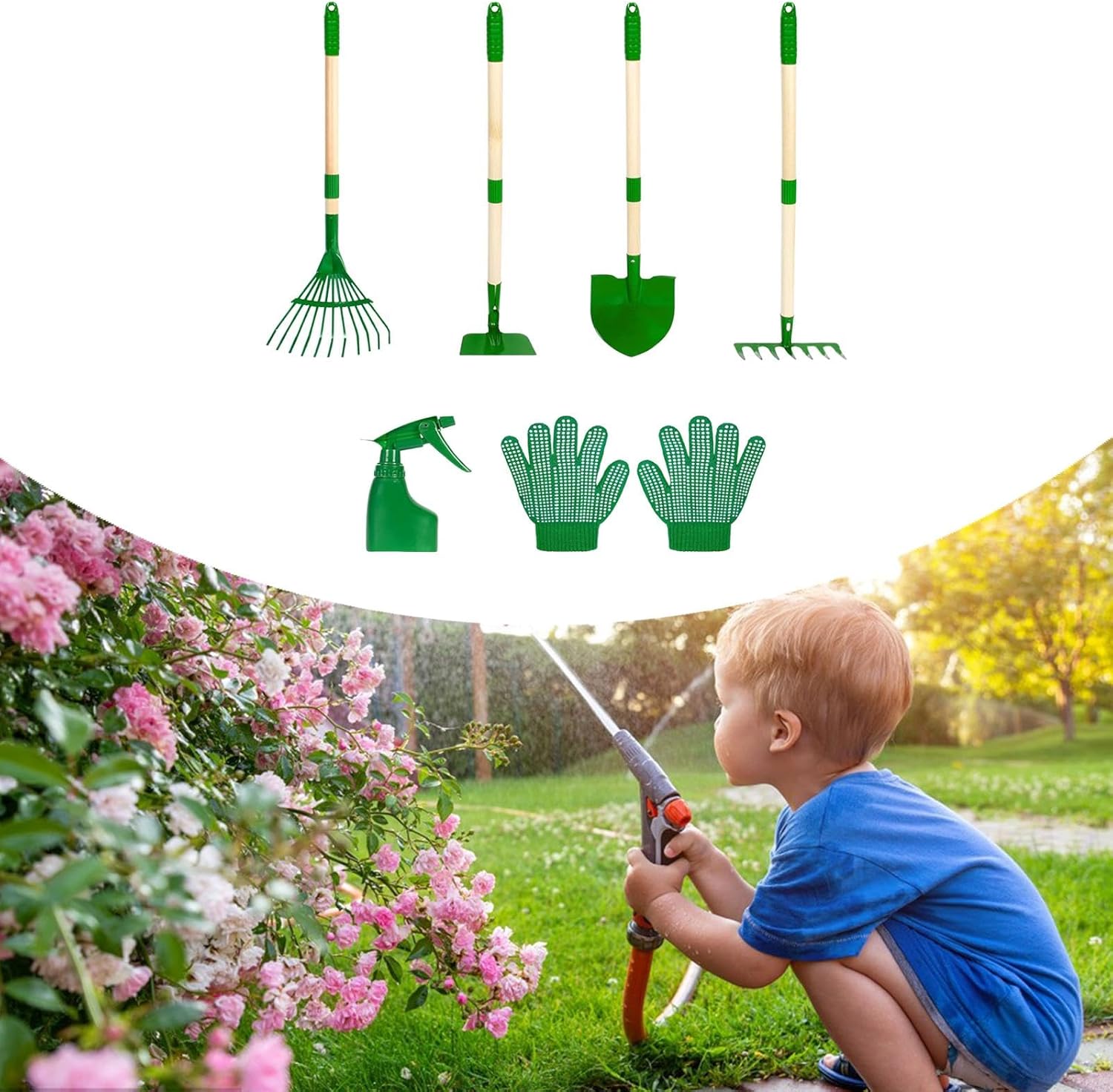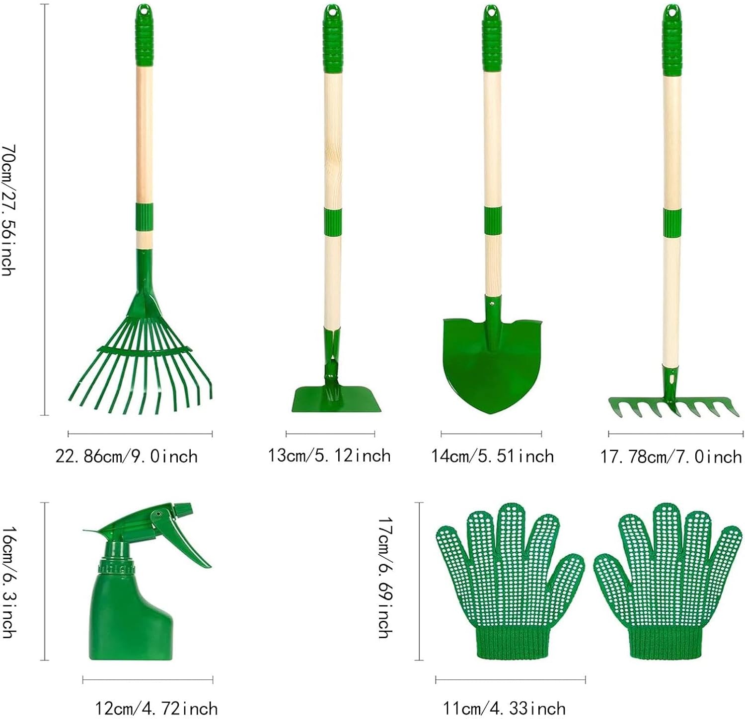 【Accessori da giardinaggio】: Set di attrezzi da giardinaggio per bambini, ottimo per il giardinaggio e la piantagione, aggiunge divertimento ai giochi di giardinaggio, ideale per incoraggiare l'interesse del tuo bambino per il giardinaggio 【Contenuto della confezione】: La confezione include 1 , 1 rastrello, 1 rastrello per foglie, 1 zappa, 1 paio di guanti, 1 flacone spray 【Un bel regalo】 Il set di attrezzi da giardinaggio per bambini è un ottimo regalo per i bambini, età consigliata dai 3 ai 7 anni 【Educativo】: i giocattoli da giardino per scavare le erbacce sono un ottimo strumento per apprendere abilità di vita quotidiana e migliorare le capacità motorie fini. Allo stesso tempo, i genitori possono interagire con i propri figli, insegnando loro a piantare e lasciandoli diventare i vostri assistenti di giardinaggio. 【Materiale】: Questo set di attrezzi da giardinaggio per bambini è realizzato in legno, ferro e materiale PP, robusto e durevole, non facile da danneggiare, garantendo un utilizzo a lungo termine