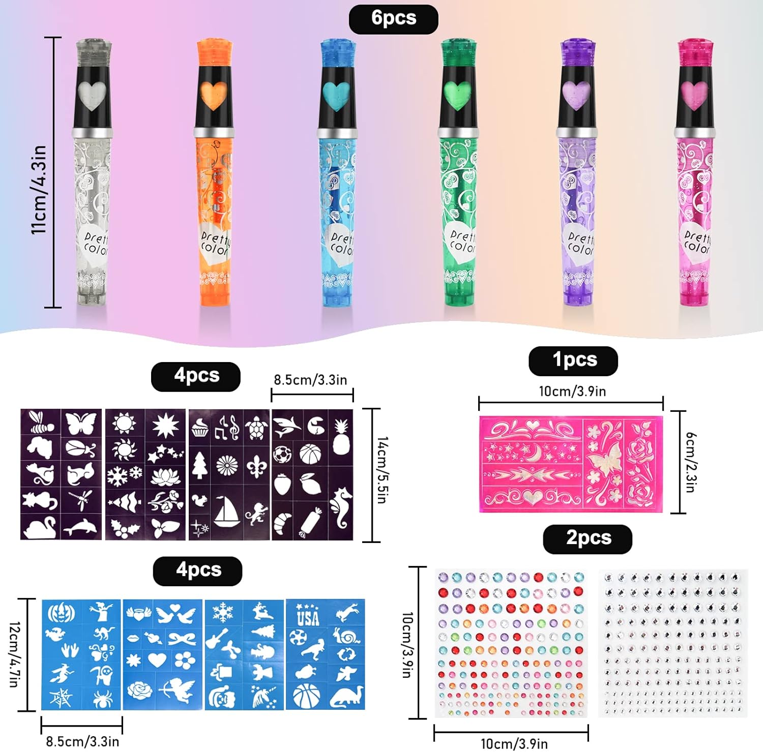 Set di tatuaggi glitterati in 6 colori: verde, rosa, arancione, argento, viola e blu, tatuaggi fai da te colorati che ti rendono il punto forte della festa in un batter d'occhio. Sicuro e delicato sulla pelle: innocuo per la pelle e sicuro da usare. Può essere utilizzato su braccia, gambe, viso, ecc. Nota: questo prodotto non è adatto per l'uso su labbra, occhi o pelle sensibile. Pulizia facile e conveniente: non c'è bisogno di preoccuparsi della rimozione del tatuaggio, basta rimuoverlo con acqua saponata senza lasciare residui. AMPIA APPLICAZIONE Il set di penne per tatuaggi è perfetto per feste di compleanno, Natale, Halloween, feste in costume, feste rave festive, ecc. Portalo con te per preparare una sorpresa per la tua festa. Set di 6 penne per tatuaggi con 8 stencil e 80 motivi e 2 adesivi con pietre preziose.