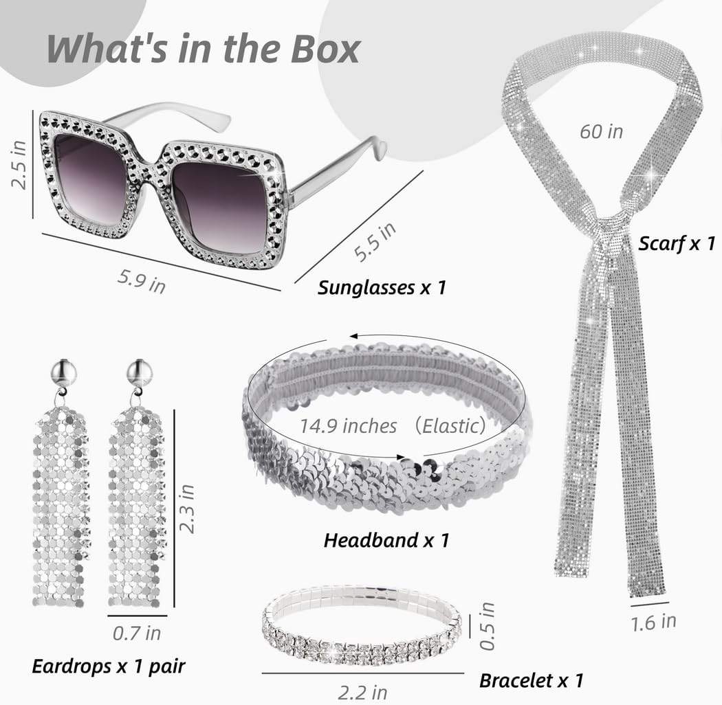 Set di 6 pezzi per costume da discoteca con paillettes, accessori per feste da donna, occhiali con strass, collana sciarpa, orecchini, fascia per capelli