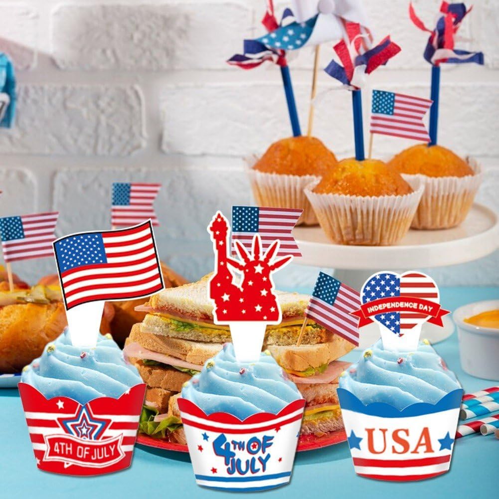 Decorazione cupcake del 4 luglio: sono fatti di carta, che può essere utilizzata a lungo. Plettri per cupcake con bandiera americana - Aggiunge l'atmosfera del Giorno dell'Indipendenza, particolarmente adatto per una festa a tema del Giorno dell'Indipendenza. Decorazione per dessert con bandiera USA: vengono utilizzati stuzzicadenti per cupcake per una cerimonia di festa patriottica o qualsiasi altra festa a tema americano. Topper per cupcake del Giorno dell'Indipendenza - Realizzato in materiale stabile, durevole e robusto per un uso a lungo termine. Il bastoncino è liscio e non fa male alle mani, è facile da tenere. Scelte per torta del Giorno dell'Indipendenza: possono abbinare diversi stili di torte per rendere le tue torte più attraenti. Puoi applicarli anche su gelati, frutta, biscotti e altri dessert.