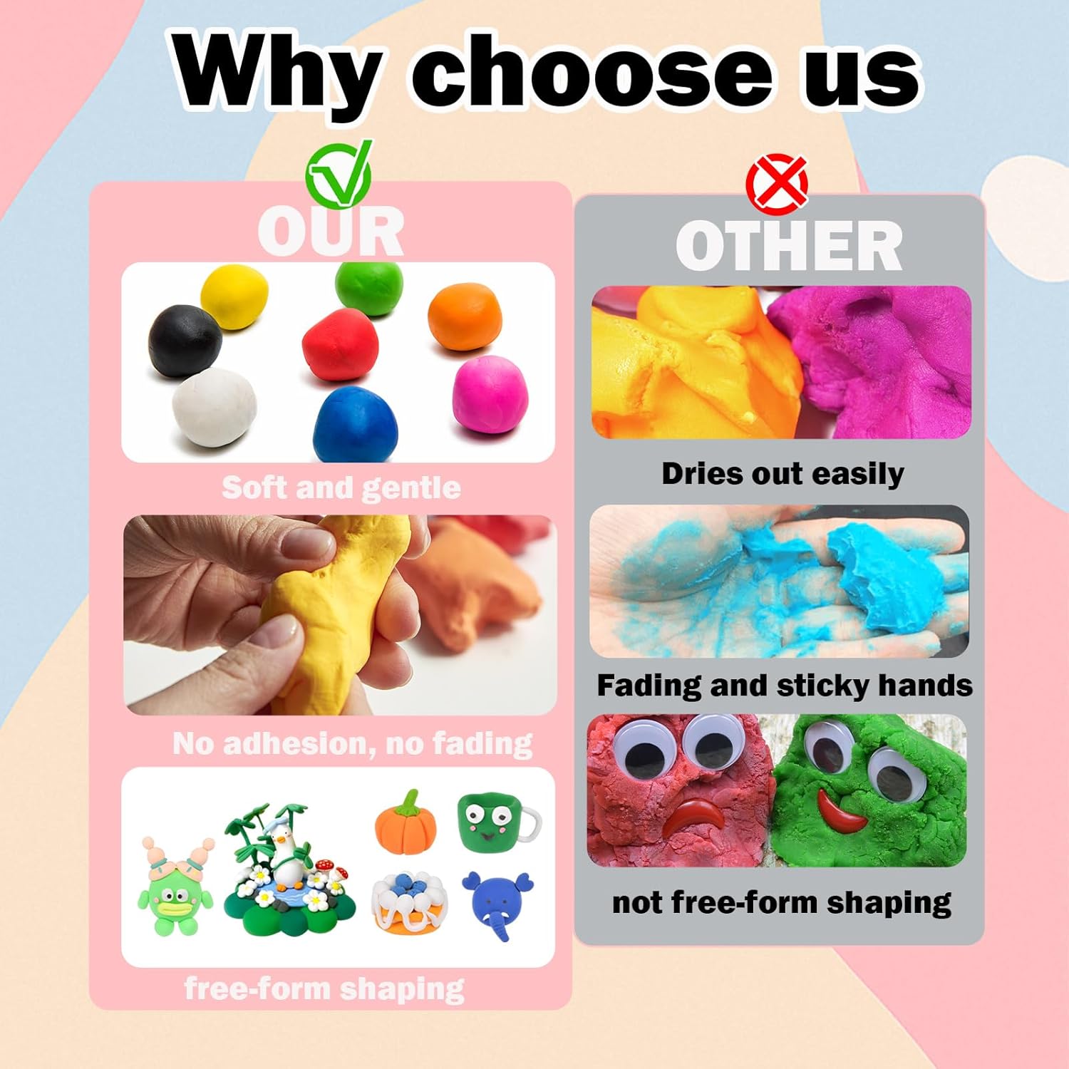 1. Ampia varietà di colori: questo set di pasta modellabile contiene 64 colori diversi, offrendo un'ampia tavolozza per stimolare la creatività dei bambini. I colori vivaci consentono ai bambini di creare opere colorate e sviluppare la loro immaginazione. Con così tante tonalità disponibili, le possibilità creative sono infinite, per momenti di gioco indimenticabili e gratificanti. 2. Asciugatura della pasta da modellare: la pasta da modellare di questo set è progettata per asciugare all'aria, consentendo ai bambini di conservare le loro creazioni una volta finite. Questa comoda funzionalità offre ai bambini l'opportunità di vedere le loro opere d'arte per sempre, prevenendo danni dovuti all'umidità. Questo lo rende un materiale ideale per creazioni che resistono alla prova del tempo. 3. Atossico e sicuro per i bambini: con la sicurezza dei bambini una priorità, questa pasta da gioco è realizzata con materiali atossici e sicuri. È appositamente progettato per i bambini dai 3 ai 12 anni. I genitori possono stare tranquilli, sapendo che il loro bambino potrà giocare con questo impasto senza rischi per la salute. Una scelta perfetta per momenti creativi e divertenti in tutta sicurezza. 4. Facile da maneggiare e modellare: l'argilla da modellare è morbida e facile da maneggiare, consentendo ai bambini di realizzare forme e sculture con grande facilità. Grazie alla sua consistenza malleabile, i bambini possono facilmente dare forma alle loro idee e dare vita alle loro creazioni, sviluppando allo stesso tempo le loro capacità motorie e artistiche. 5. Ideale per attività creative: questo set di pasta modellabile è perfetto per il fai da te e le sessioni di creazione a casa o in classe. Fornisce un'attività divertente ed educativa che stimola l'immaginazione dei bambini. Oltre ad essere un ottimo strumento per sviluppare la manualità, può essere utilizzato anche durante feste di compleanno o divertenti attività di gruppo, rendendo ogni momento ancora più piacevole.