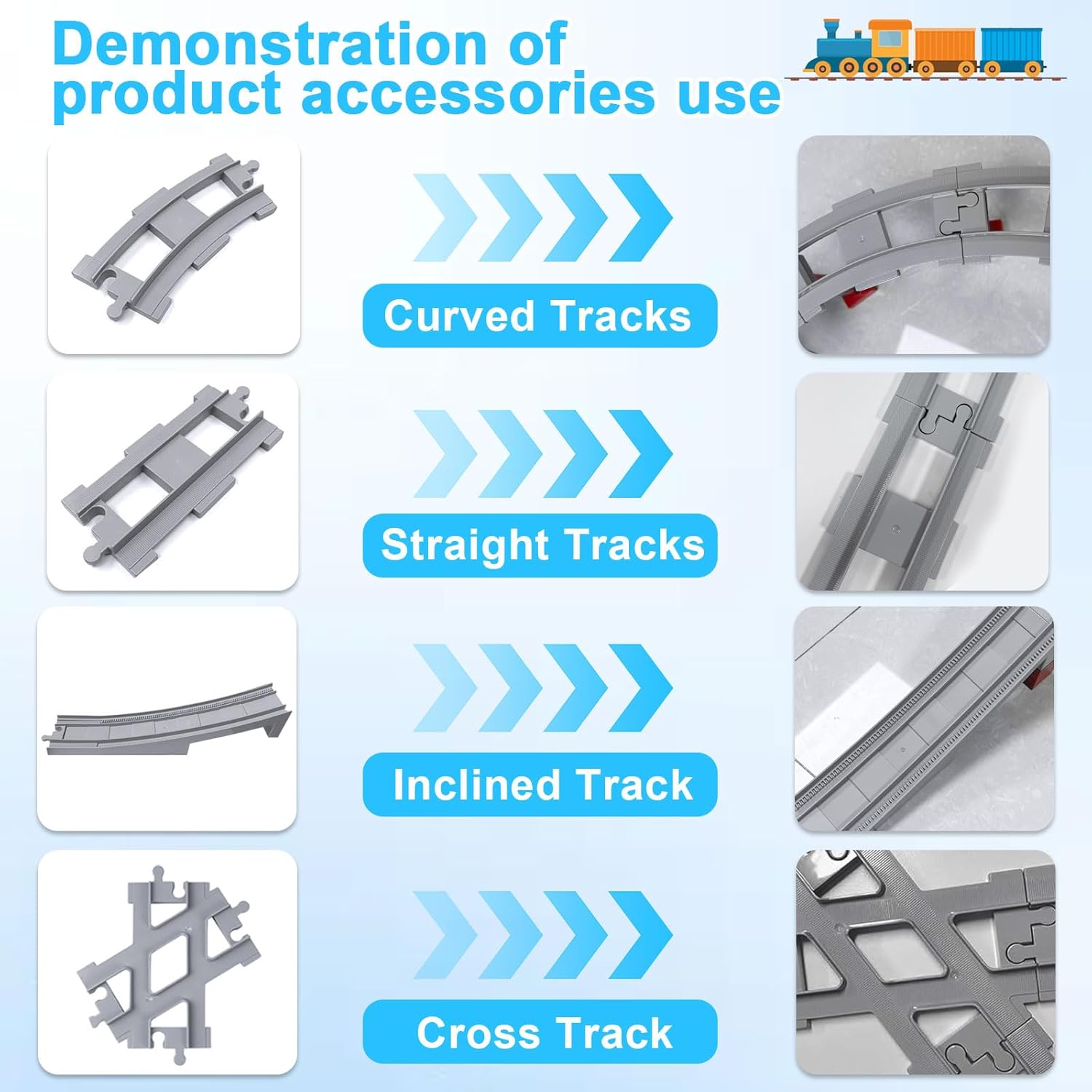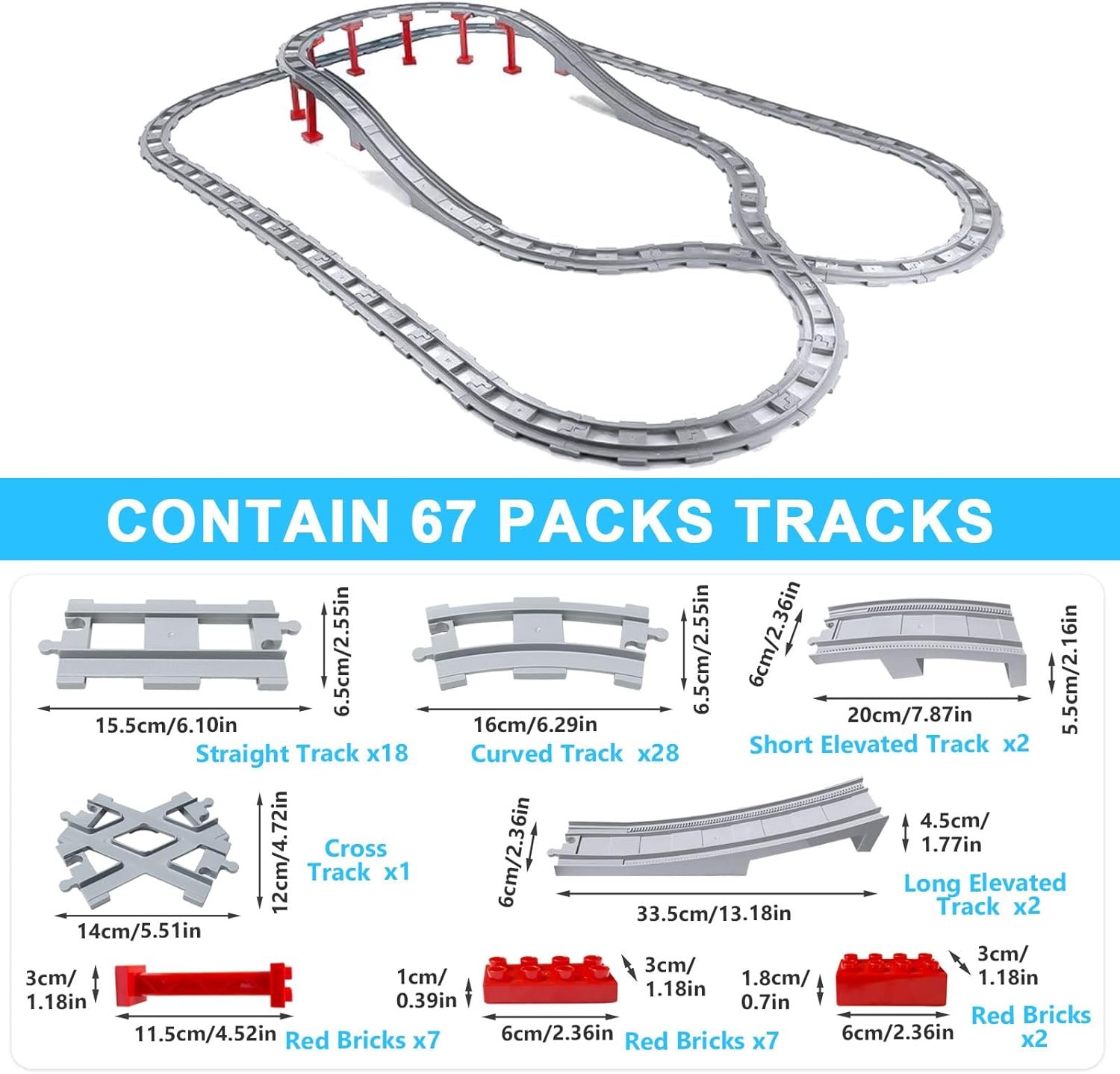 Set da 67 pezzi: i componenti per binari includono 18 binari dritti, 28 binari curvi, 1 guida incrociata, 4 binari inclinati (per ponti ferroviari) e 16 accessori per binari. Gioco avanzato: i nostri binari ferroviari estendono i set esistenti, creano piste e scenari più grandi e complessi, garantendo un divertimento senza fine. Stimola le abilità: stimola la pazienza, la concentrazione, la capacità di risoluzione dei problemi e il pensiero spaziale. I bambini progettano i binari come desiderano, stimolano l'immaginazione/creatività e migliorano le abilità pratiche durante il gioco. Materiale di alta qualità: il set di binari per ferrovia è realizzato in materiale ABS di alta qualità, durevole e sicuro per i bambini, in modo da poter giocare senza carefree e divertirsi. Regalo ideale: adatto per bambini dai 2 anni in su, perfetto per compleanni, Natale e feste per bambini. Adatto per ragazzi e ragazze, molto divertente, unisce il gioco e l'apprendimento.