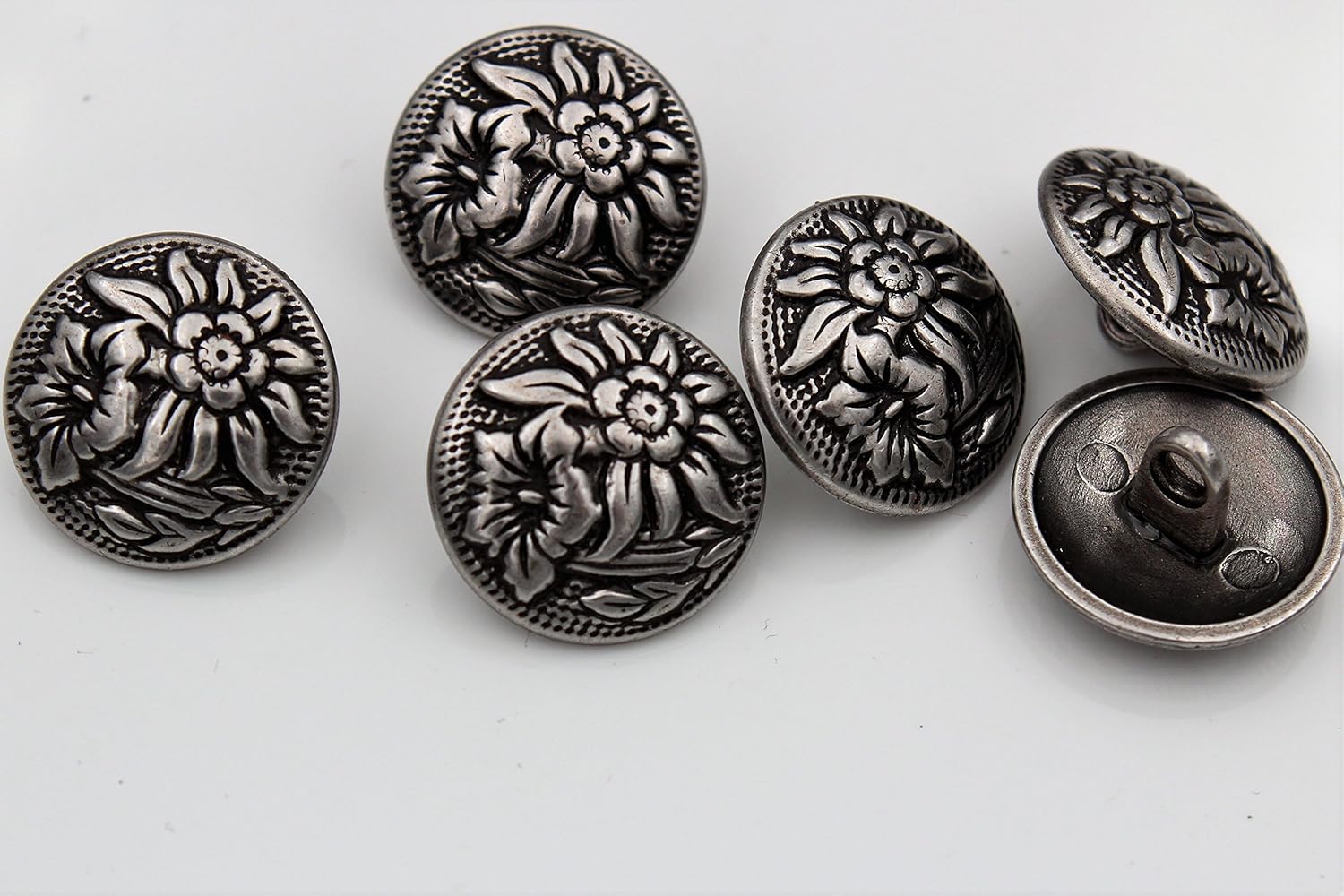 Una bella costume pulsante fiore alpenl?ndischen Pulsante di qualit?, M?tal, argento anticato, scomparti annerito Dimensioni?: circa 18?mm Contenuto della consegna?: Lotto di 6 Fabriqu? In Germania