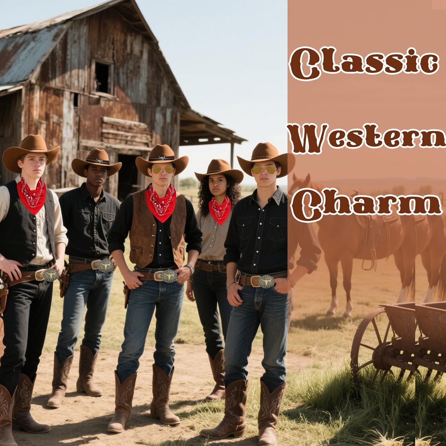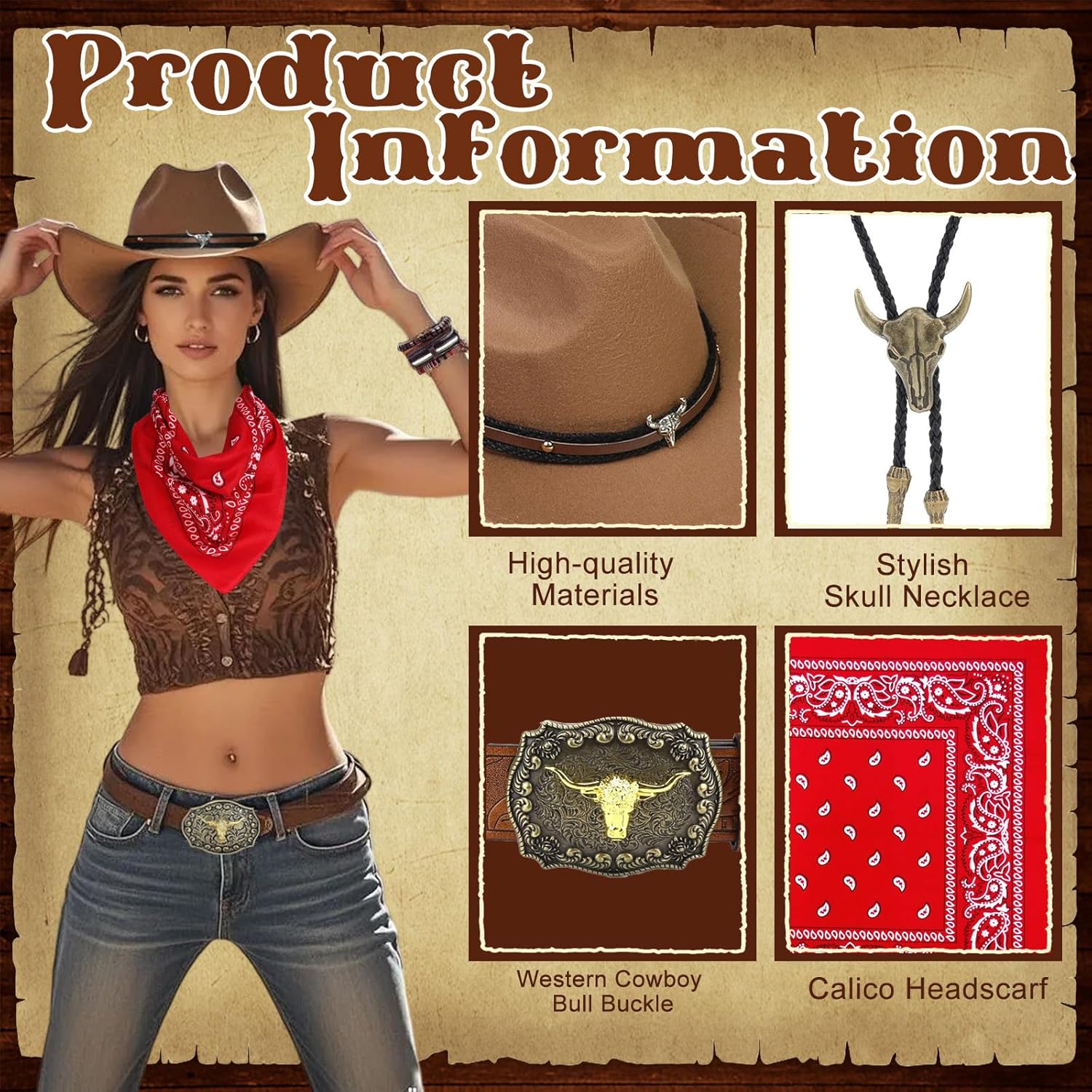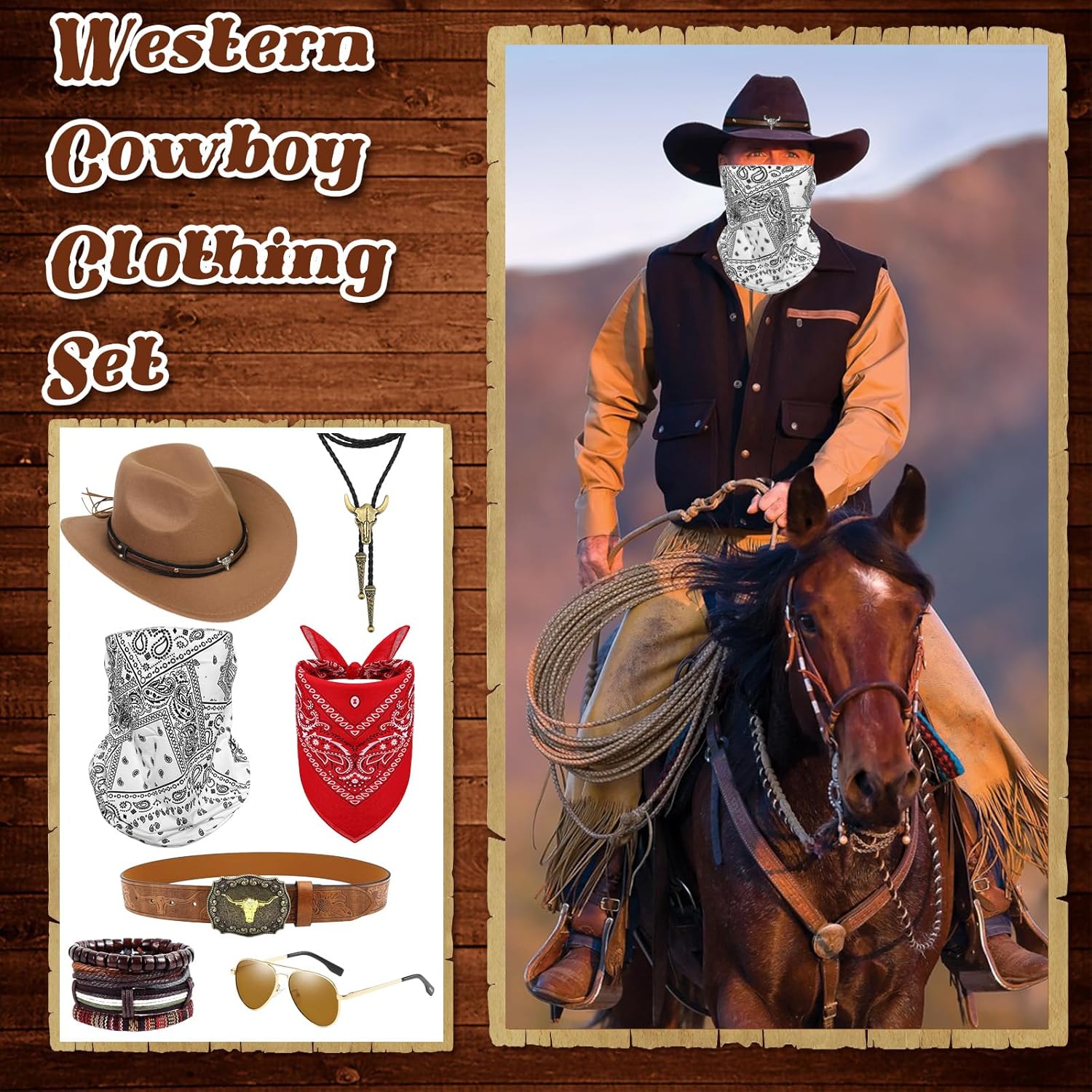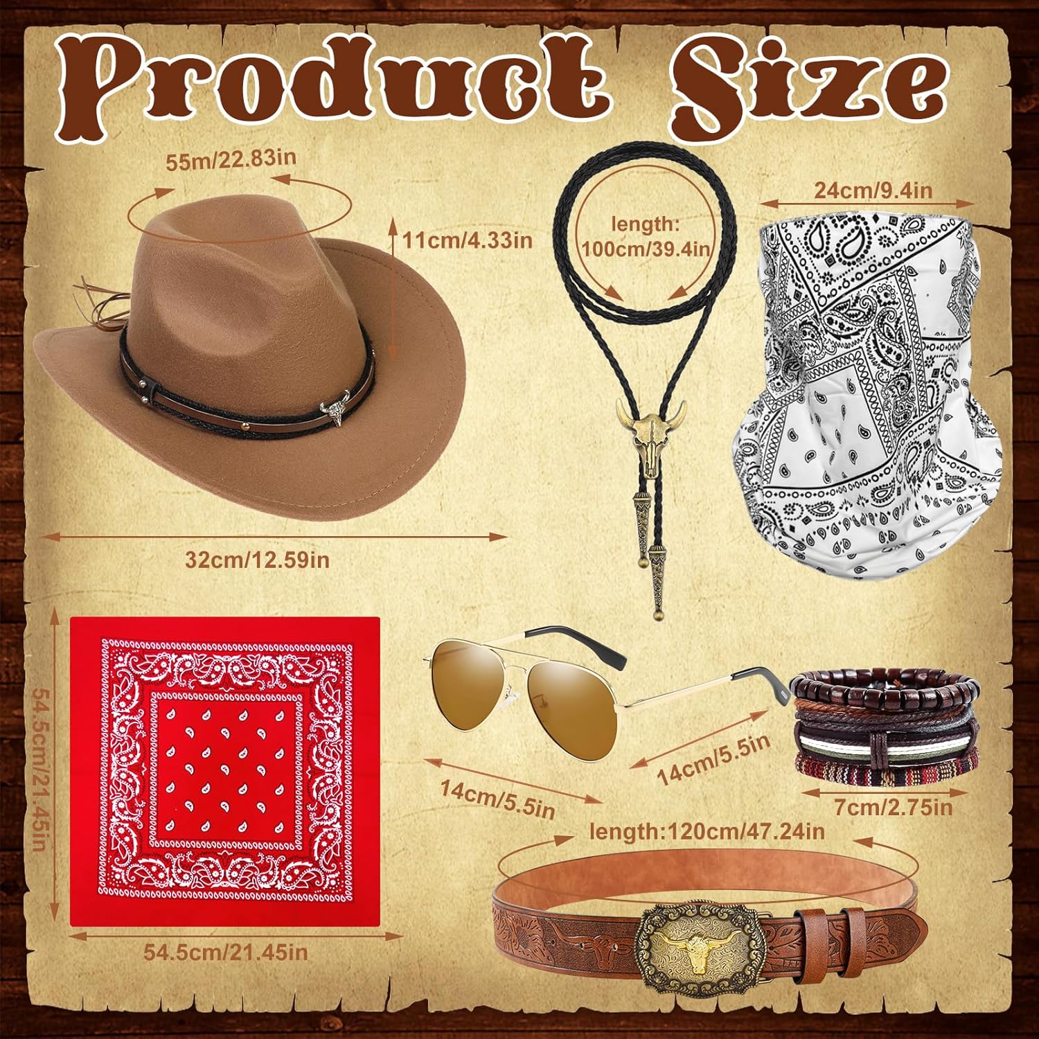 1. Per tutti coloro che amano essere attivi all'aperto o godersi le attività occidentali, questo costume non è solo divertente, ma arricchisce anche l'esperienza dell'evento. 2. Un costume da cowboy completo per cosplay ti farà immergerti nel mondo del western e divertirti senza fine. Che si tratti di una festa a tema, uno spettacolo teatrale o un servizio fotografico, questo costume offre un'esperienza di gioco di ruolo impressionante. 3. Squisito abbigliamento da cowboy occidentale rafforza la fiducia in se stessi dei tuoi clienti, li rende un'attrazione nelle attività sociali e sottolinea il loro stile personale unico. Contenuto della 1 cappello da cowboy. 1 bandana. 1 maschera stampata. 1 paio di occhiali. 1 cintura. 1 bracciale. 1 collana Bolo. Nota: * Le dimensioni sono misurate manualmente, si prega di considerare un margine di errore di 1-2 cm. * A causa delle diverse impostazioni dei monitor e della luce, potrebbe esserci una differenza di colore tra l'immagine e l'oggetto reale. Grazie per la comprensione.