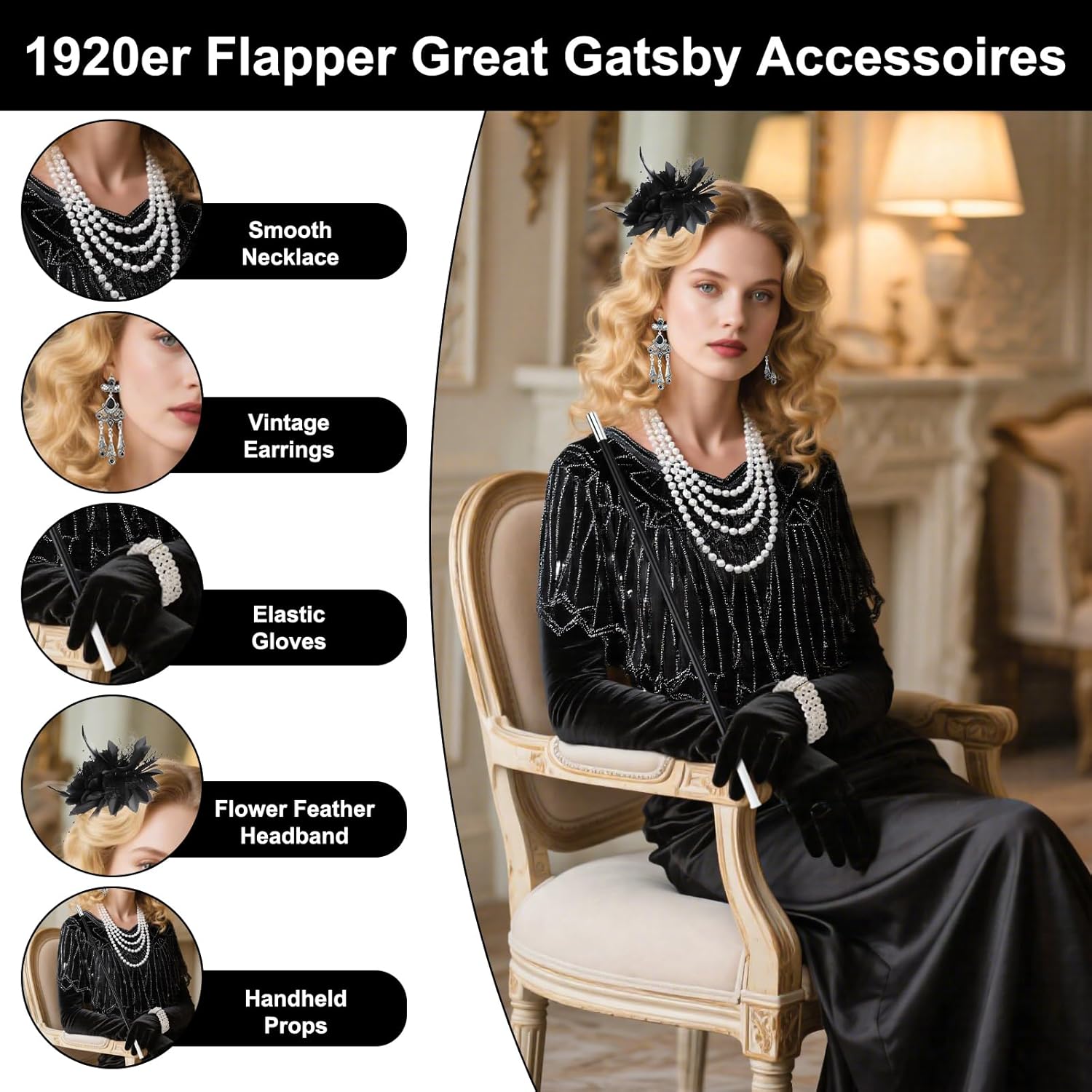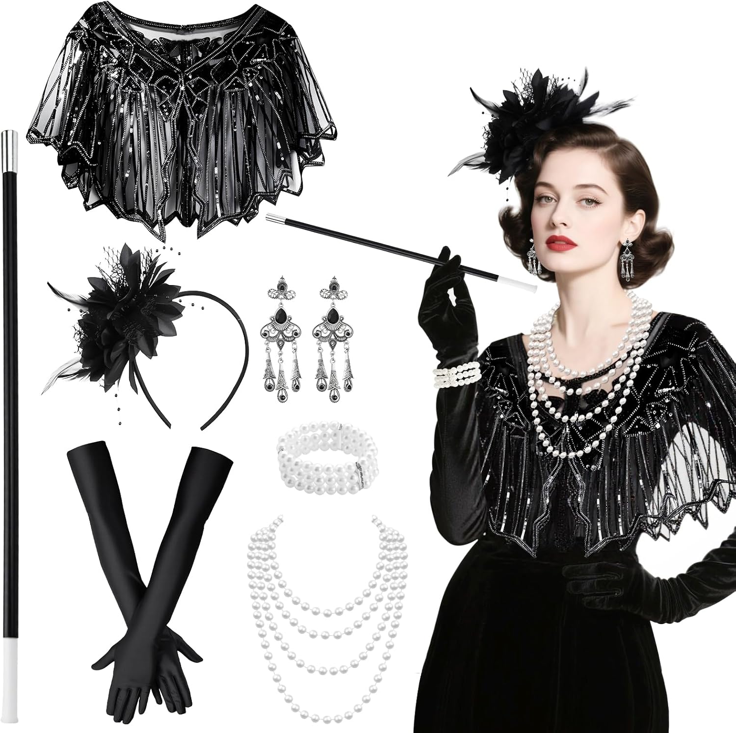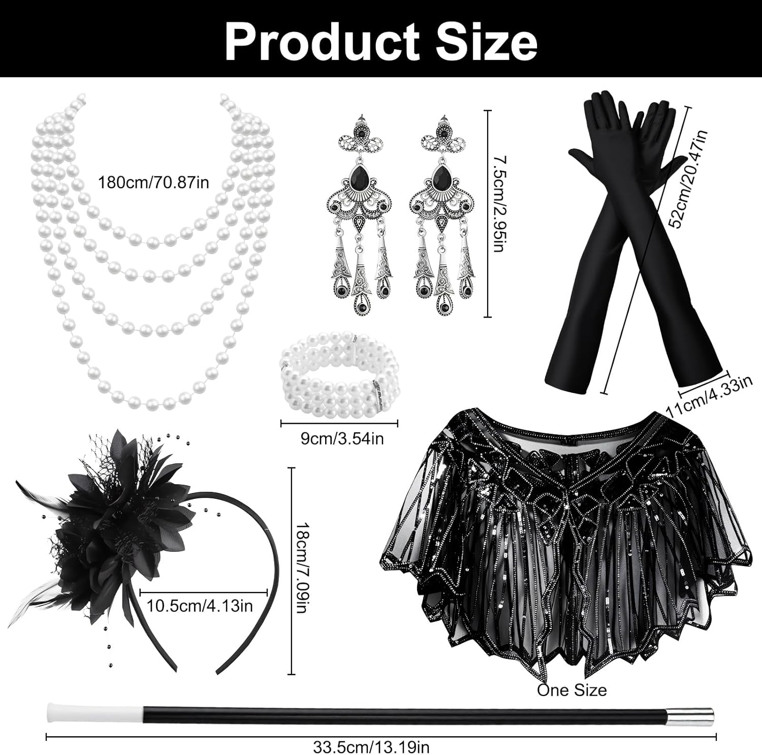 Descrizione - Questi accessori da donna in stile anni '20 sono perfetti per feste retrò, feste a tema anni '20, feste a tema anni '20, feste in maschera di Halloween, balli di fine anno e molto altro. Questo è un set completo di accessori per foto. - La fascia floreale vintage si adatta alla maggior parte delle adolescenti e degli adulti e completa perfettamente il tuo look da pin-up anni '20. Gli eleganti orecchini e la scintillante collana di perle ti regalano un look splendido e accattivante. Caratteristiche Marca: TOPBELIEF Materiale dei guanti: Spandex Materiale della fascia: Plastica e piume Materiale del mantello: Poliestere Colore: Multicolore La confezione include: 1 x Guanti 1 x Fascia 1 x Collana 1 x Orecchini 1 x Bracciale 1 x Manipolo 1 x Mantello