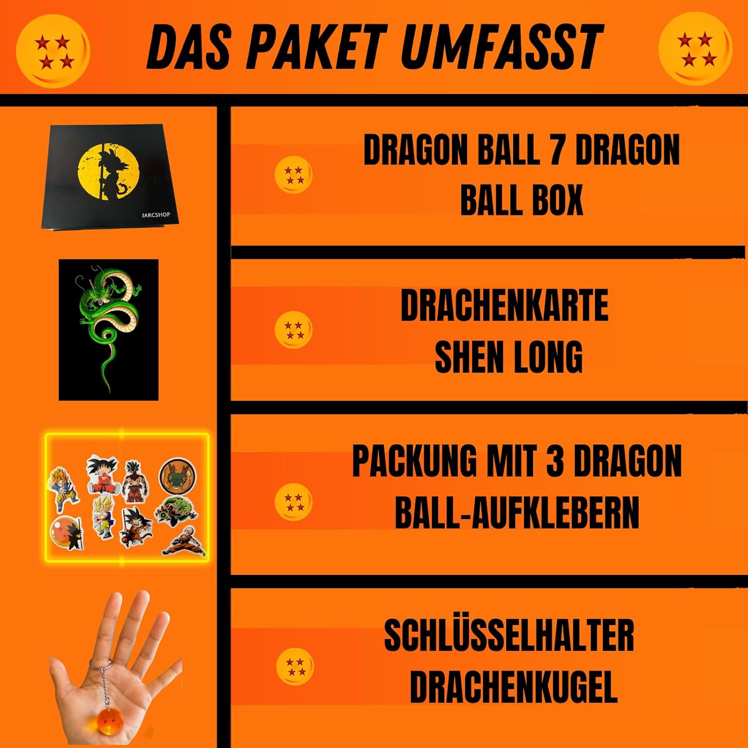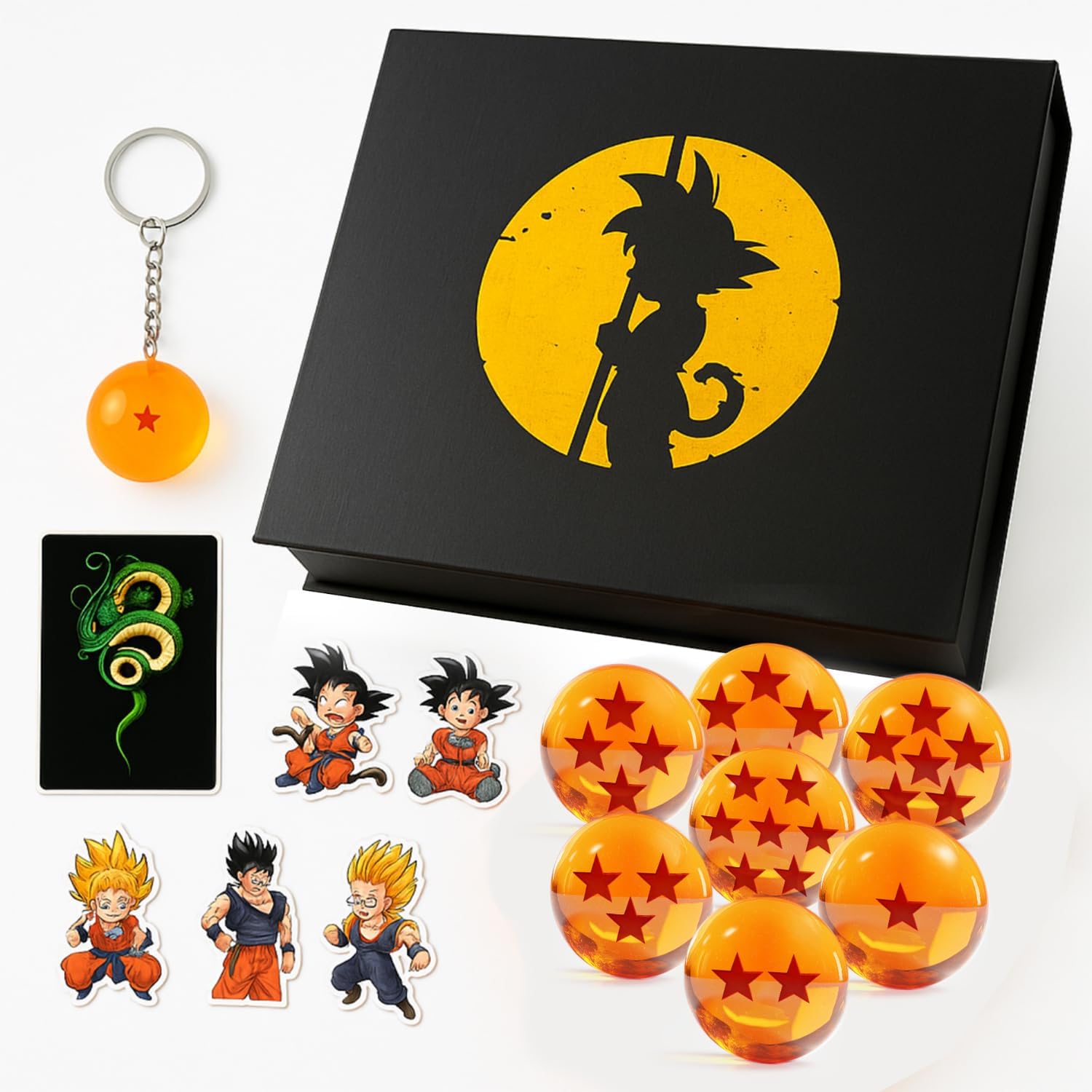 [SET COMPLETO DI 7 SFERE DEL DRAGO] Possiedi tutte le palle leggendarie per evocare il drago Shenlong e realizzare i tuoi desideri. [DESIGN ESCLUSIVO E DETTAGLIATO] Ogni palla è realizzata con cura per catturare l'essenza dell'universo di Dragon Ball. [LAVORAZIONE DI ALTA QUALITÀ] Realizzato in acrilico traslucido di alta qualità per uno scintillio abbagliante. [IMBALLAGGIO SICURO ED ELEGANTE] Le Sfere del Drago vengono fornite in una scatola protettiva per mantenerle al sicuro e organizzate. [IL CONTENUTO DELLA CONFEZIONE] 7 Sfere del Drago acriliche (da 1 a 7 stelle), una scatola da esposizione, un portachiavi Dragon Ball con stelle casuali, una carta di evocazione Shenlong e adesivi Dragon Ball.