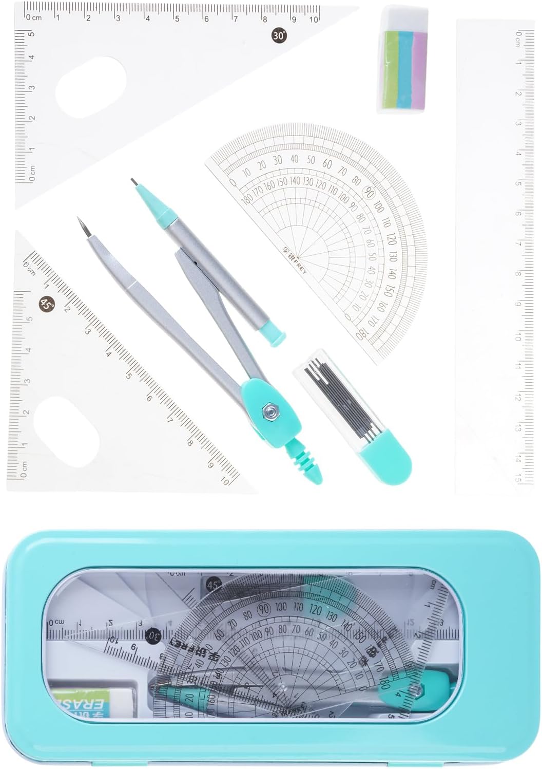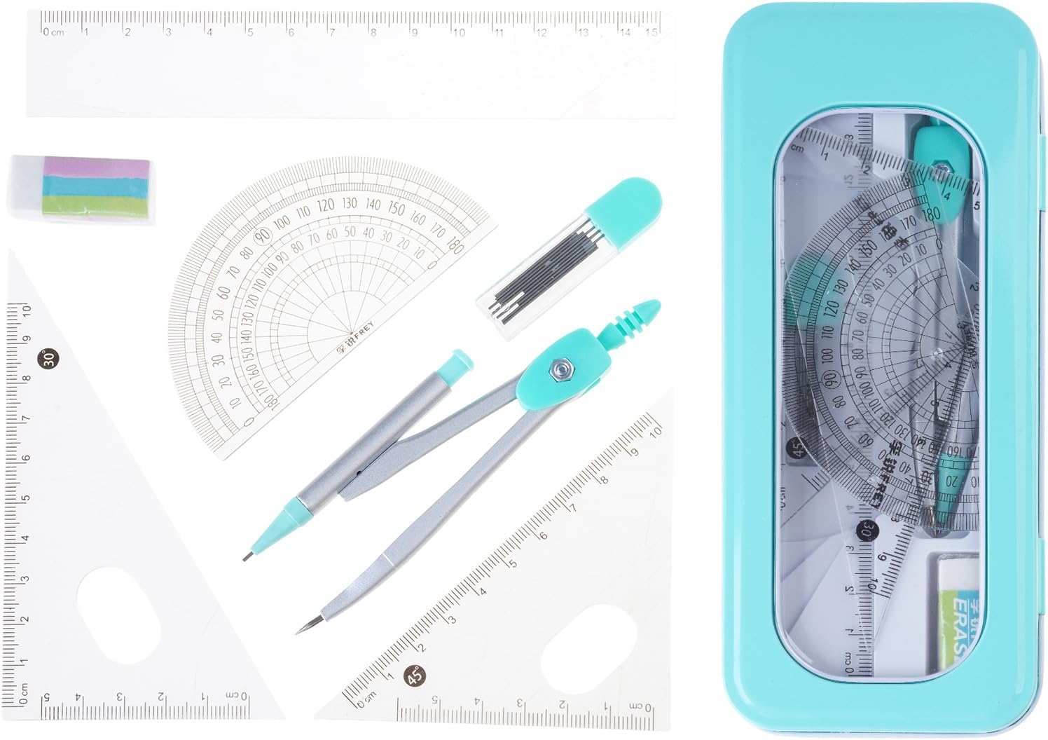 La confezione contiene: 1 strumento per geometria in metallo, 1 quadrato da 30°/60°, 1 quadrato a 45°, 1 righello dritto, 1 goniometro matematico a 180 gradi, 1 scatola di ricariche per matite da 0,7 mm, 1 gomma da cancellare, 1 custodia Lo strumento di disegno geometrico in metallo può disegnare fino a 23 cm di diametro. Lo strumento di geometria con parte bruscamente deve essere usato con attenzione e posizionato lontano dal bambino Realizzato in polipropilene e metallo, facile misurazione. Ogni righello quadrato e goniometro matematico con scala chiara. La custodia per proteggere e riporre gli strumenti geometrici in zaini, borse per la scuola, borsa per libri Set di strumenti professionali per geometria matematica, adatto per architetti, ingegneri, artisti, designer, studenti, insegnanti Ideale per matematica, geometria, arte, disegno, lavorazione del legno e disegno. Facile da portare a lezioni di matematica e conservare in classe