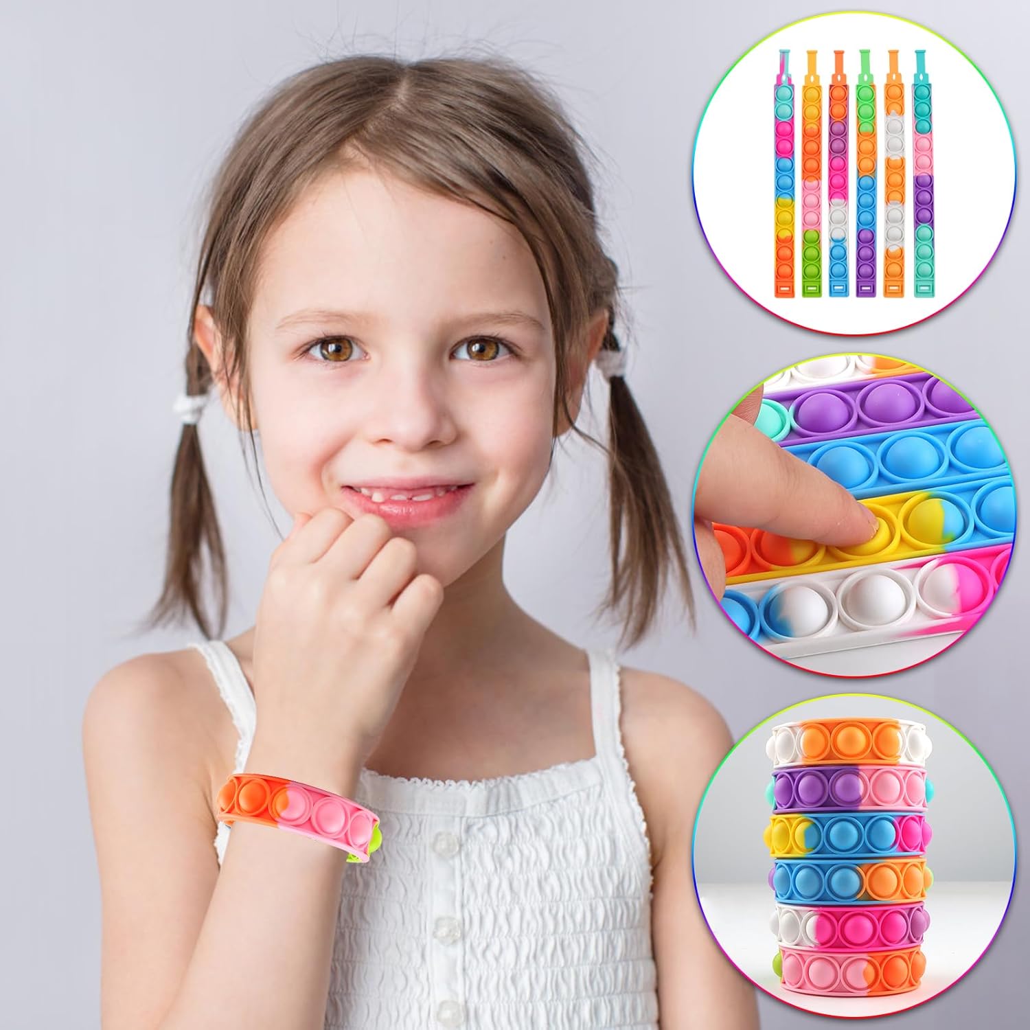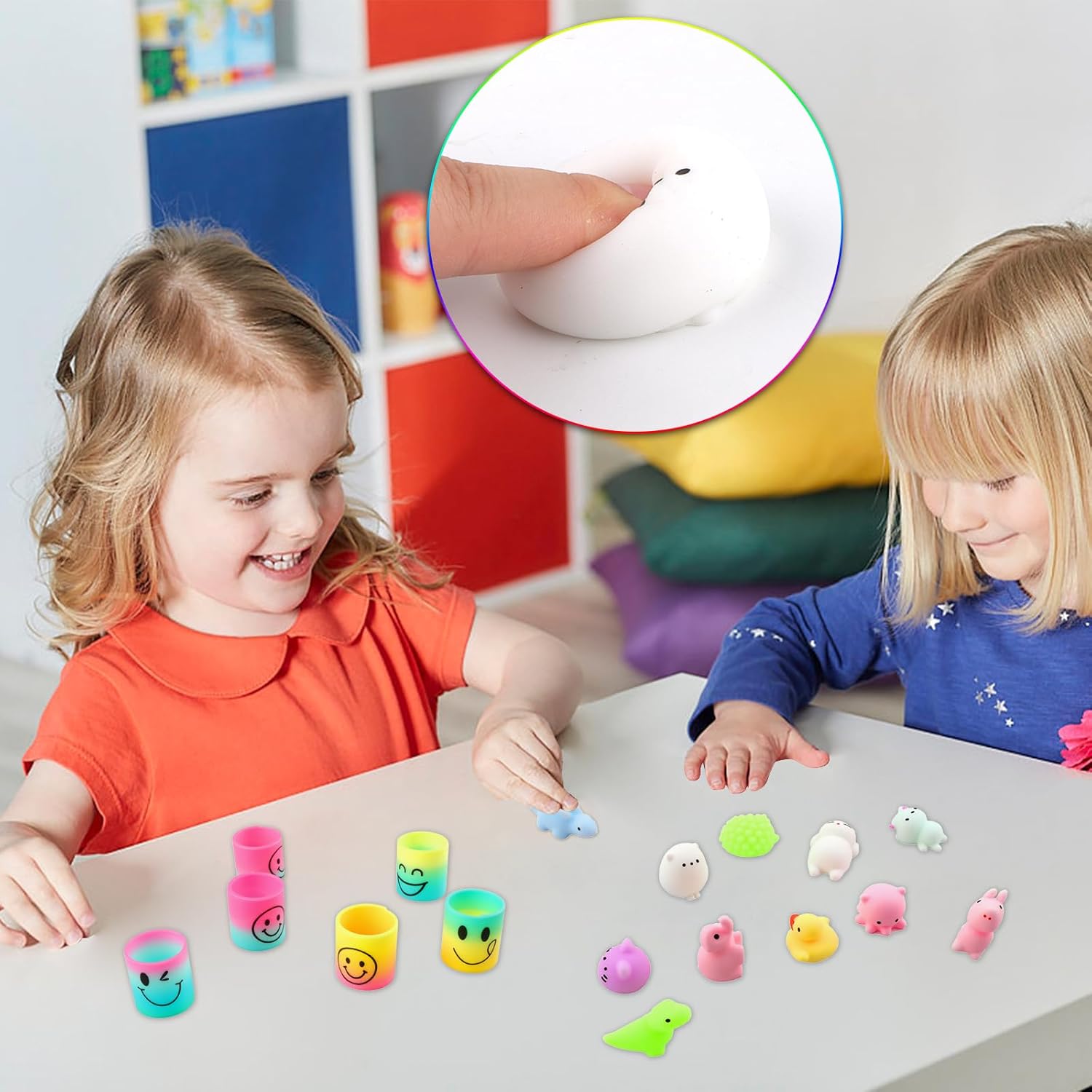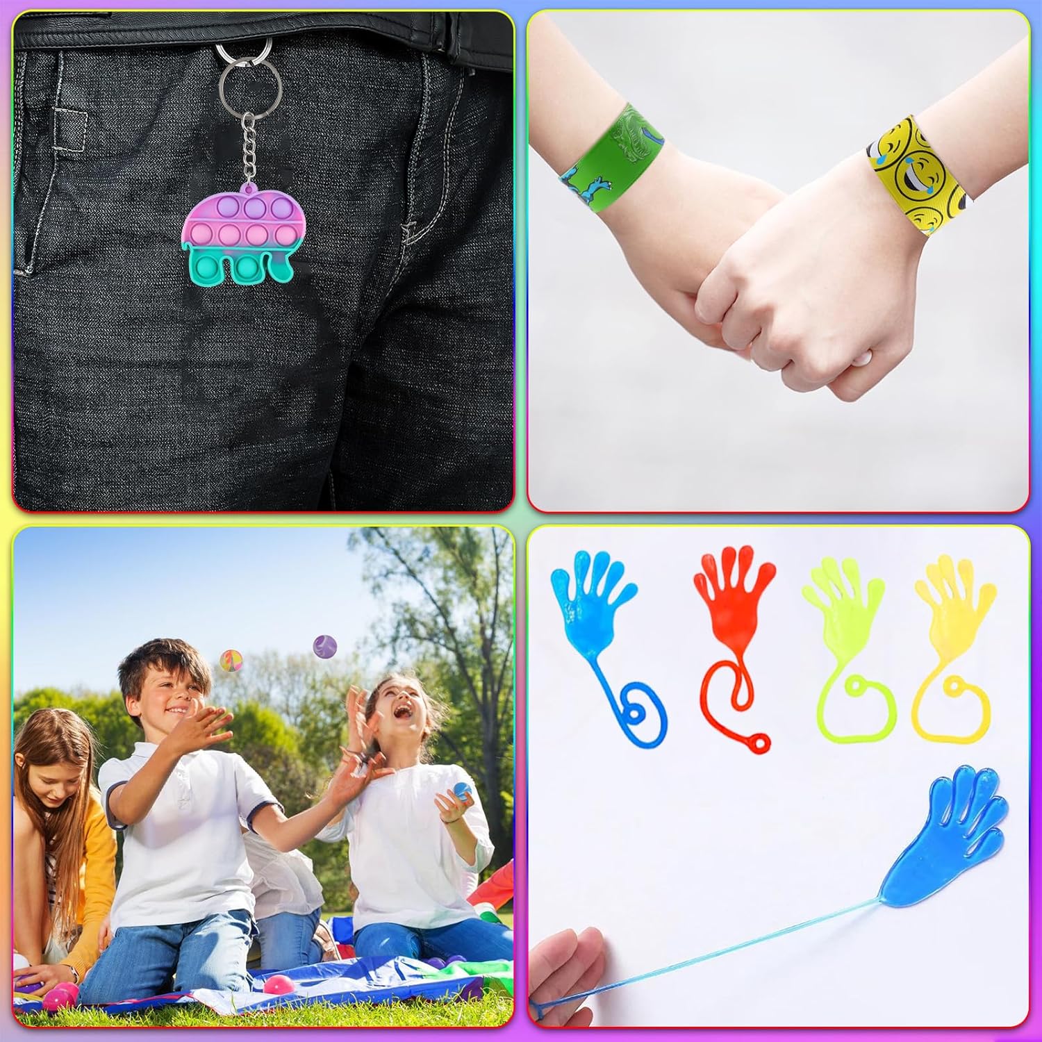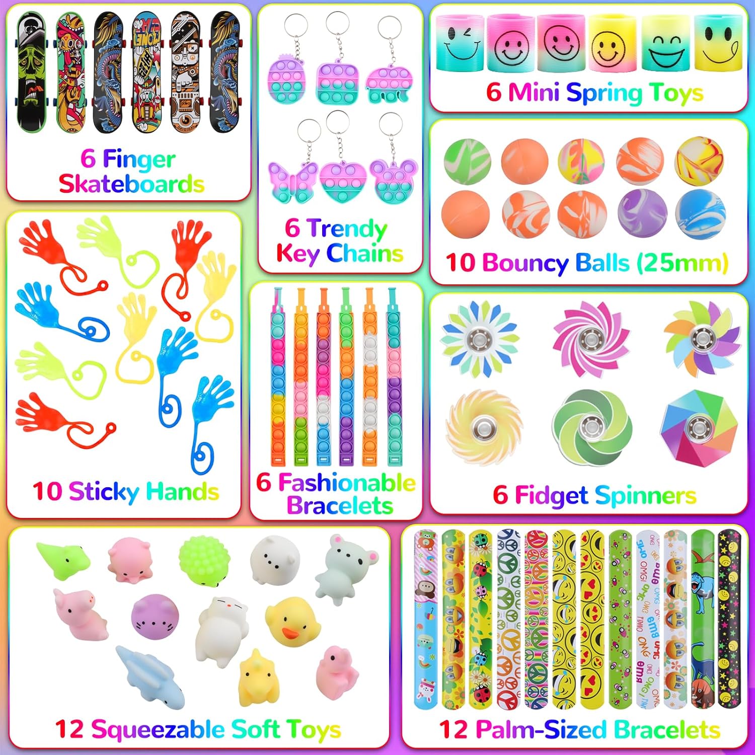 【74 PEZZI DI DIVERTIMENTO PER FESTE】: Il set di regalini per feste di compleanno per bambini contiene 74 articoli a sorpresa colorati: 12 giocattoli di plastilina, 12 braccialetti clap, 6 portachiavi alla moda, 6 finger spinner, 6 braccialetti alla moda, 6 finger skateboard, 6 giocattoli a molla, 10 clap, 10 palline rimbalzanti. Ideale come regalo per gli ospiti alle feste di compleanno dei bambini o come bomboniera per arricchire ogni festa. 【NOVE TIPI DI GIOCATTOLI PER DIVERTIRSI】: dal set di giocattoli antistress allo skateboard da dito, il nostro set offre varietà per ogni fascia d'età. I deliziosi design, dall'unicorno al dinosauro al gatto, piacciono sia alle bambine che ai bambini, ideali come regali per feste di compleanno per bambini con un alto valore di riconoscimento. 【RIDUZIONE DELLO STRESS E SENSIBILITÀ ALLE DITA】: i fidget toys inclusi, come spinner e mini molle, aiutano i bambini a rilassarsi e a concentrarsi. Inoltre, favoriscono le capacità motorie fini e la concentrazione, perfetti come regali per le feste di compleanno dei bambini nelle scuole, negli asili o nei gruppi di bambini. 【GRAZIOSI PREMI SCOLASTICI O DI GARA】: piccoli premi come braccialetti clap, squishies e portachiavi adesivi rendono questo set il premio perfetto per la routine scolastica o un set di regali di compleanno per bambini di successo. Motivare senza grandi sforzi! 【VERSATILE】: Che si tratti di regali per feste di compleanno per bambini, piccoli doni nei calendari dell'Avvento, regali nella scatola dei tesori all'asilo o divertenti pensierini per feste di compleanno per bambini, questo set di regali per feste di compleanno per bambini offre una varietà colorata per ogni festa.