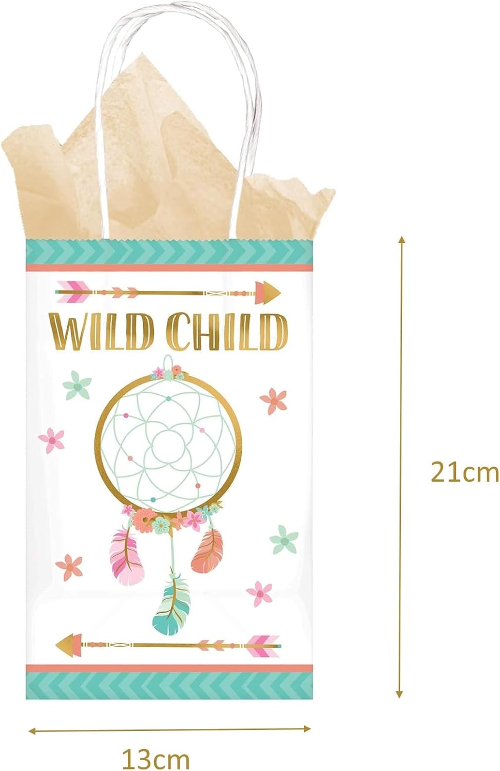 🌸 Sacchetti regalo Boho-Chic: immergiti nel magico mondo dello stile boho con il nostro incantevole set di 8 sacchetti regalo in carta! Ogni borsa misura 21x13x8 cm e offre spazio sufficiente per regali, bomboniere o piccoli tesori. Le borse sono stampate su entrambi i lati con un vivace design boho che ispira l'immaginazione. 🌟 Spirito libero dorato: la scritta dorata "Wild Child" è decorata nella parte superiore delle borse, che cattura perfettamente lo spirito avventuroso e lo spirito libero di ogni bambina. Questo accento dorato dona alle borse un tocco di eleganza e glamour che le rende particolarmente accattivanti. 🌺 Acchiappasogni colorato: Al centro di ogni borsa c'è un acchiappasogni colorato che attira l'attenzione e stimola la fantasia. Gli acchiappasogni colorati sono un simbolo di protezione ed energia positiva e donano alle borse un affascinante tocco boho. 🌈 Delicato splendore floreale: circondati da delicati fiori in colori pastello come rosa, verde e rosso, i sacchetti regalo irradiano un'atmosfera delicata e rilassante. Questi giocosi motivi floreali conferiscono alle borse un tocco romantico e le rendono una bella attrazione su ogni tavola di compleanno o di festa. 🎉 Usi versatili: questi sacchetti regalo non sono ideali solo per le bomboniere delle feste di compleanno delle ragazze, ma sono adatti anche per altre occasioni come baby shower, matrimoni, riunioni di ragazze o altre celebrazioni speciali. Sono un modo affascinante per esprimere il tuo amore e apprezzamento e portare gioia ai tuoi ospiti. 🎁Fornitura: 8 sacchetti regalo, sacchetti regalo, sacchetti regalo per dolci, sacchetti regalo, bomboniere, regali per bambini per i compleanni dei bambini, in carta kraft.
