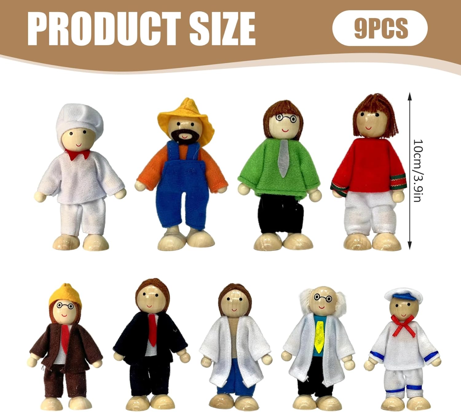 Ruoli familiari realistici: include 9 piccole bambole familiari che rappresentano diverse professioni, migliorando il gioco fantasioso e la narrazione per i bambini. Valore di gioco educativo: incoraggia il gioco di ruolo e lo sviluppo delle abilità sociali introducendo vari ruoli professionali in modo divertente e interattivo. Dimensioni perfette della casa delle bambole: compatta e leggera, ideale per decorare case delle bambole standard e facile da maneggiare da parte dei bambini. Design stabile in legno: realizzate in legno robusto con giunti mobili, queste bambole offrono un uso duraturo e opzioni di posa flessibili. Sicuro e adatto ai bambini: realizzato con materiali atossici e finiture lisce, garantisce un gioco sicuro per i bambini e promuove la creatività.